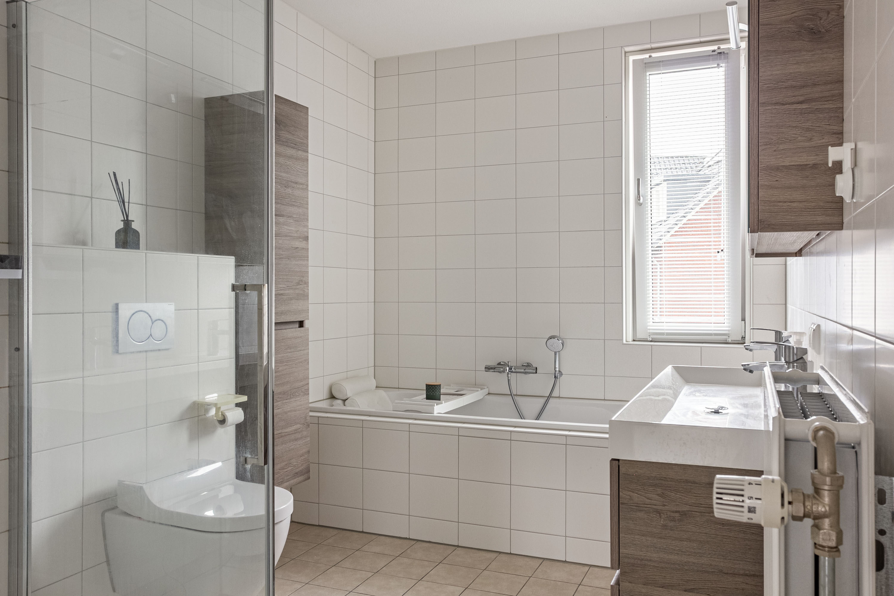 Op deze verdieping bevinden zich drie volwaardige slaapkamers (ca. 15,3 m², 14,8 m² en 8,6 m²), ideaal voor een gezin of voor het combineren van wonen en thuiswerken. De badkamer is verzorgd afgewerkt in een lichte kleurstelling en beschikt over een ligbad, aparte douche, wastafelmeubel en tweede toilet.
