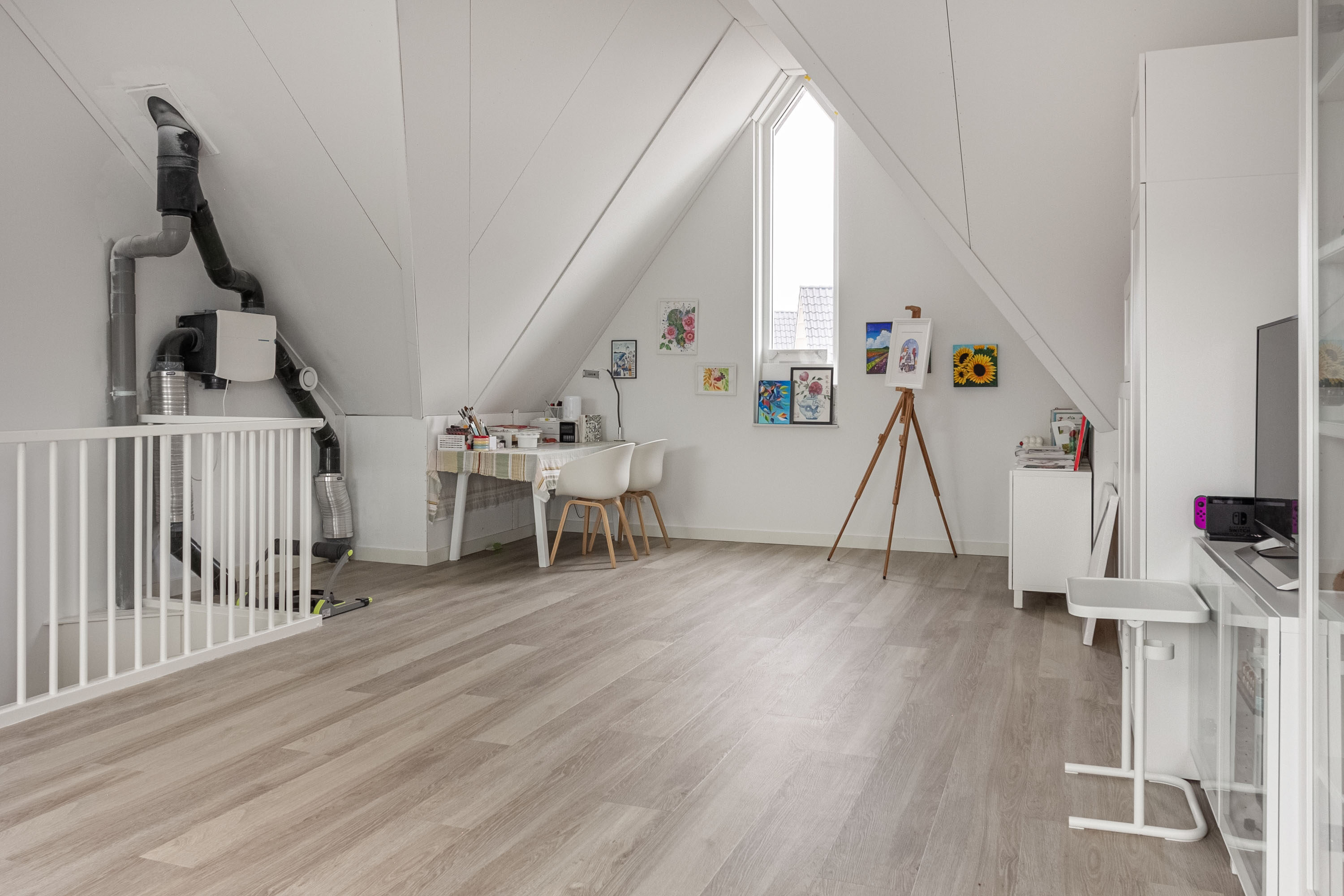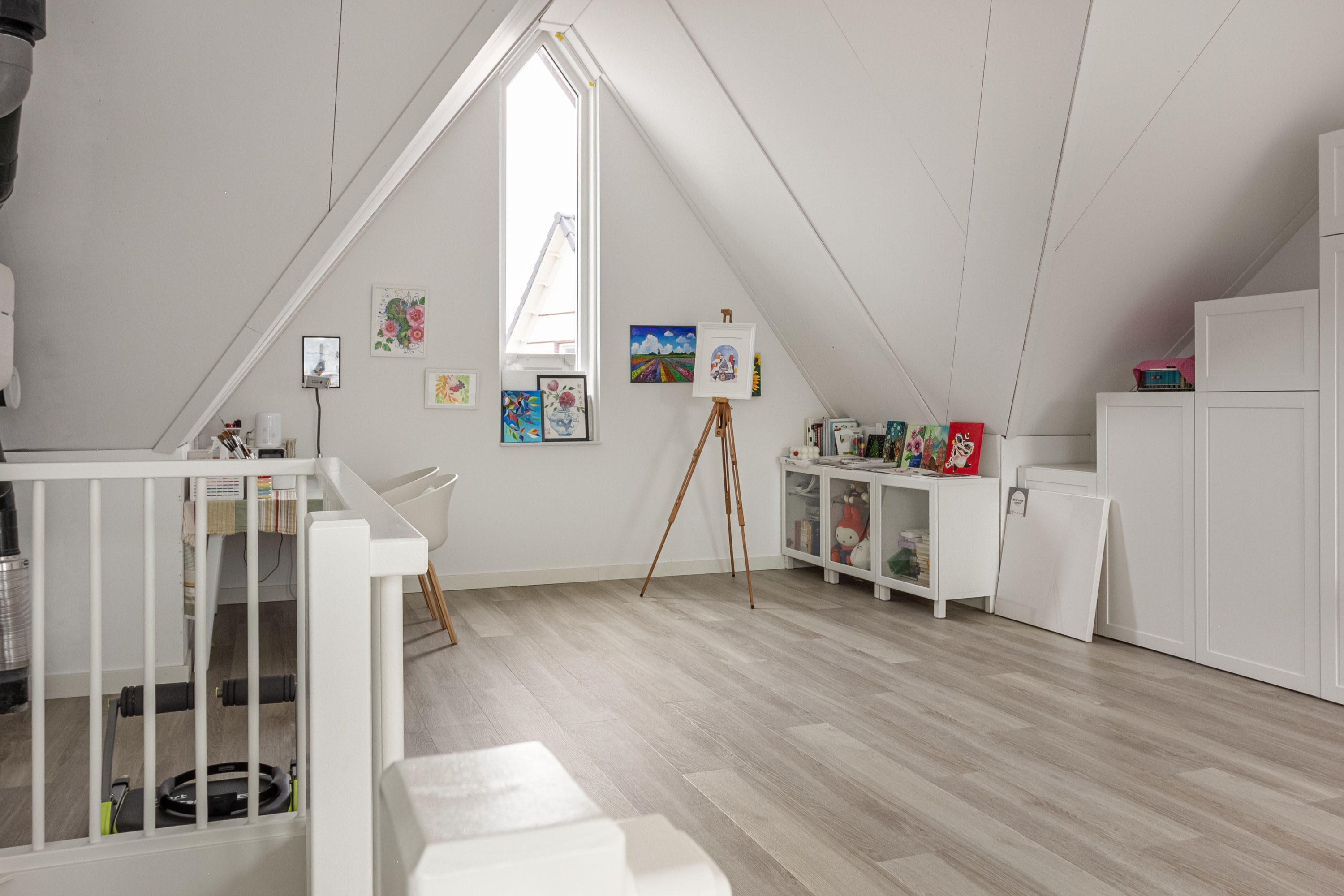 De tweede verdieping is een echte verrassing: een fraaie, ruime en multifunctionele ruimte met veel lichtinval, ideaal als master bedroom, studio of hobbyruimte. Hier bevinden zich tevens de wasmachineaansluiting en extra opbergmogelijkheden.