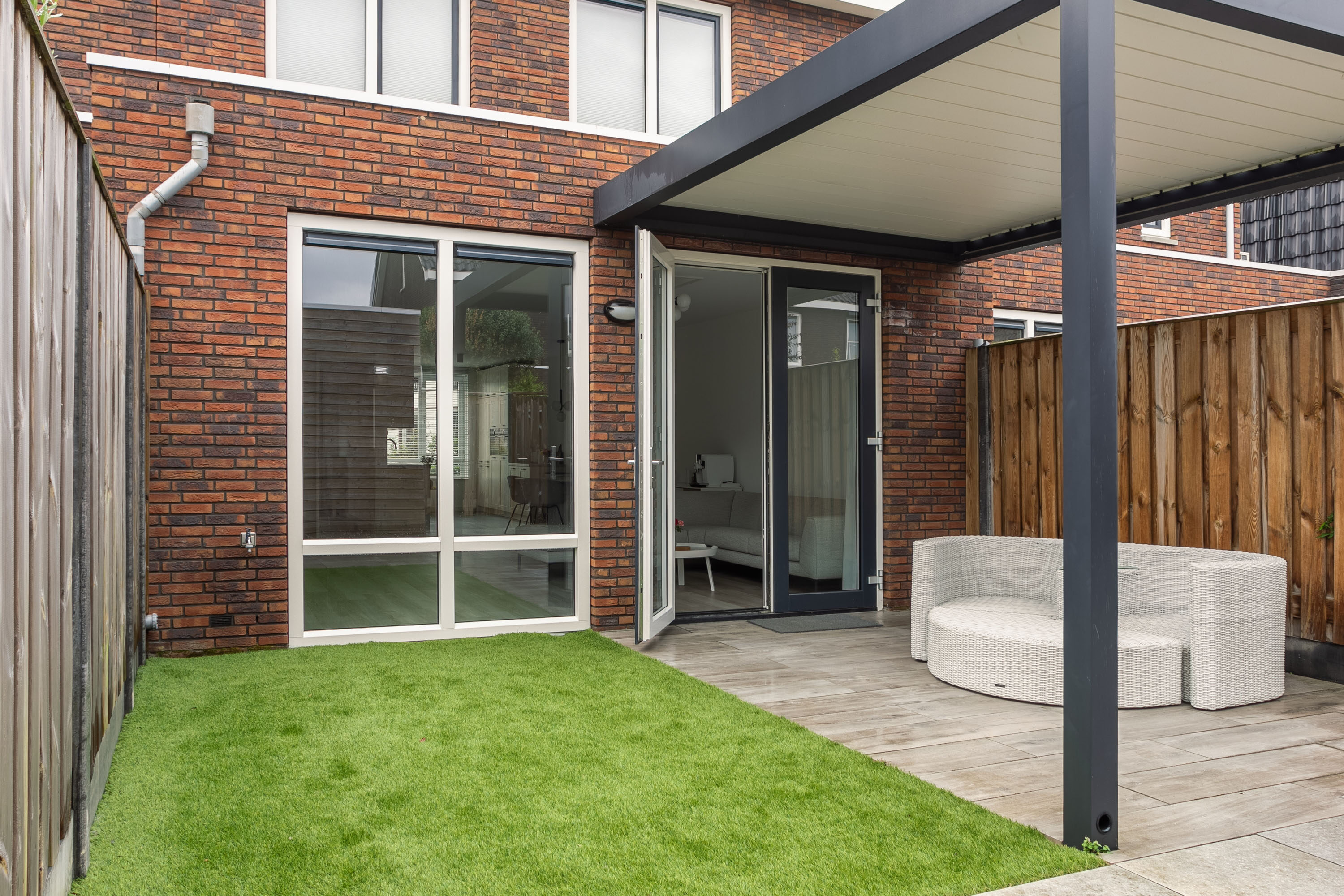 De tuin is gelegen op het oosten en beschikt over een fraaie overkapping en een praktische berging, perfect voor fietsen of tuinspullen. Dankzij de ligging en het formaat is dit een fijne plek om in de ochtendzon te genieten van je koffie of in de middag tot rust te komen.