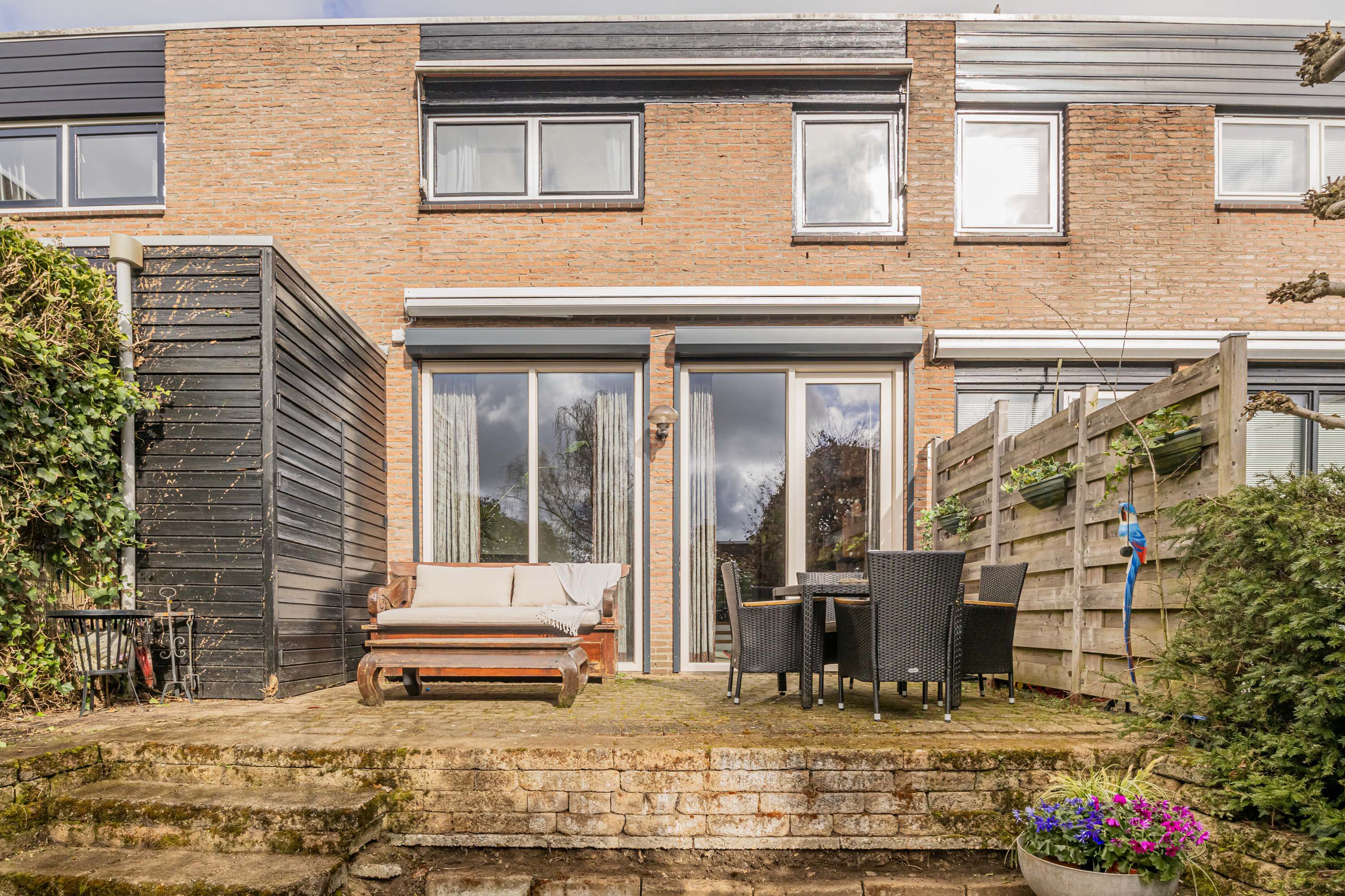De fijne achtertuin (met hoogteverschil) ligt op het zuidoosten en hier kun je heerlijk genieten van de zon en het buitenleven. Ook is er een achterom vanaf de Heideweg. Aan de voorzijde zijn twee bergingen. In de eerste bevinden zich o.a. de meterkast, Cv-ketel, omvormers en thuisbatterij. De andere berging (geplaatst in 2023) is ideaal als fietsenstalling.