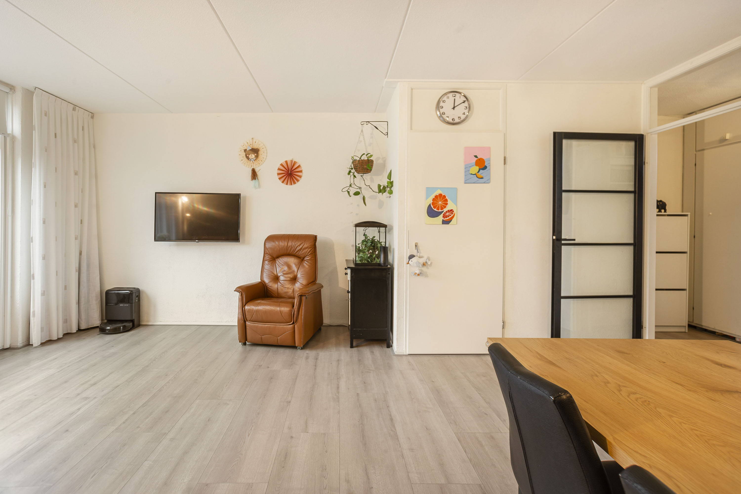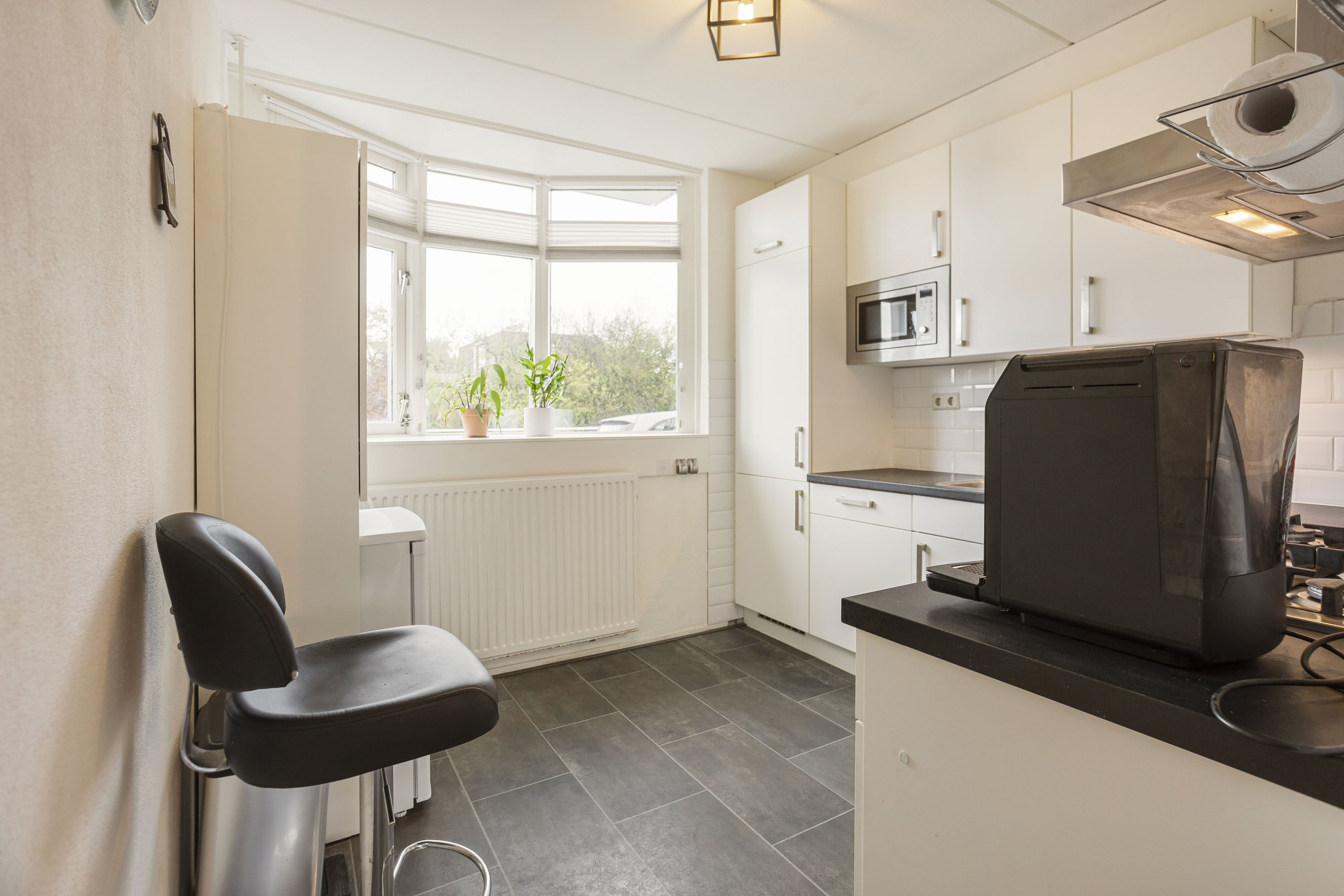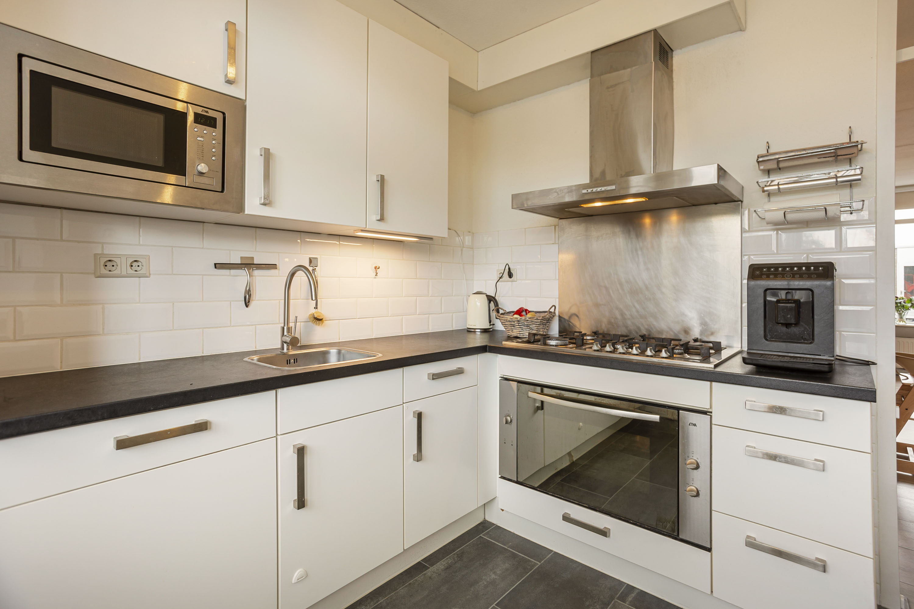 Entree met vernieuwd toilet en meterkast. Vanuit de hal toegang tot de woonkamer en keuken. De royale woonkamer van circa 30 m² heeft grote raampartijen die zorgen voor veel daglicht en een prettige sfeer. De moderne keuken in hoekopstelling is voorzien van diverse inbouwapparatuur, waaronder een koel-/vriescombinatie, gasfornuis, oven, magnetron, afzuigkap en vaatwasser.