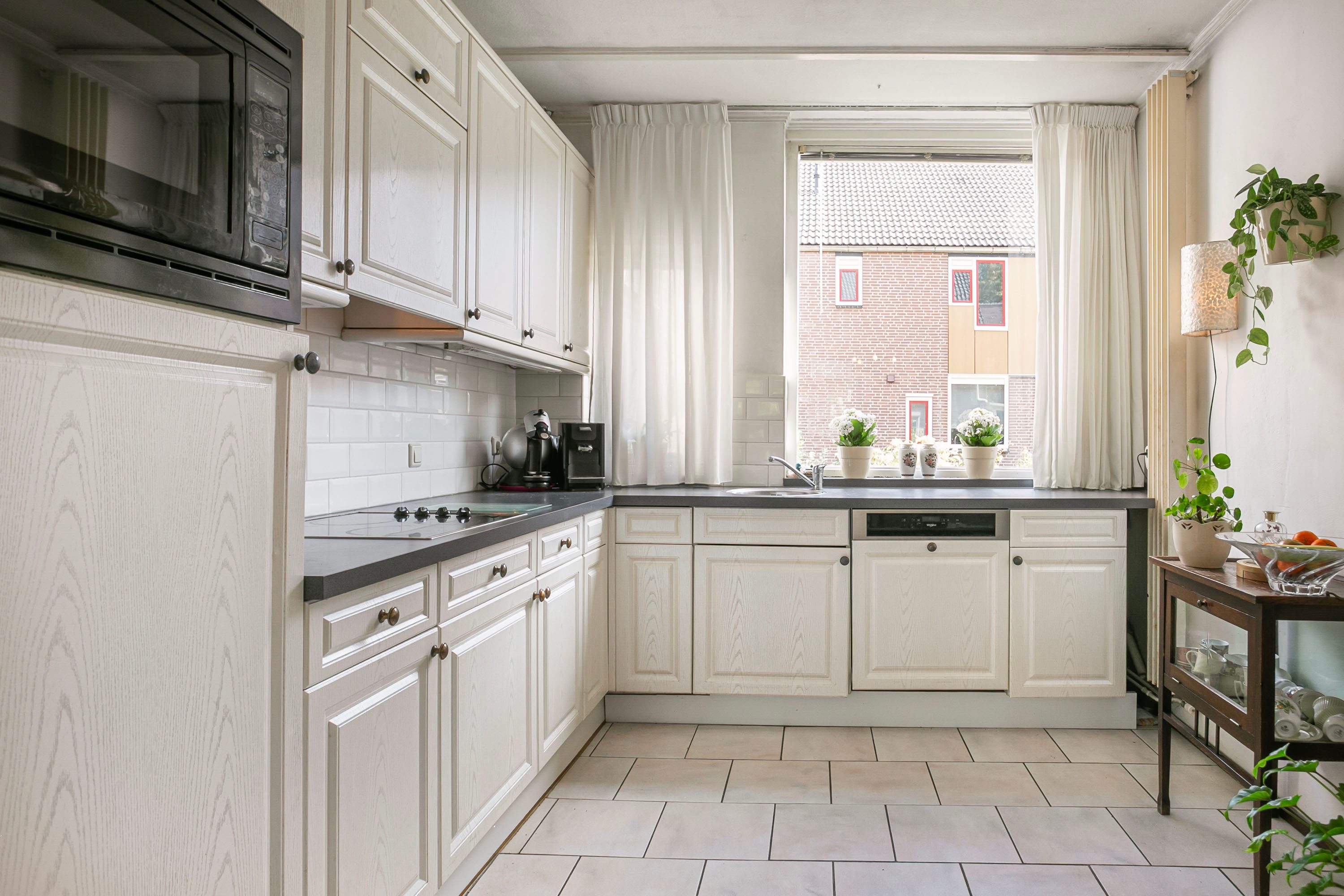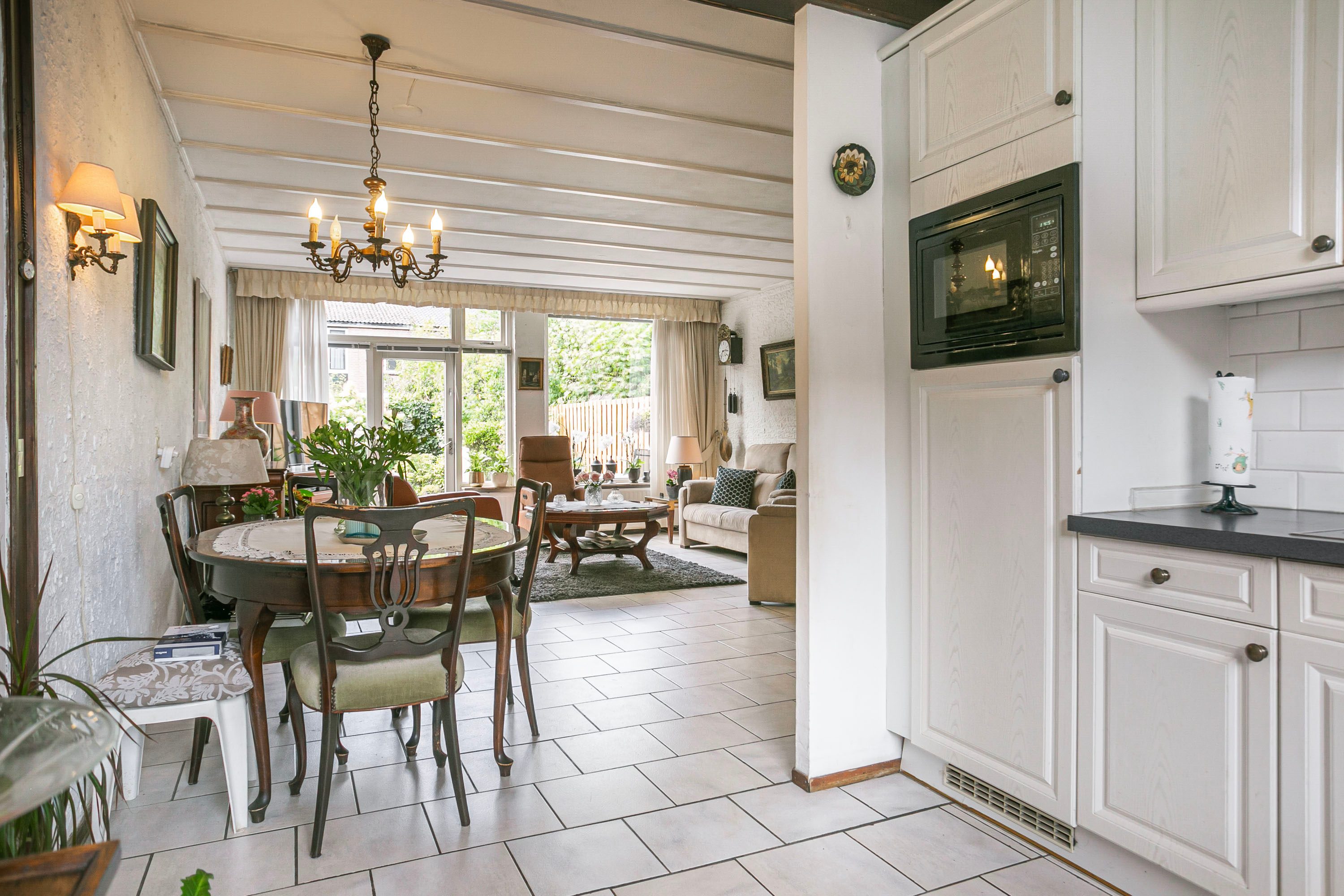 Via de entree met hal en meterkast bereik je de woning. De tuingerichte woonkamer is voorzien van een fijn natuurlijk lichtinval door de aanwezige raampartij, een plavuizenvloer en circa 31m² groot. In de doorloop naar de keuken is ruimte voor een eettafel. De open keuken is opgesteld in een lichte kleurstelling met hoekkeuken. De keuken is voorzien van diverse inbouwapparatuur, te weten: een kookplaat, afzuigkap, oven, koel-/vriescombinatie en een vaatwasser.
