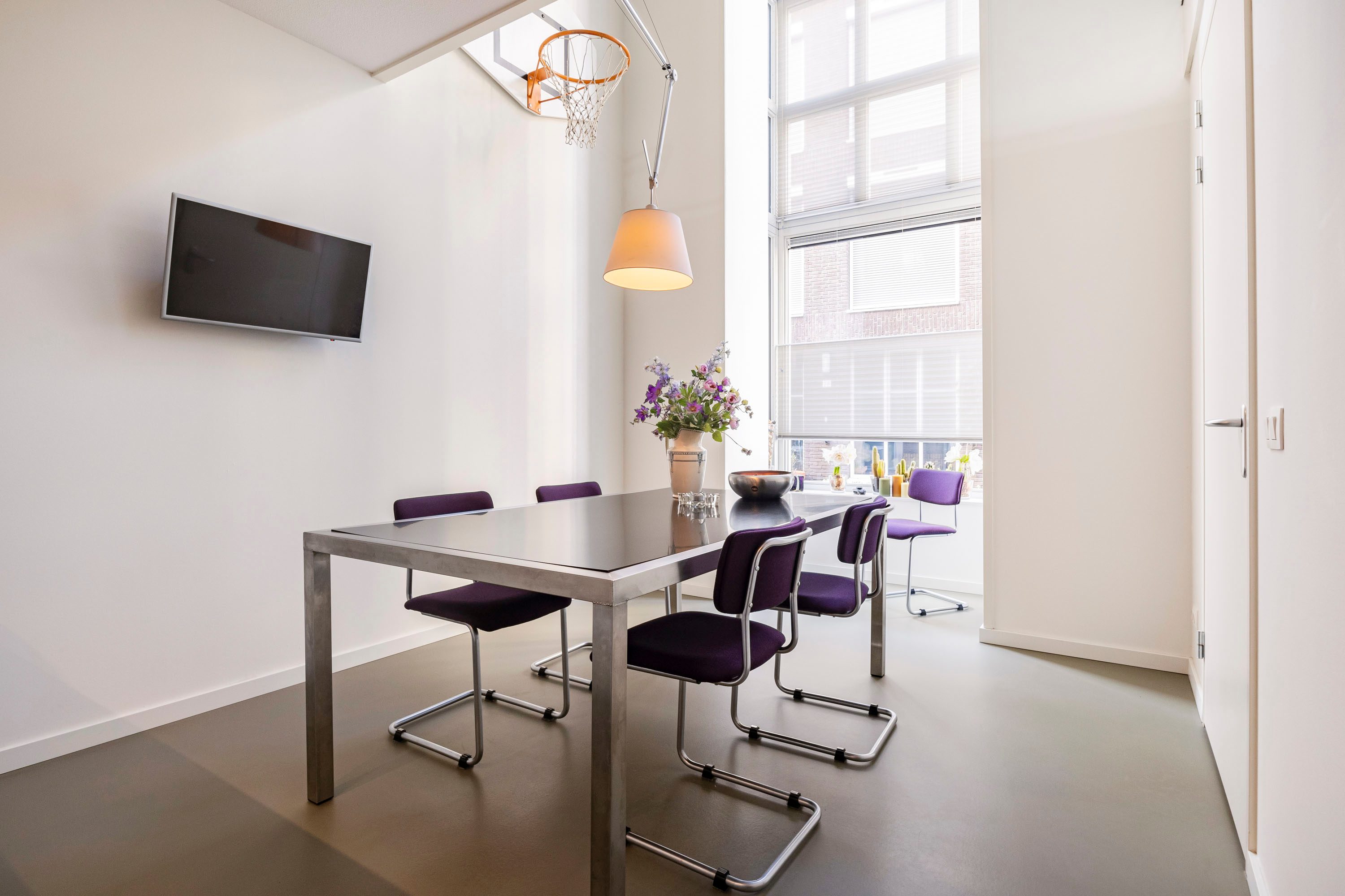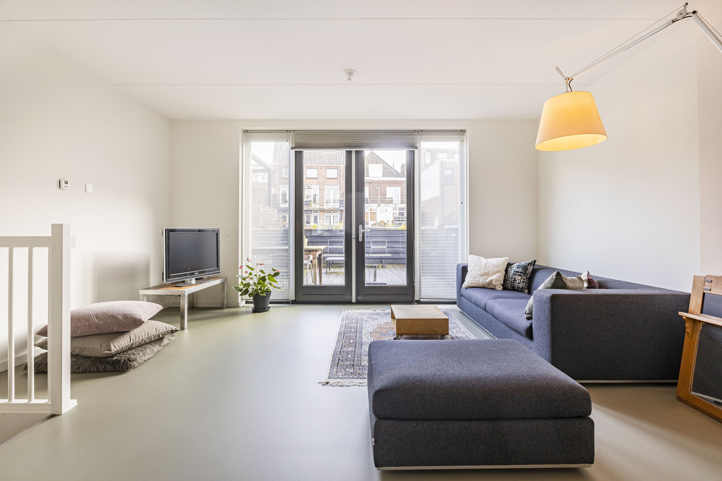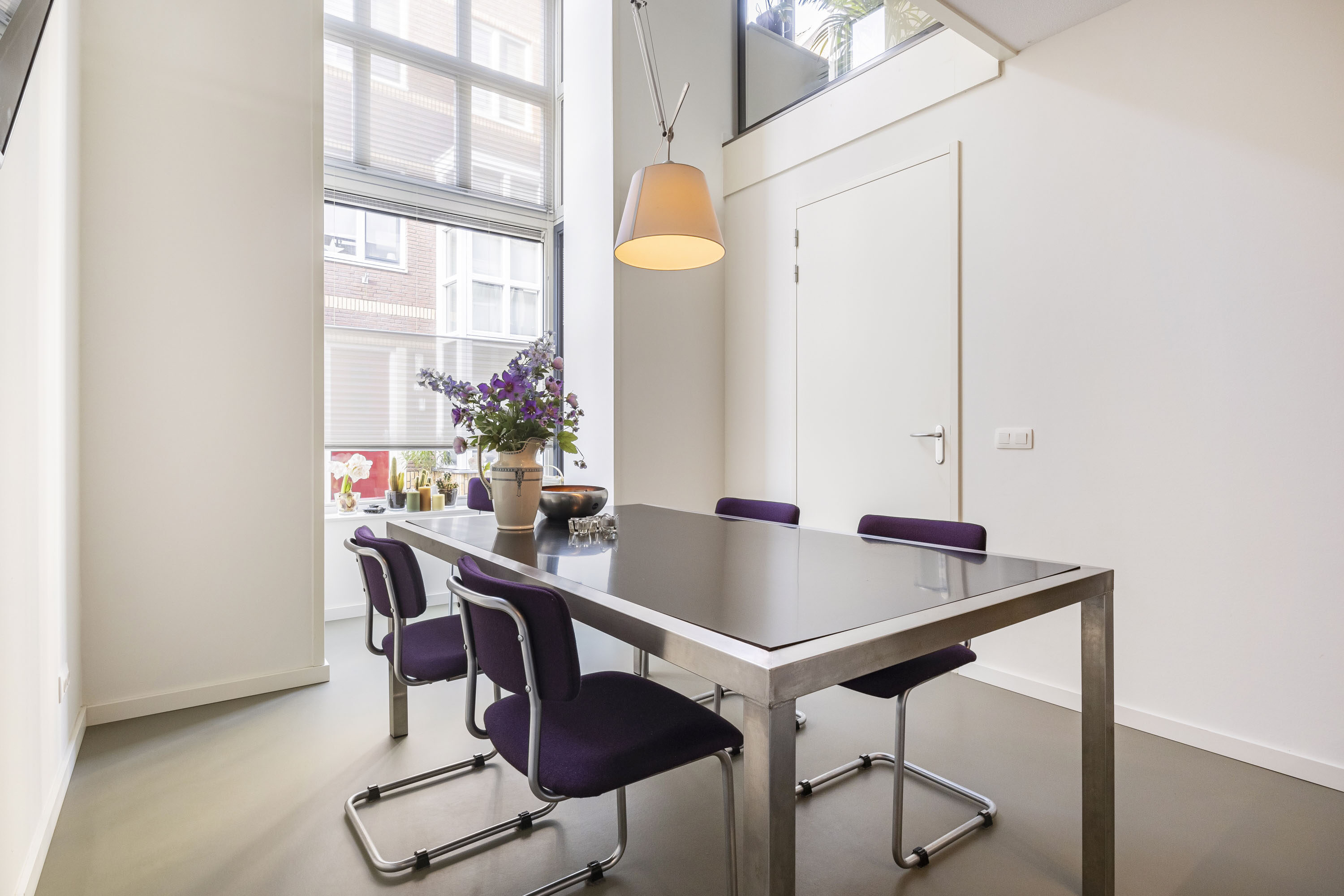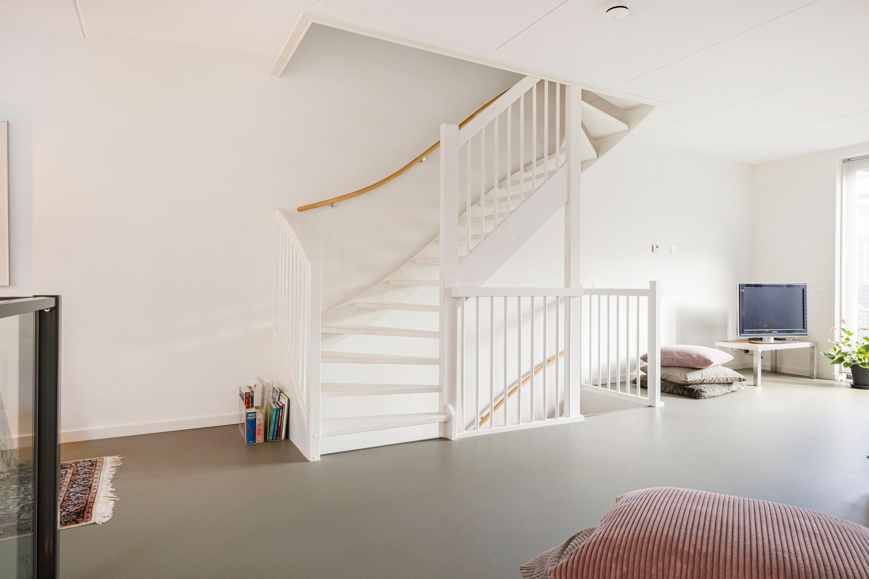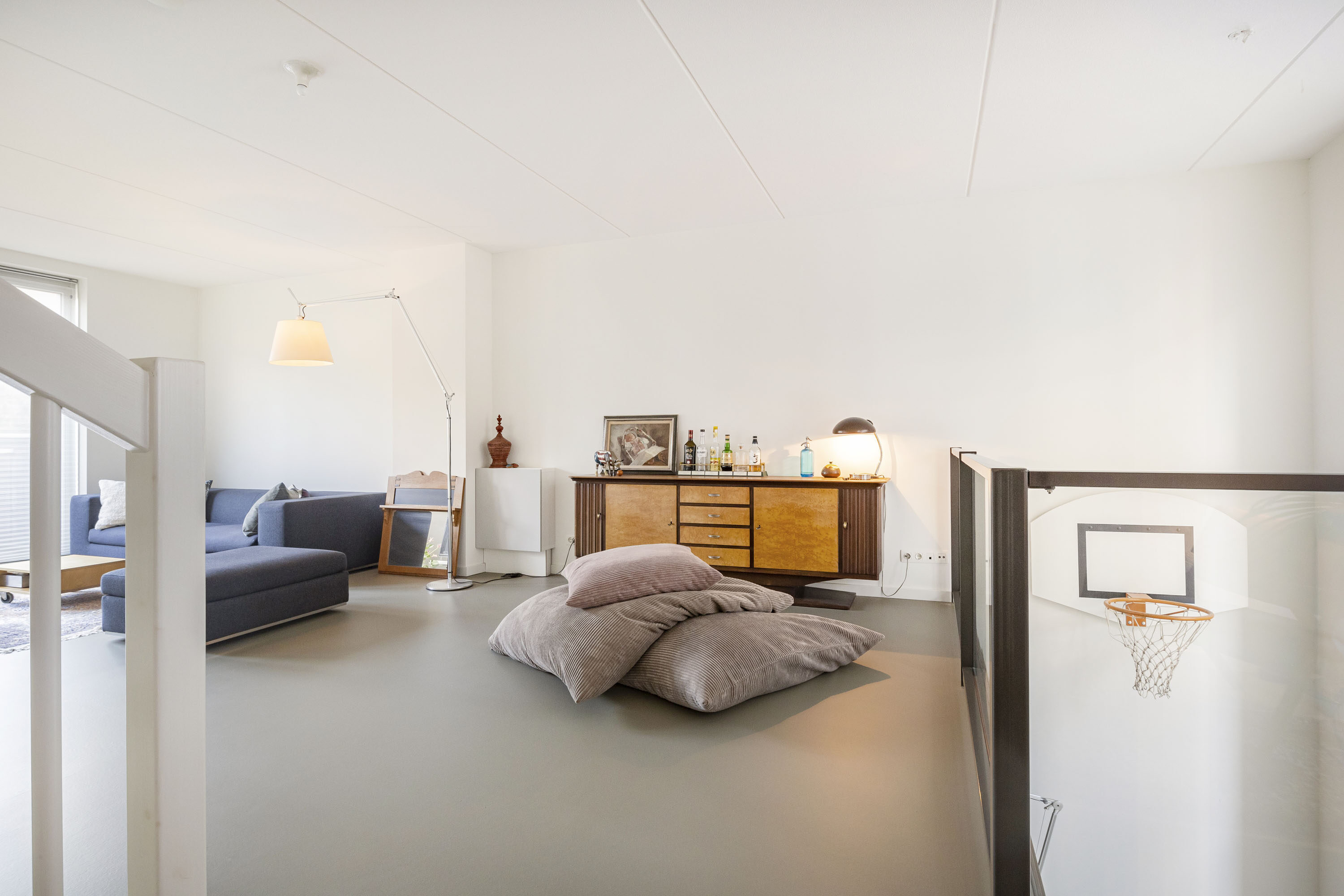 Via de trapopgang kom je aan op de eerste verdieping en hier bevindt zich de woonkamer. De woonkamer heeft een royale afmeting van ca 50m² en is voorzien van een gietvloer, strakke wanden en heerlijk veel lichtinval door de grote raampartijen. De openslaande deuren geven toegang tot het heerlijke en ruime dakterras gelegen op het oosten met ochtend- en middagzon.
