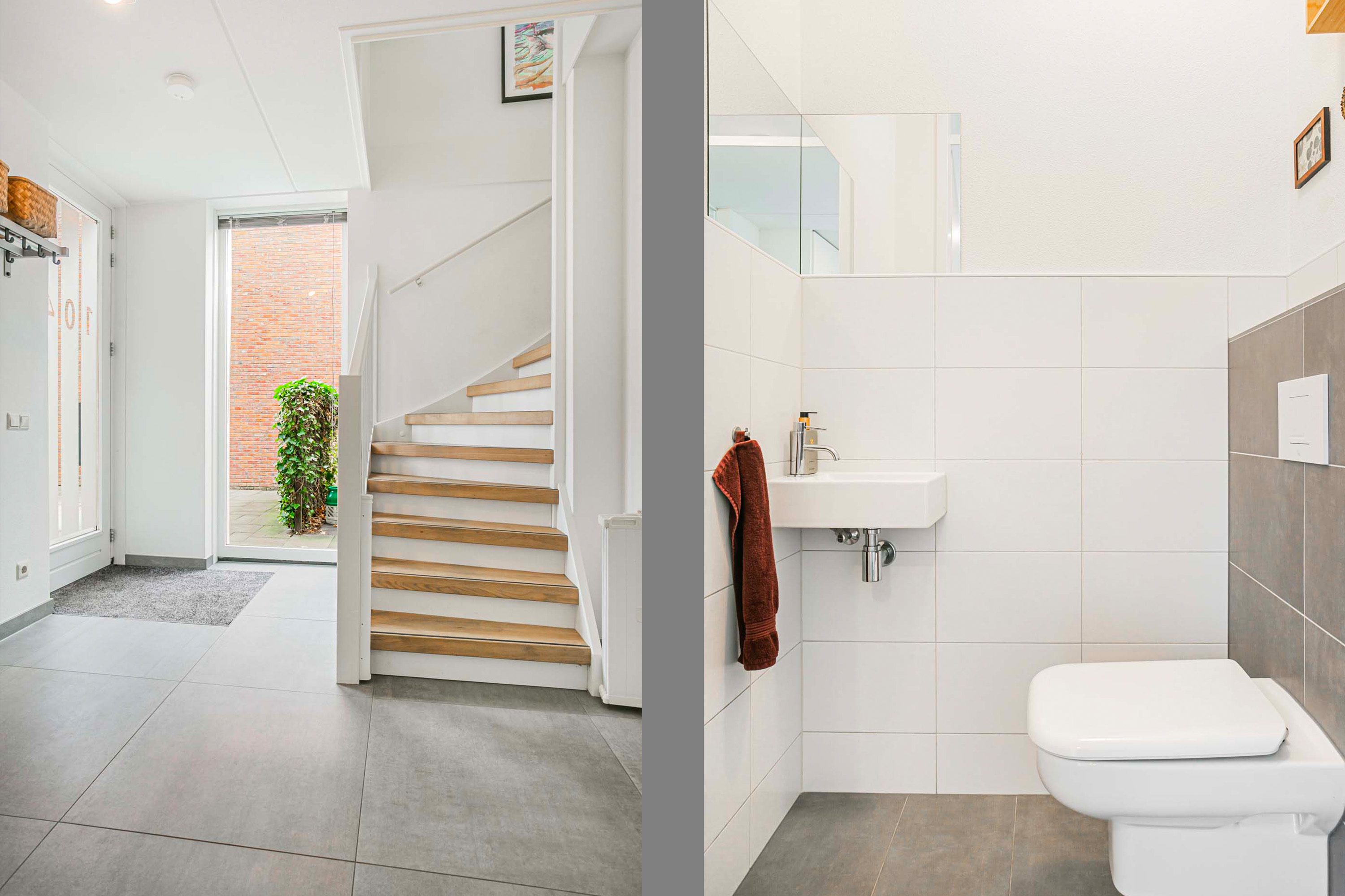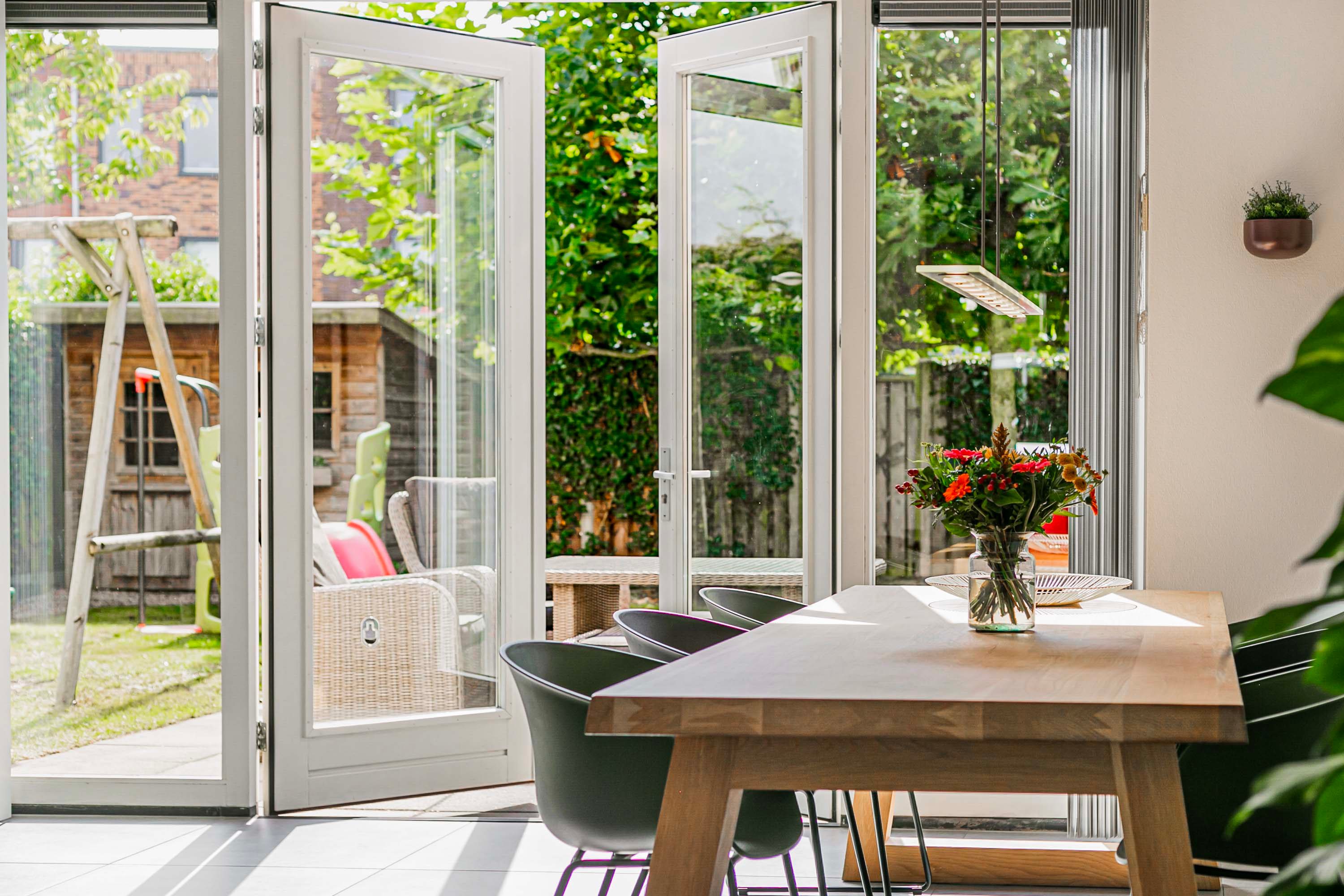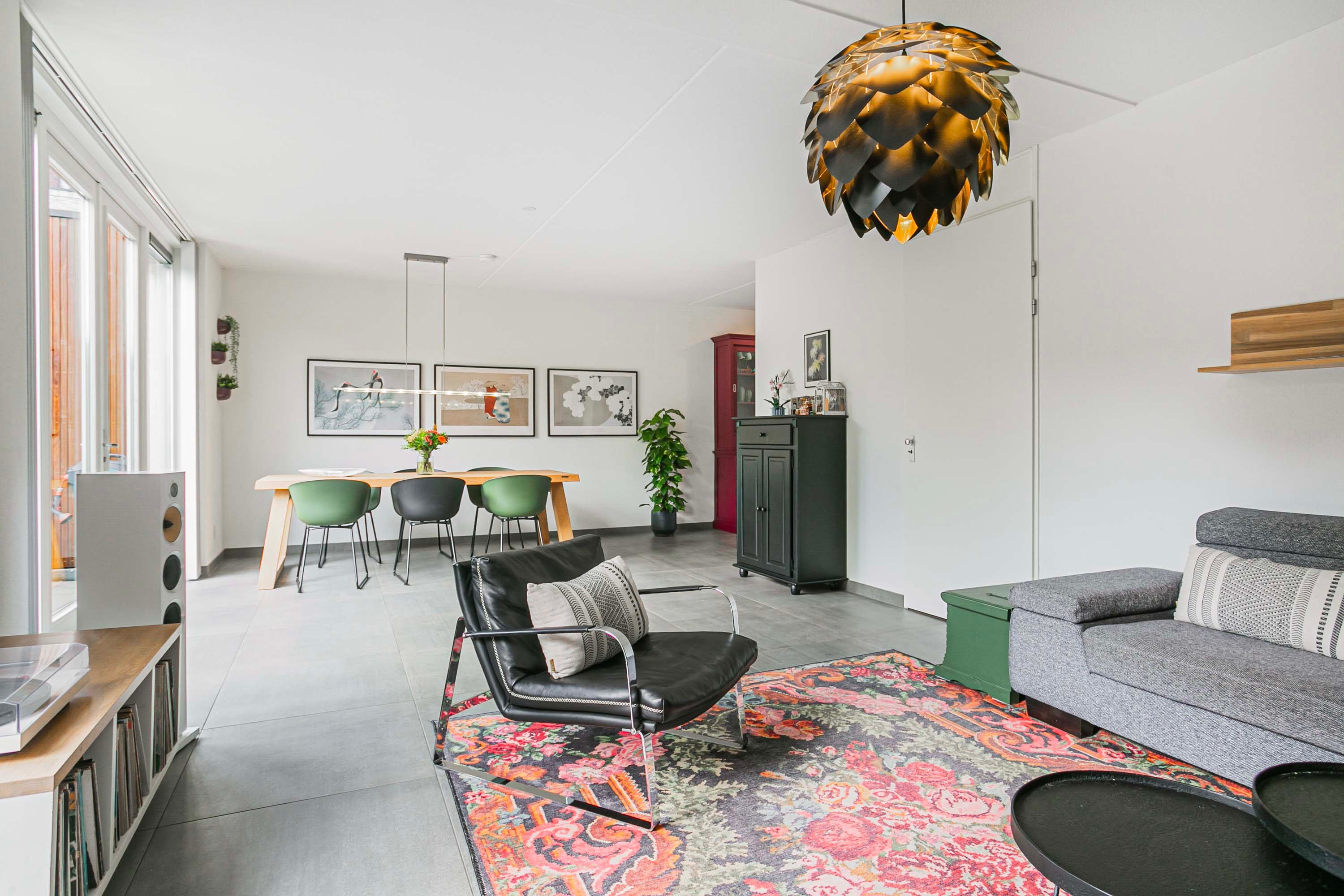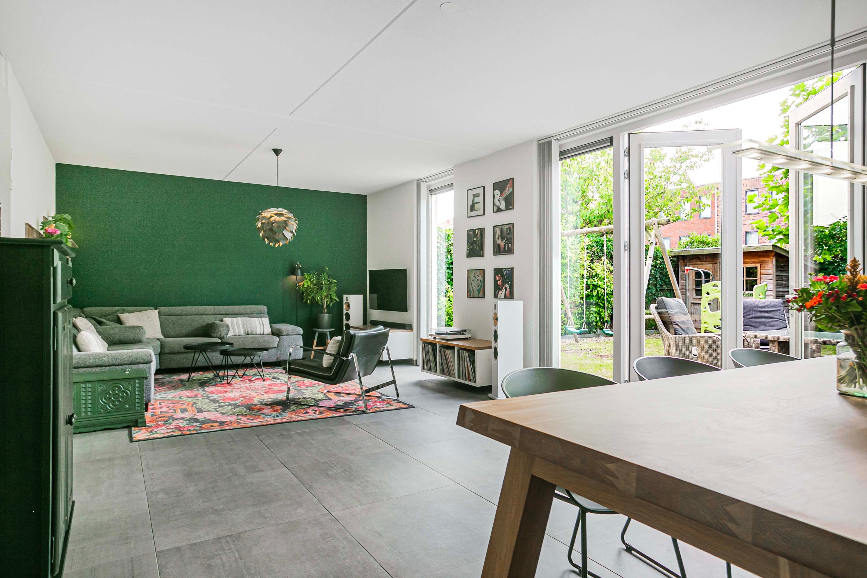 Wanneer je de woning binnenstapt, kom je in een ruime hal met toegang tot een modern toilet en de trap naar de eerste verdieping. Vanuit de hal loop je door naar de royale woonkamer aan de achterzijde van de woning met een deur naar de trapkast. Dankzij de grote raampartijen en openslaande deuren is dit een heerlijk lichte ruimte, die bovendien direct verbonden is met de zonnige achtertuin. Hier kun je in de zomermaanden de deuren openzetten en zo binnen en buiten moeiteloos met elkaar verbinden – ideaal voor een ontspannen ontbijt in de zon of een gezellige avond met vrienden.