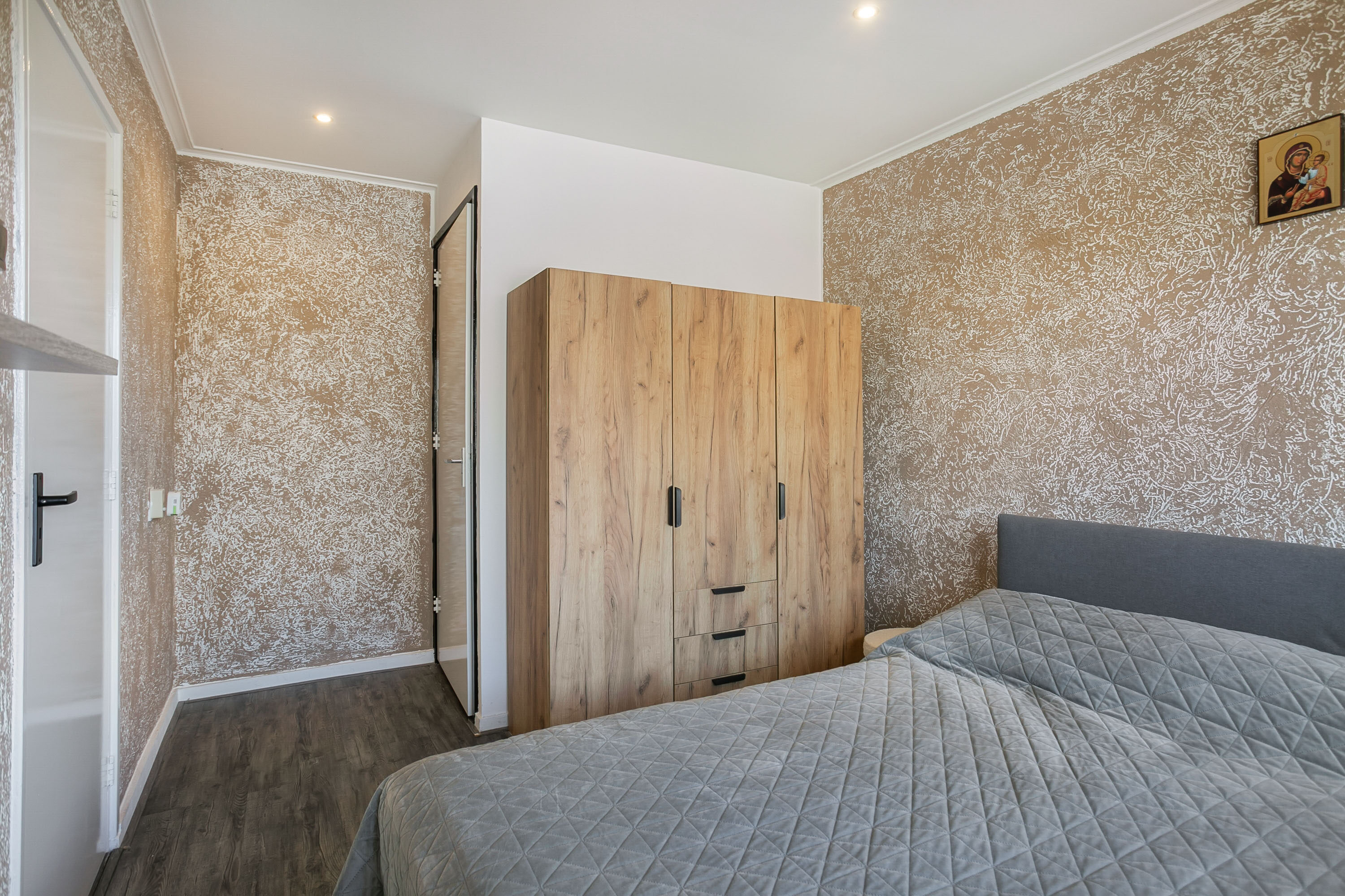 De slaapkamer beschikt over een inloopbadkamer met douche en wastafel.