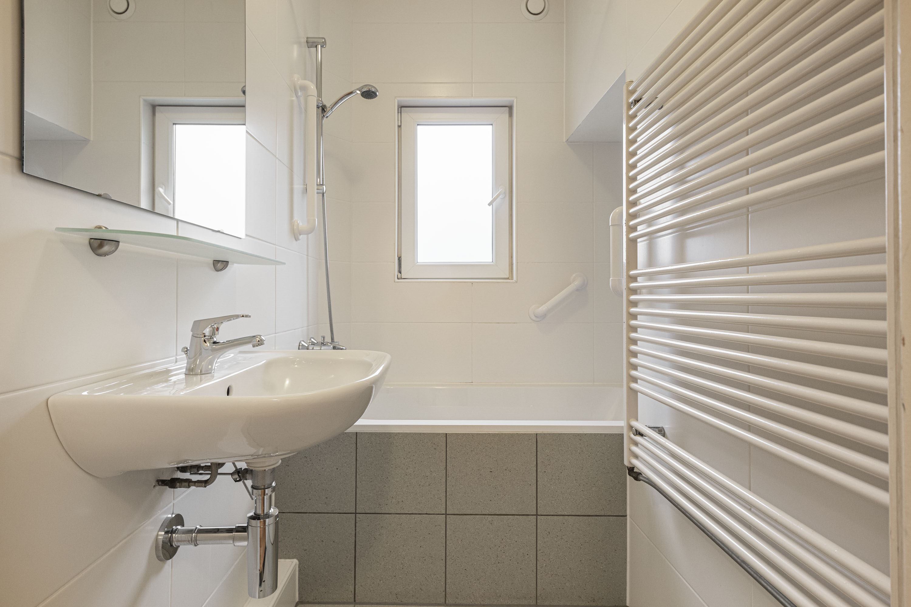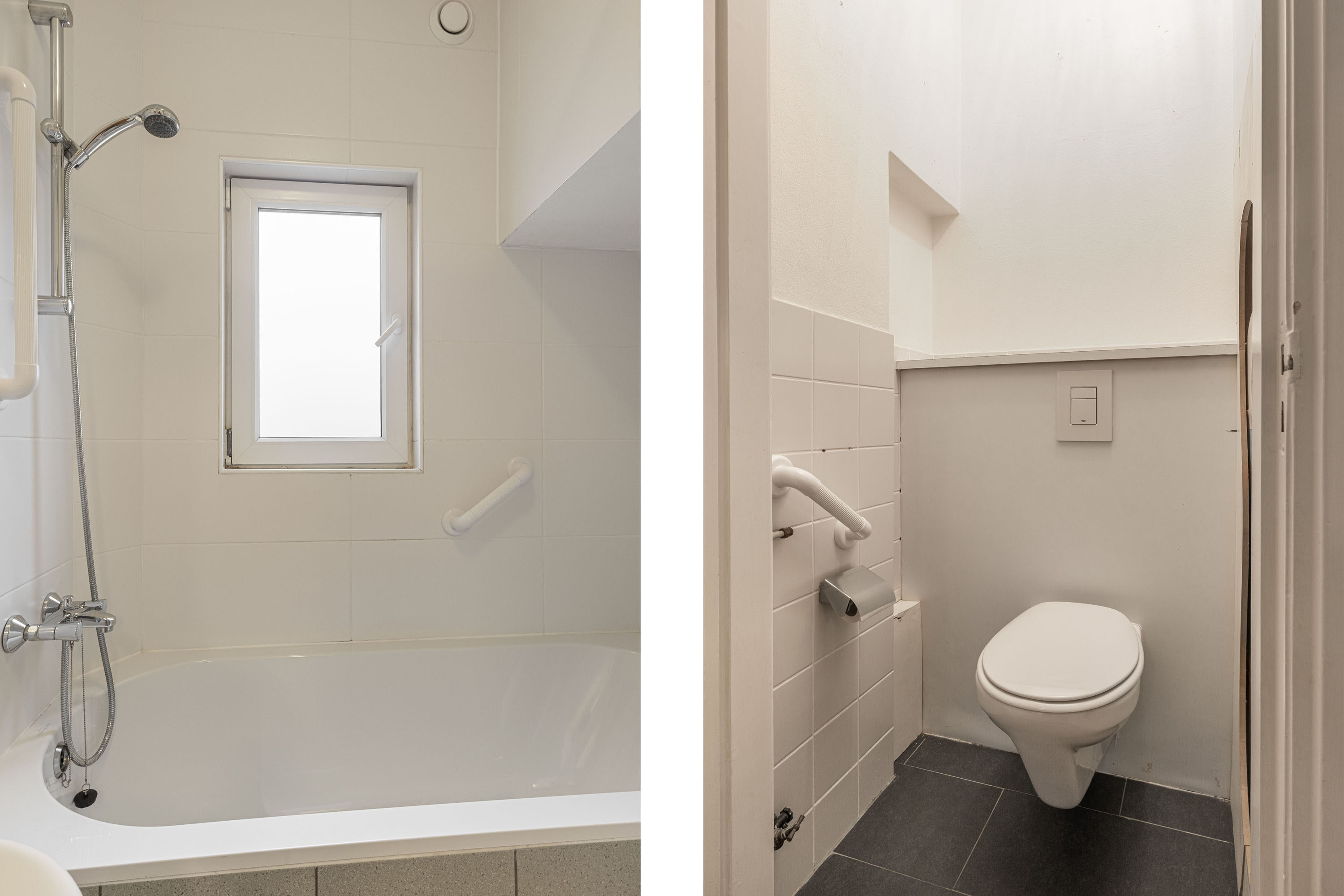 Aan de achterzijde van het appartement ligt de ruime slaapkamer van circa 13m². De badkamer is eenvoudig maar functioneel ingericht en voorzien van een ligbad met douche en een wastafel. Het toilet is separaat en bevindt zich in de hal.