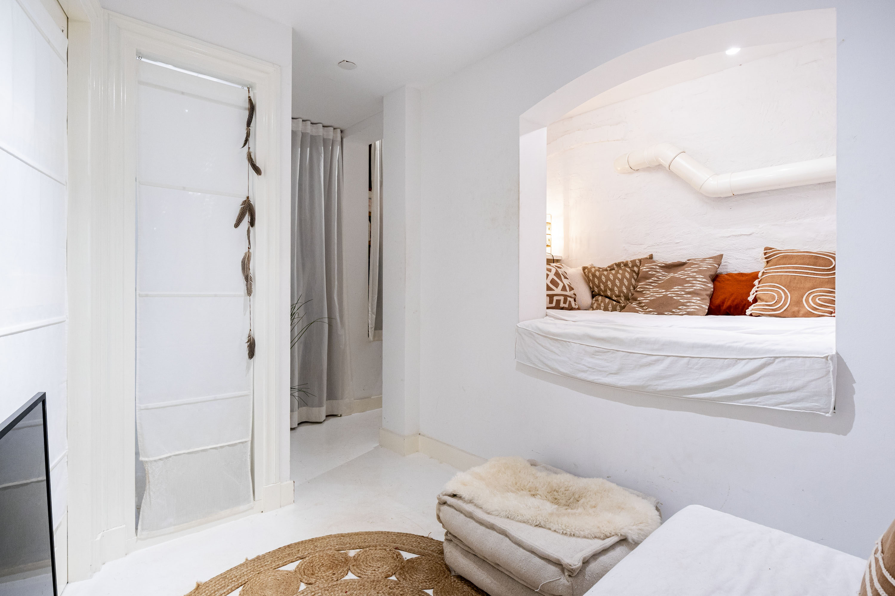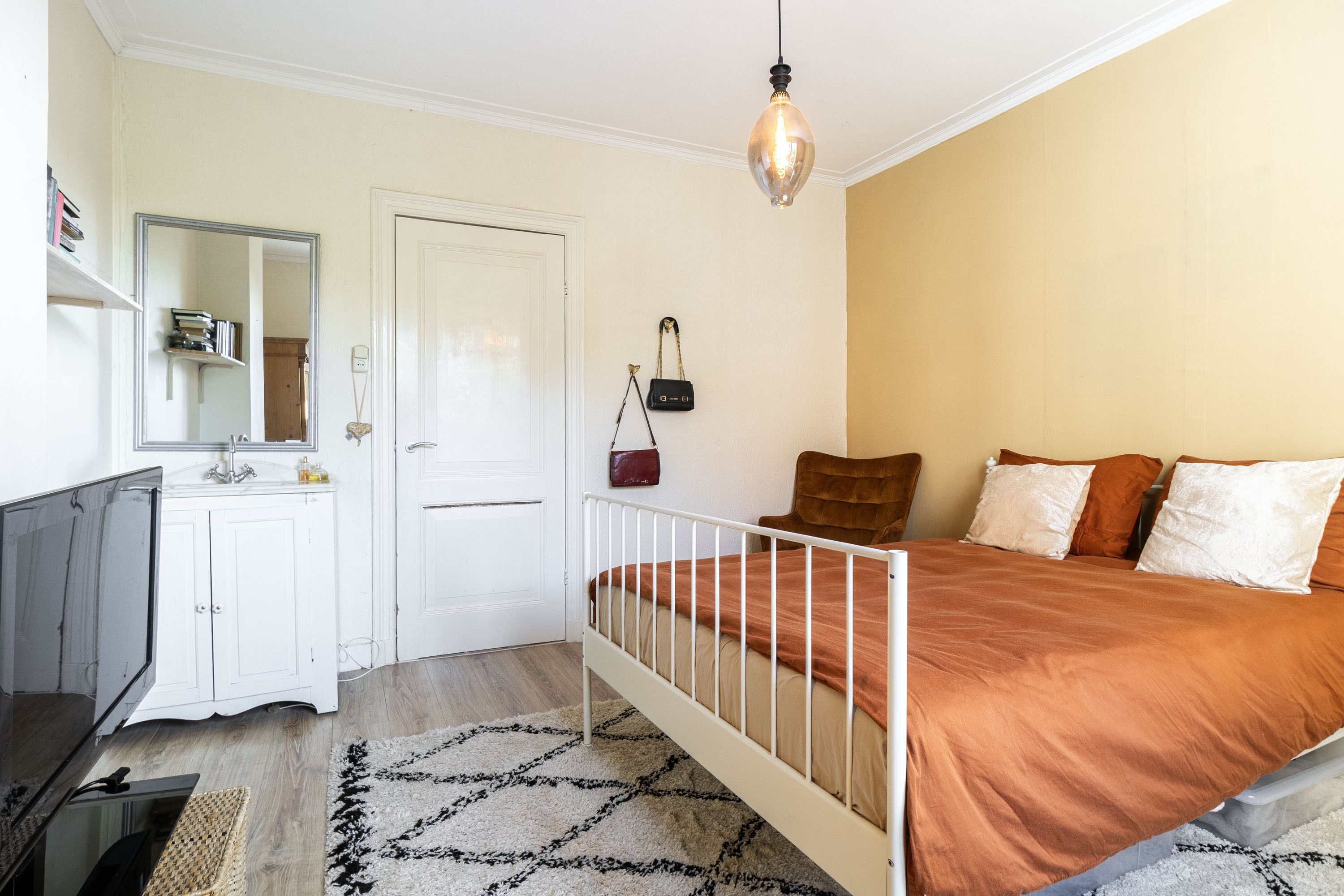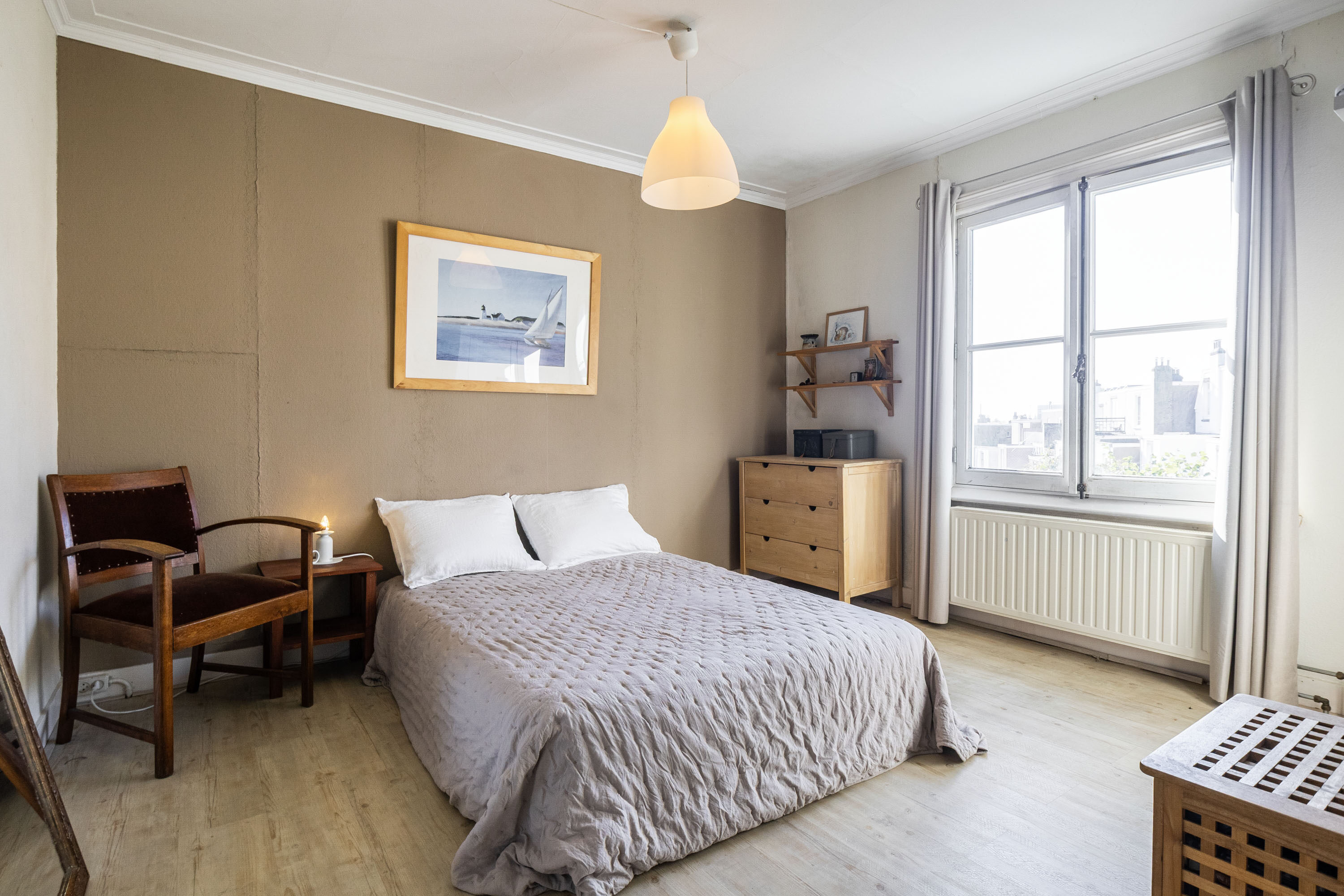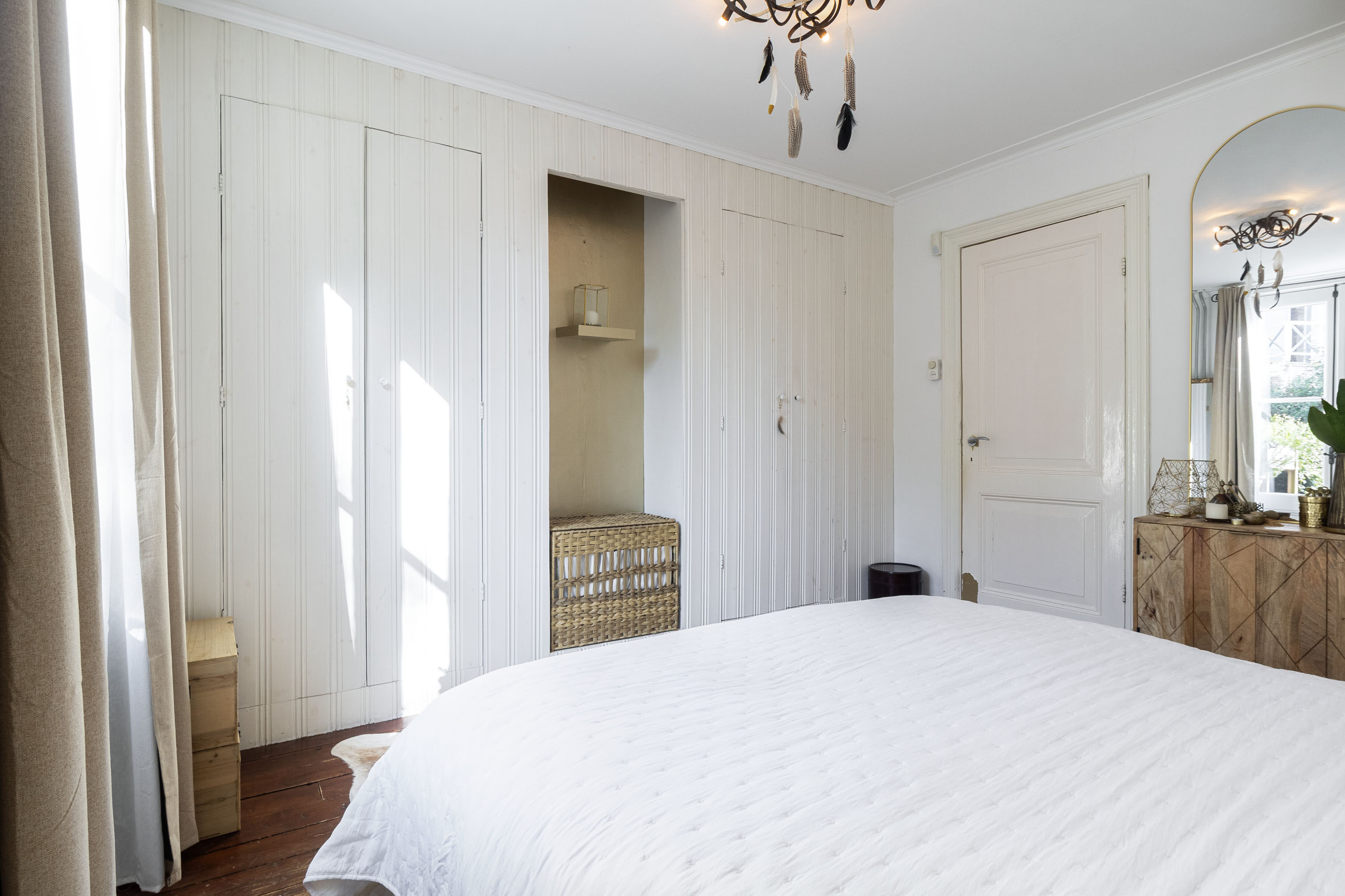 Op de eerste verdieping vind je een slaapkamer van circa 11 m², die is voorzien van een sfeervolle houten vloer en een praktische ingebouwde kastenwand. De ruimte wordt extra bijzonder door de dubbele deuren die toegang bieden tot het terras, waardoor binnen en buiten prachtig in elkaar overlopen. Het hoge plafond versterkt het gevoel van ruimte en draagt bij aan de charmante uitstraling van de kamer.