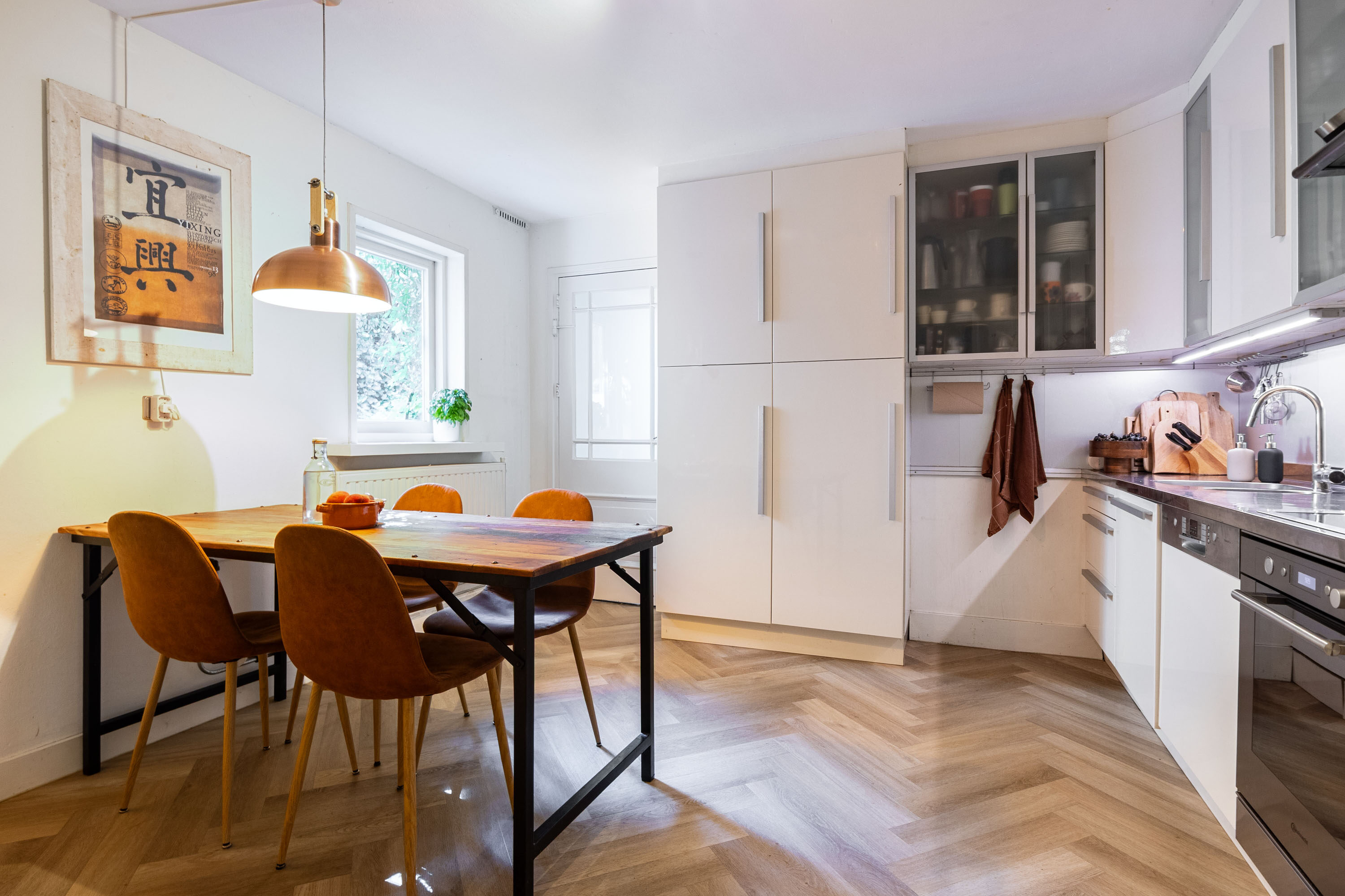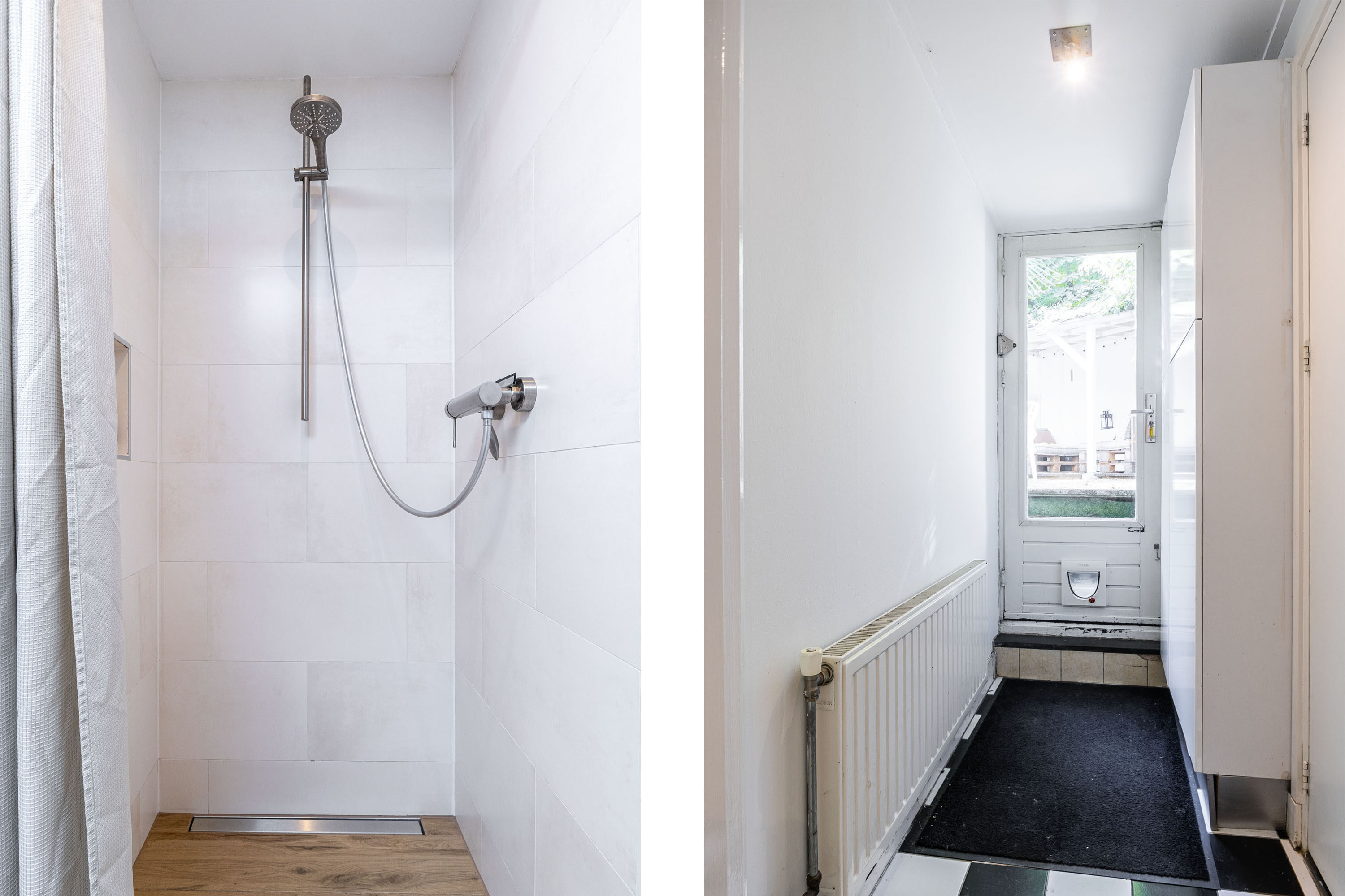 Grenzend aan de kamer-en-suite bevindt zich de serre, die is voorzien van glas-in-lood ramen (met voorzetramen) en openslaande deuren naar de achtertuin. Deze lichte ruimte leent zich perfect als leeshoek of speelkamer. Vanuit de hal bereik je de keuken, die ruim is opgezet met een hoekopstelling en diverse inbouwapparatuur. De keuken functioneert, maar is wel toe aan vernieuwing. Ook is er plek voor een eettafel, waardoor de keuken een fijne, praktische leefruimte vormt. Via de keuken is er toegang naar de tussenhal en de souterrain. De tussenhal biedt toegang naar de badkamer en achtertuin. De badkamer is voorzien van inloopdouche, wastafelmeubel, handdoekradiator en een praktische badkamerkast