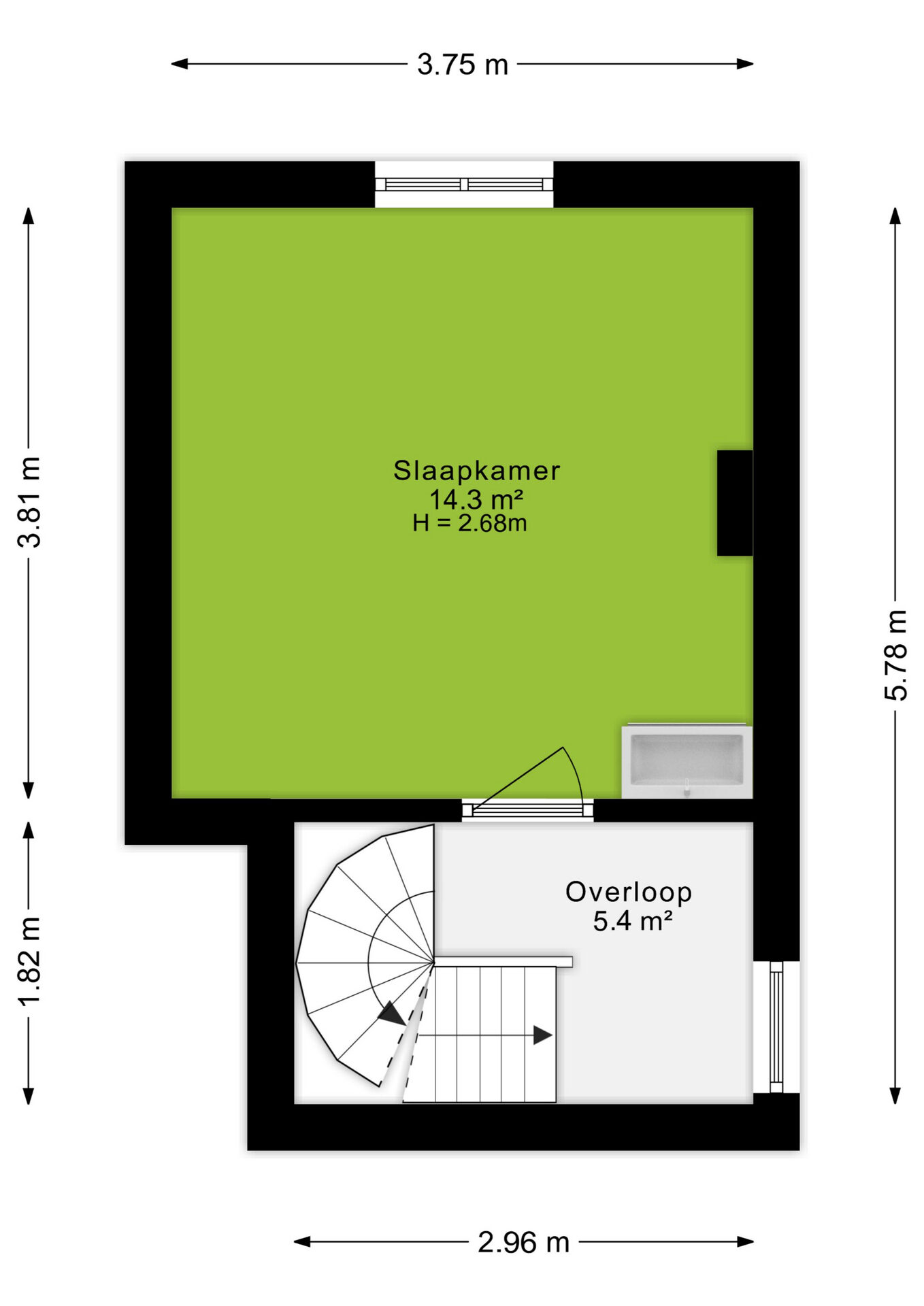 Op deze verdieping tref je een tweede slaapkamer van circa 14m² met laminaatvloer en wastafelmeubel.