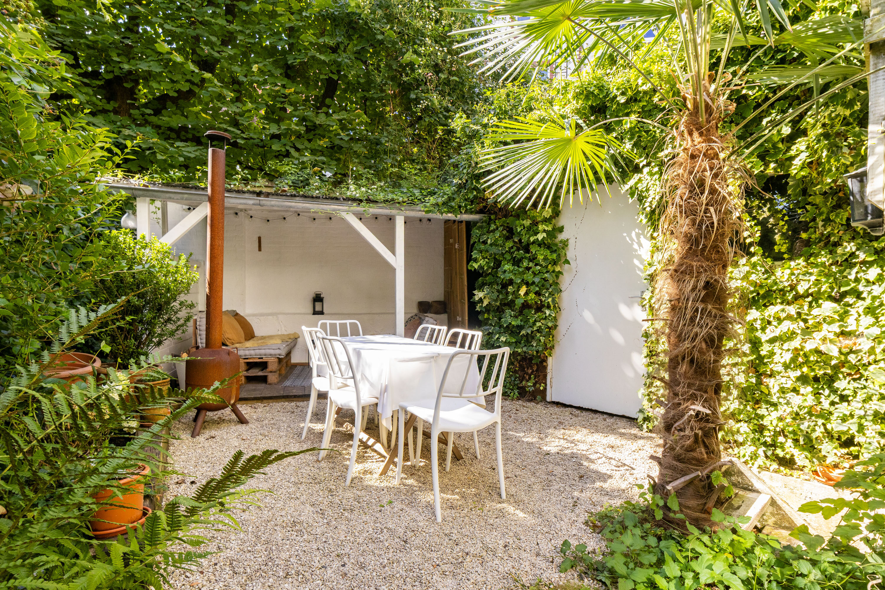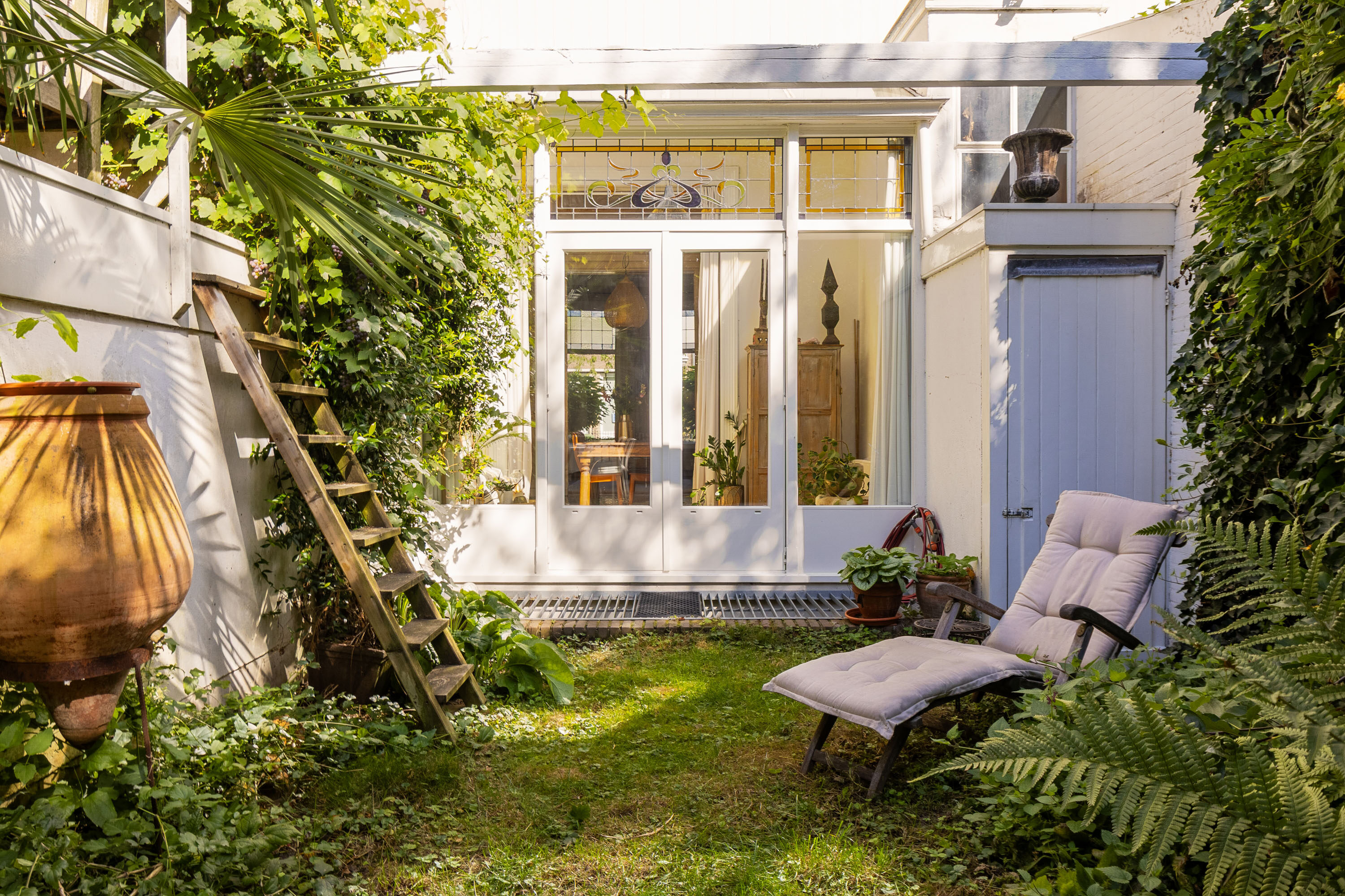 De achtertuin is een groene oase die volop privacy biedt. Dankzij de gunstige ligging op het zonnige zuiden kun je kiezen voor een plek in de zon of juist in de schaduw. Onder de sfeervolle veranda geniet je van lange, zwoele zomeravonden in alle rust. De praktische berging biedt voldoende ruimte voor het opbergen van tuingereedschap, kussens en andere spullen, en is ook ideaal voor het stallen van fietsen. Daarnaast is de tuin voorzien van een handige achterom, wat extra gemak toevoegt.