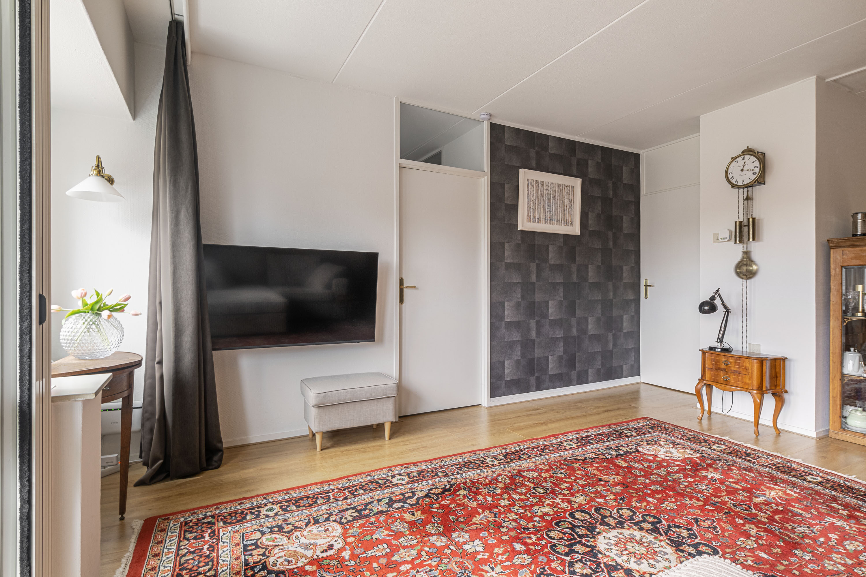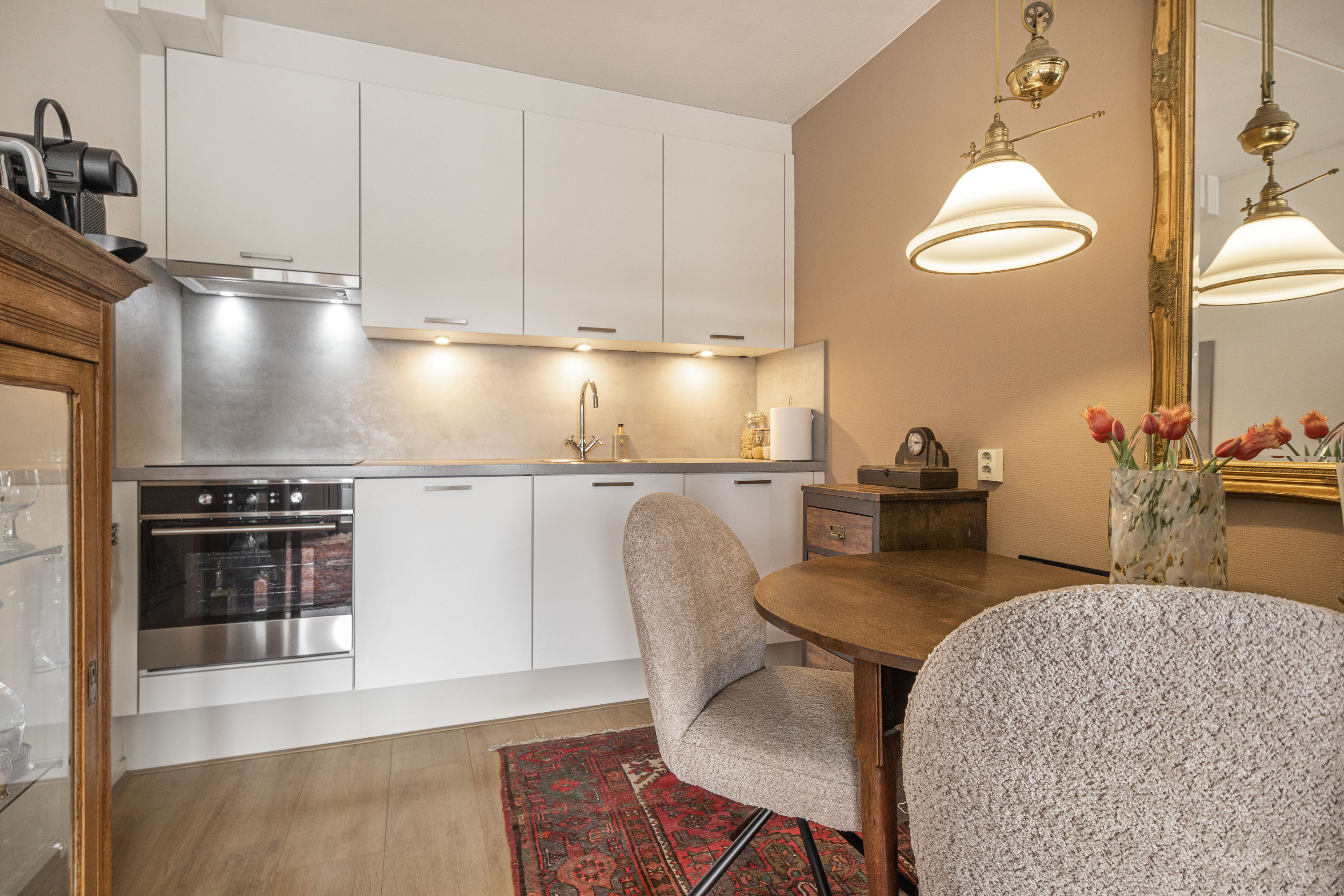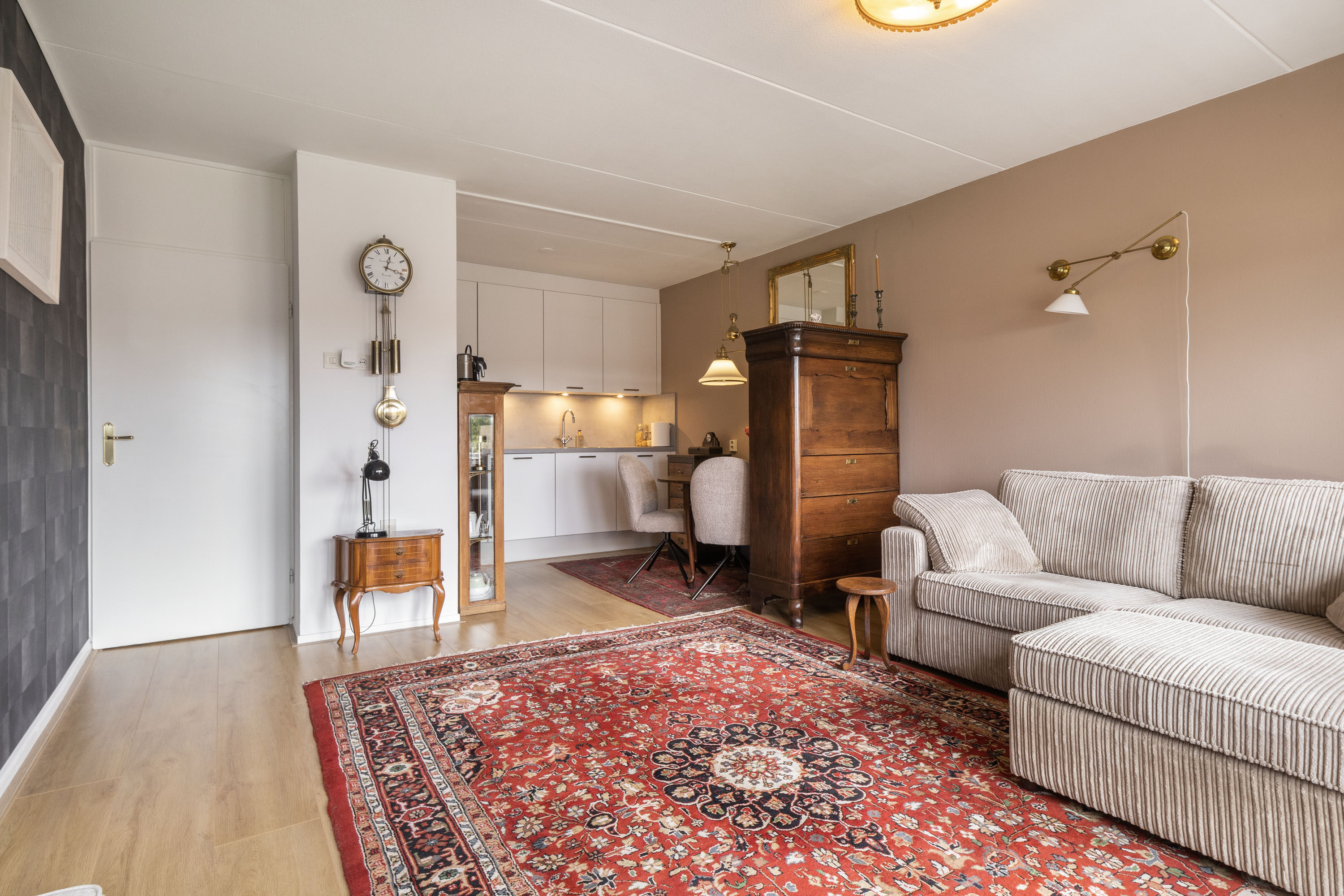 De ruime woonkamer is eenvoudig in te delen en biedt via de deur toegang tot een ruim balkon op het zuidoosten. Hier geniet je van zowel de ochtend- als middagzon. De open keuken is in 2021 vernieuwd en strak ingericht in een rechte opstelling. Daarnaast is deze van alle gemakken voorzien met inbouwapparatuur, waaronder een kookplaat, afzuigkap, oven en koelkast.