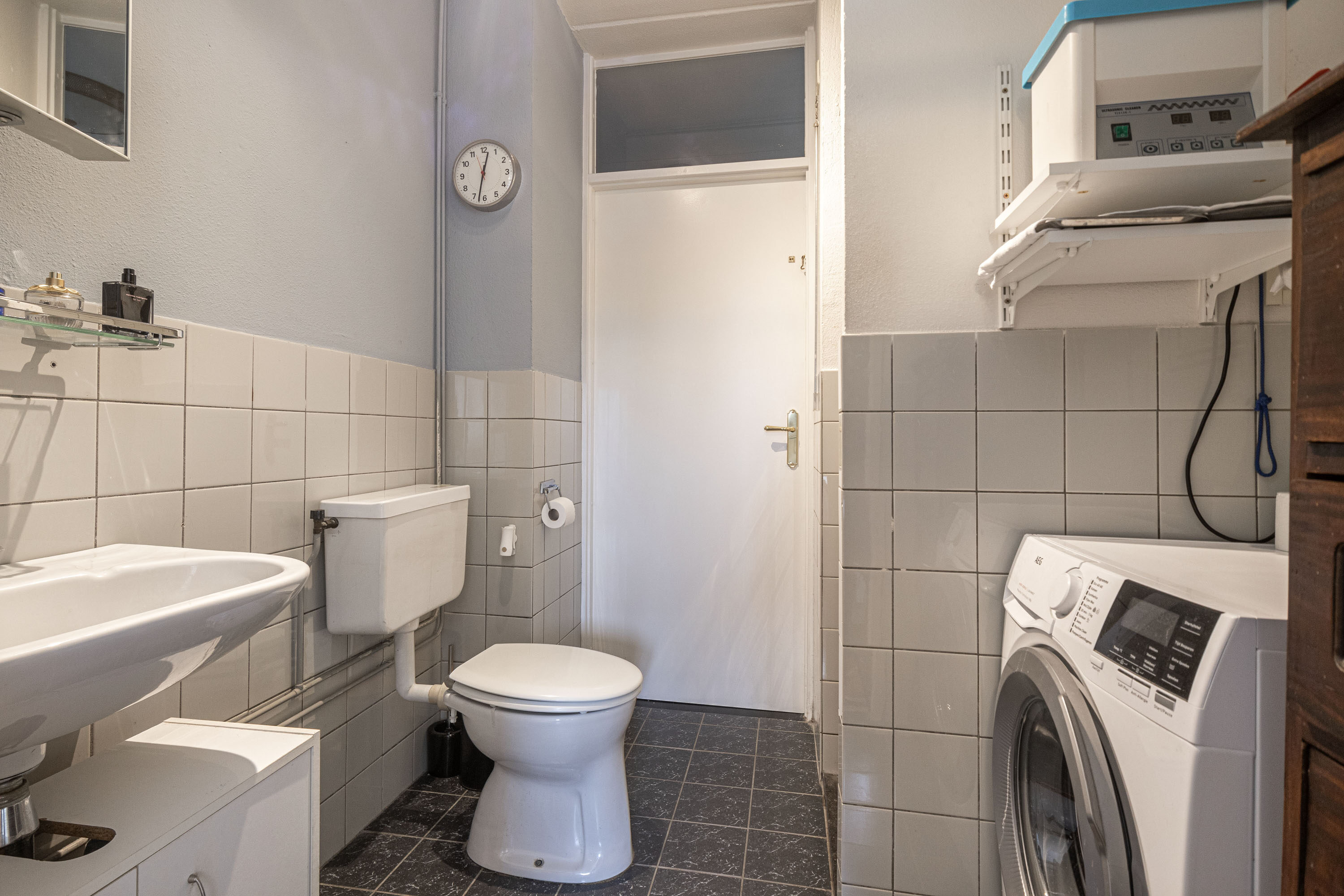 De badkamer is voorzien van licht tegelwerk en beschikt over een douchehoek, wastafel, toilet en een aansluiting voor de wasmachine.