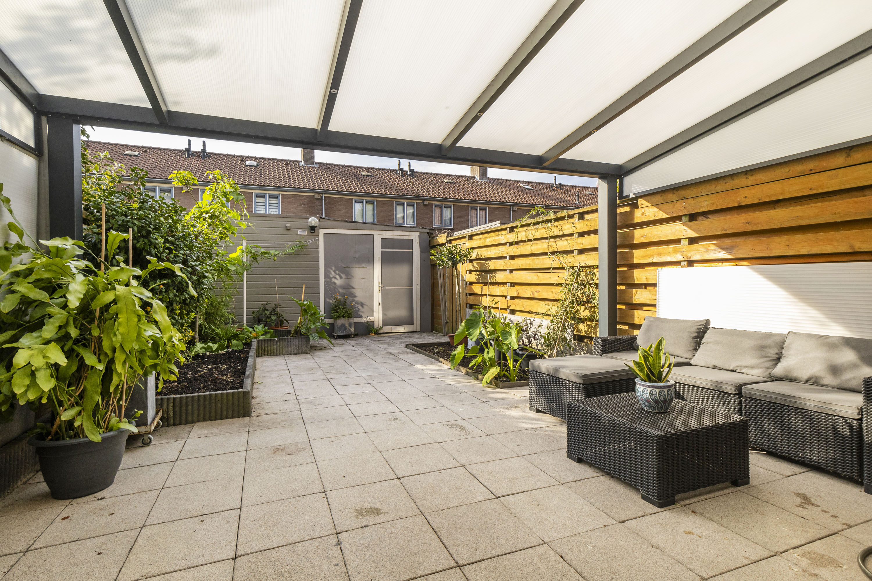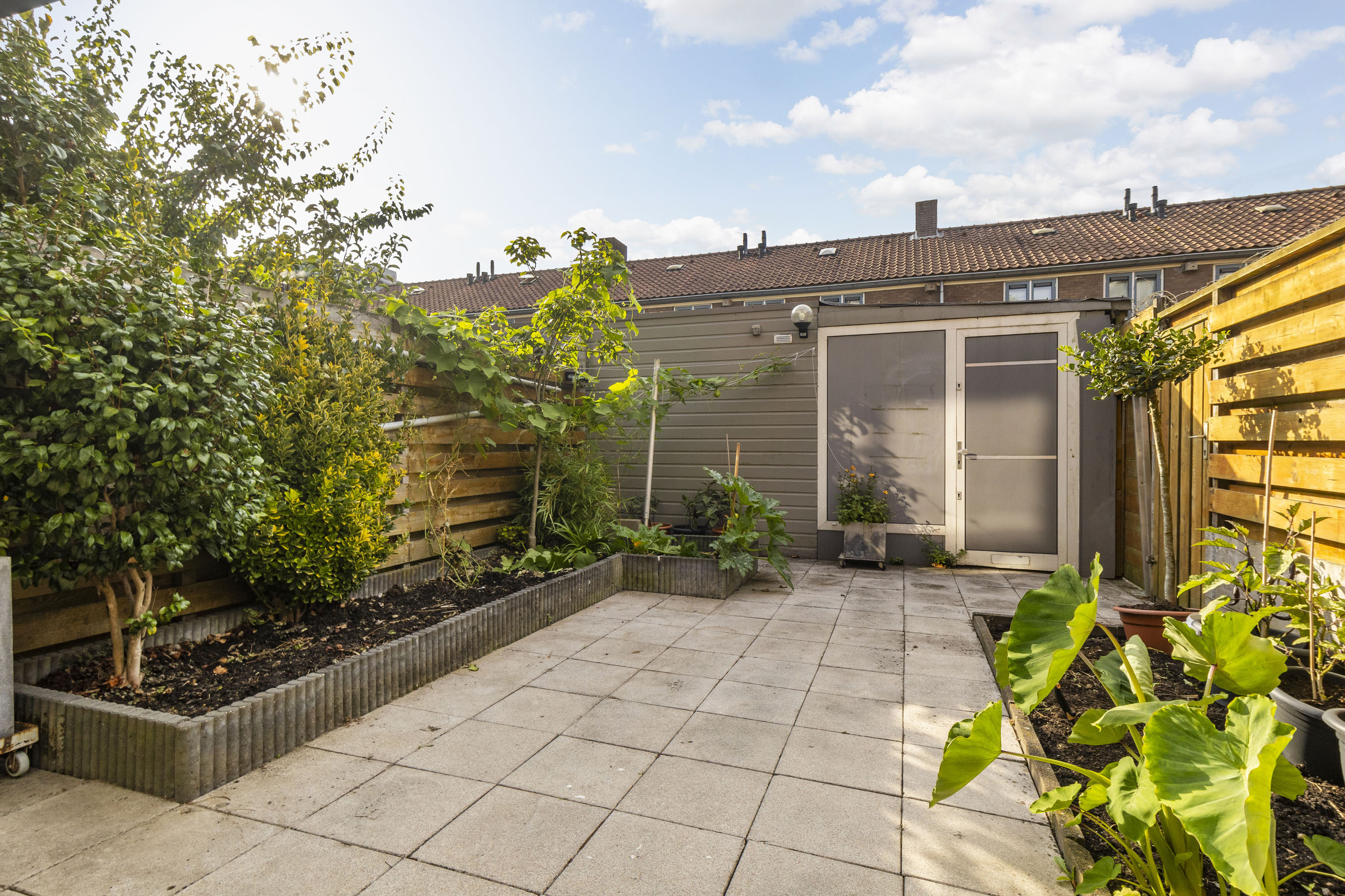 De tuin is gelegen op het zuidoosten en voorzien van bestrating, borders, een overkapping en een berging met achterom.