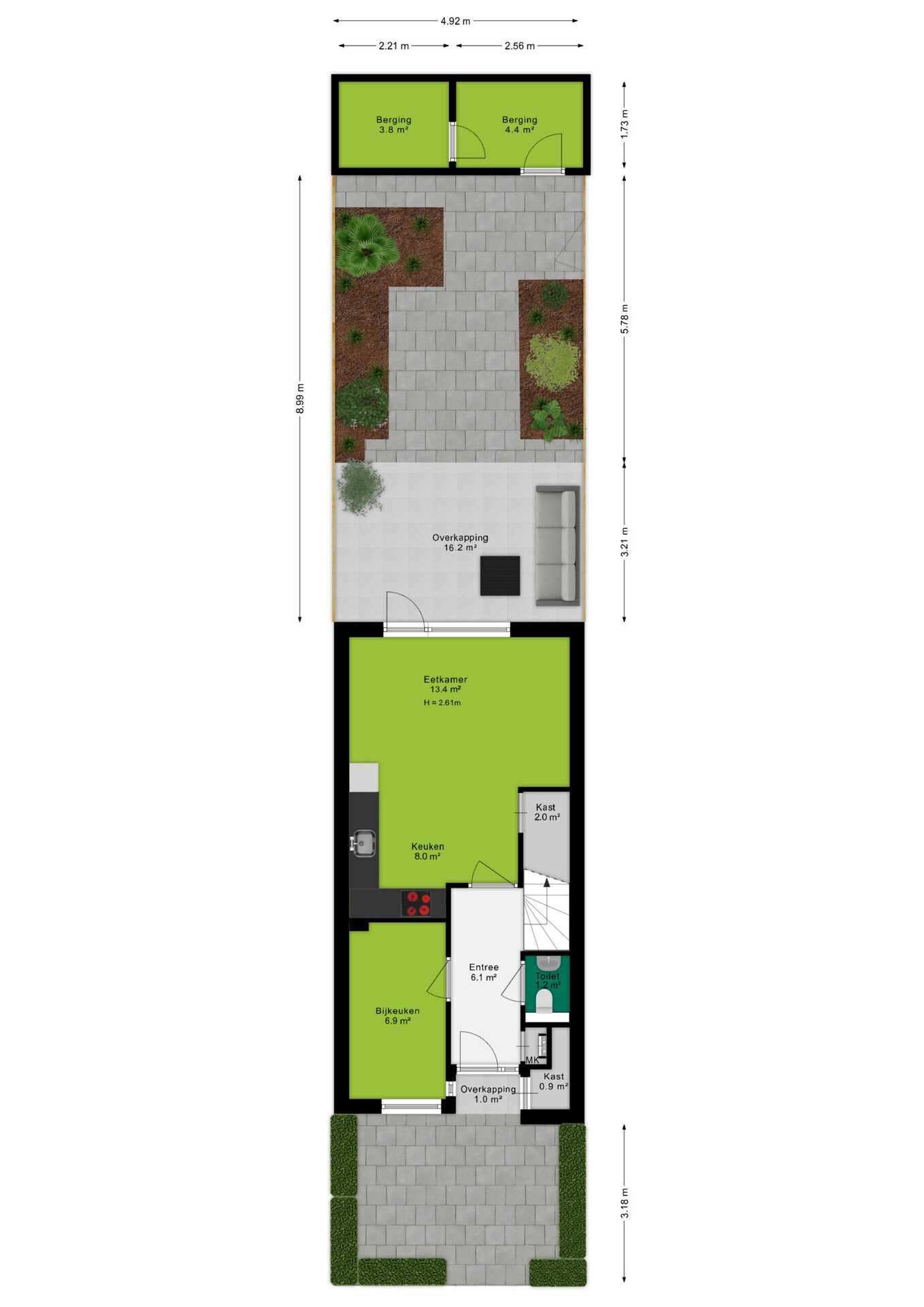 + Woonkeuken met inbouwapparatuur en directe toegang tot de tuin
