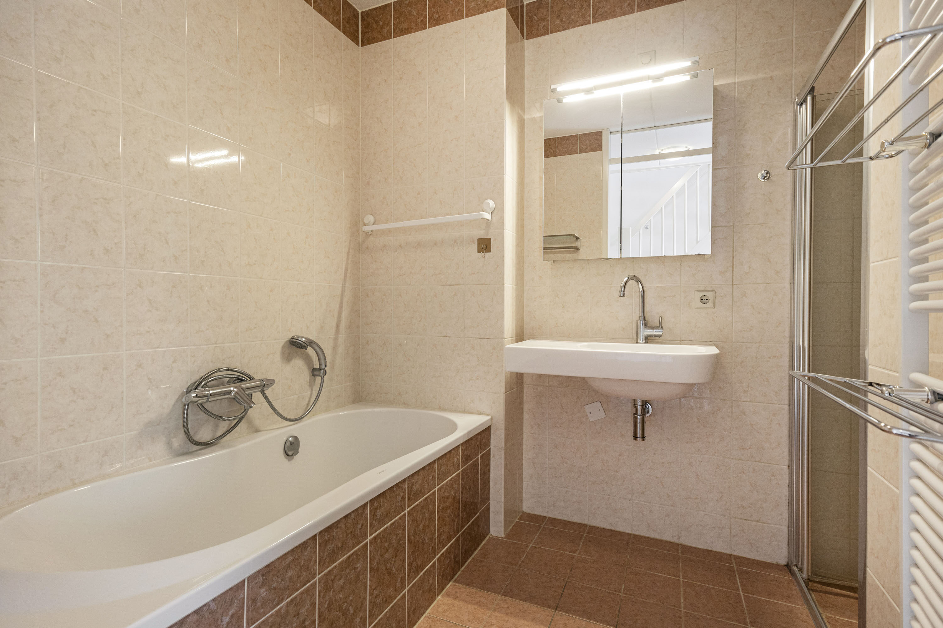 De tweede verdieping biedt een overloop met toegang tot twee slaapkamers van circa 14 m² en 13 m², een badkamer en een separaat toilet. De badkamer is uitgerust met een ligbad, douche, wastafel en handdoekradiator.