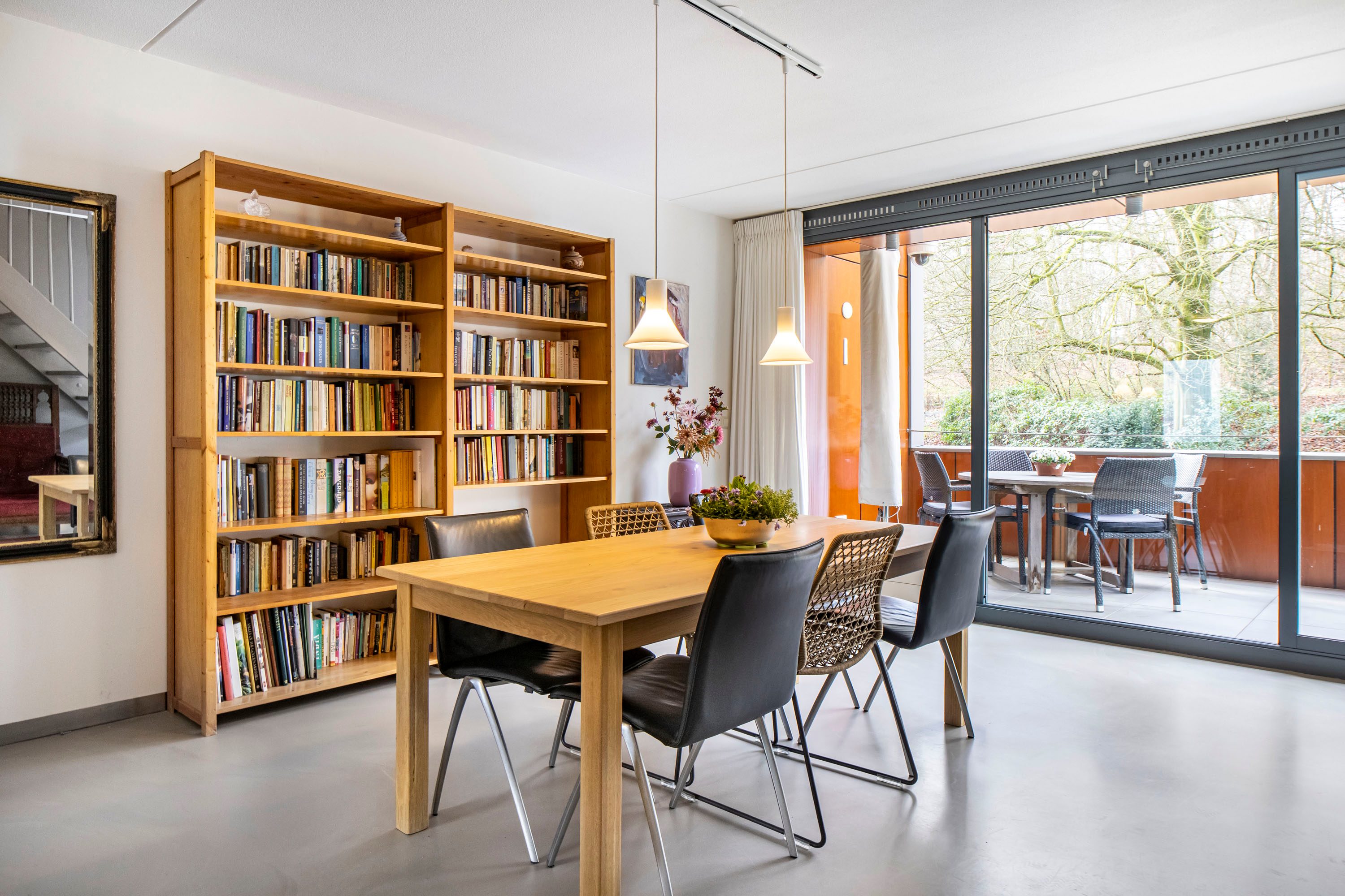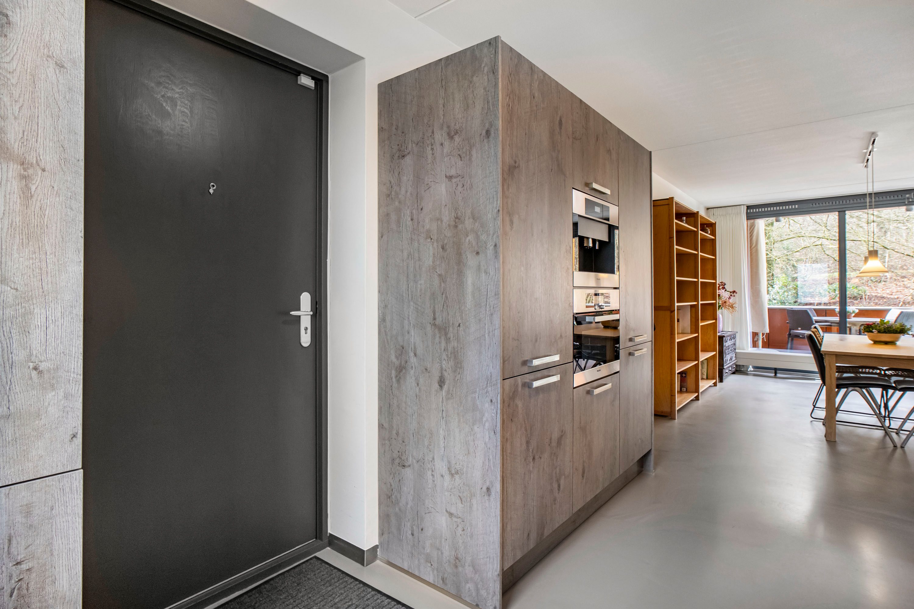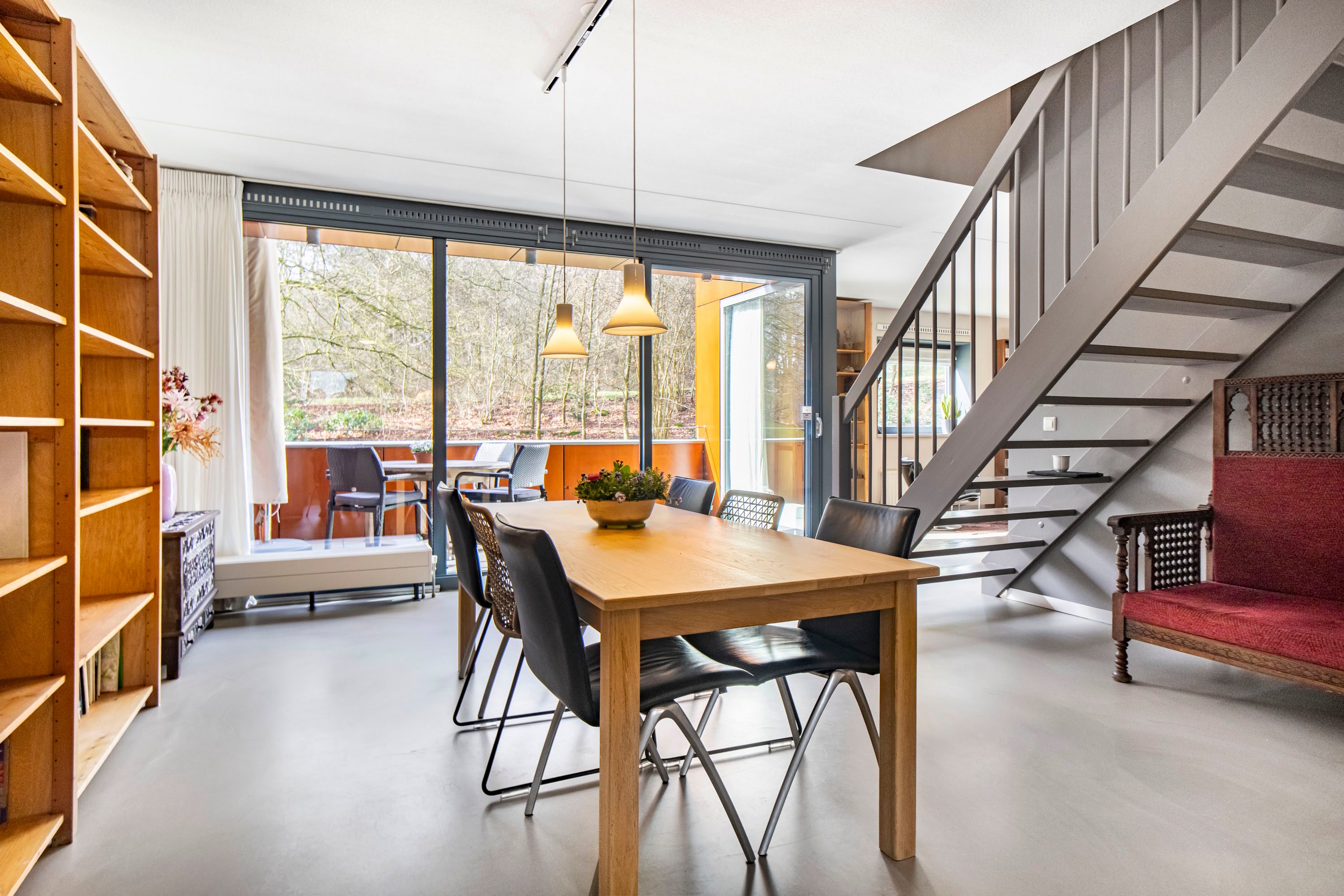 De woonverdieping vormt een prachtig licht en open geheel, waarbij de royale woonkamer van maar liefst circa 61m² direct de aandacht trekt. De grote schuifpui en de aanwezige raampartijen zorgen voor een overvloed aan daglicht en creëren een ruimtelijk en ontspannen woongevoel. In de woonkamer is bovendien airconditioning aanwezig, waardoor het hier het hele jaar door comfortabel vertoeven is. Vanuit de woonkamer loop je zo het inpandige terras op het zonnige zuidwesten op, waar je in alle privacy geniet van het groene uitzicht. De eetkamer sluit harmonieus aan op zowel de woonkamer als de keuken, waardoor een natuurlijke indeling en een fijne doorloop ontstaat. De gietvloer en de open trap versterken het moderne en luchtige karakter van deze verdieping. De halfopen keuken is uitgevoerd met warme houttint fronten en voorzien van diverse inbouwapparatuur, waaronder een Boretti fornuis met 6 pitten, een fijne plek voor iedere kookliefhebber. Op deze woonlaag bevindt zich tevens een ruime slaapkamer van circa 13m² met schuifdeurkast en een badkamer ensuite. De badkamer is uitgerust met een whirlpool, inloopdouche en wastafel. Daarnaast is er op deze verdieping een separate toiletruimte en een bergruimte met C.V. opstelling aanwezig.