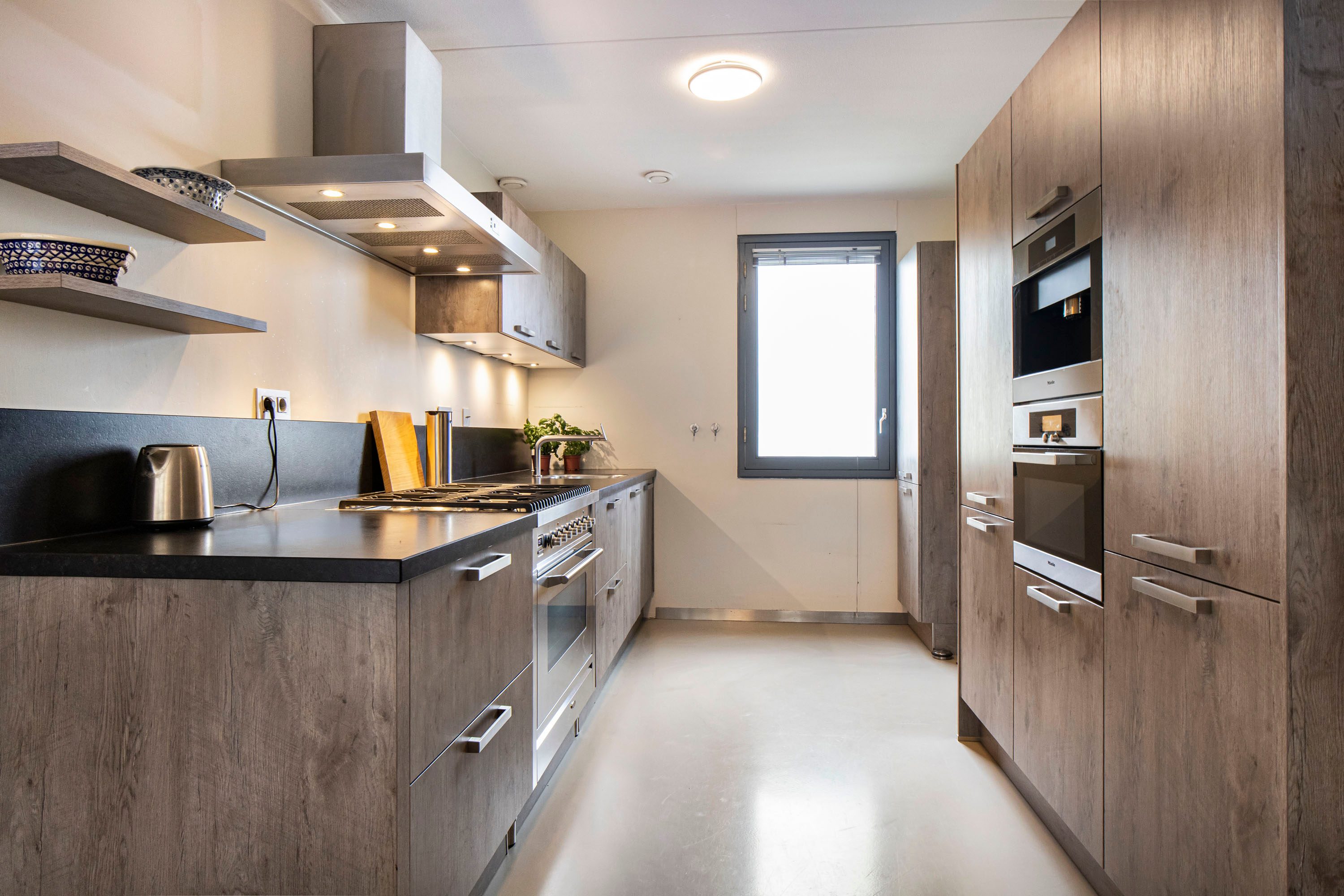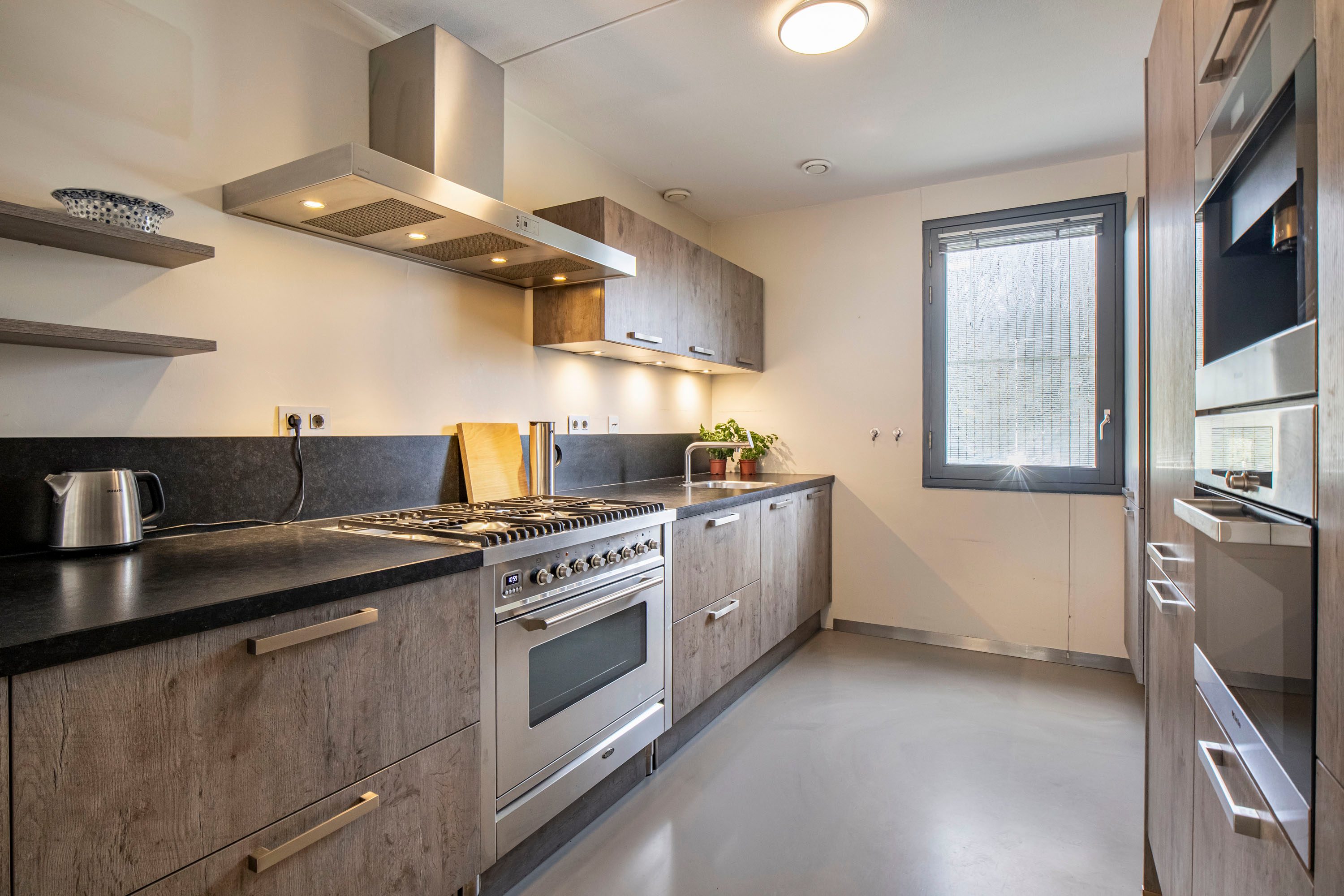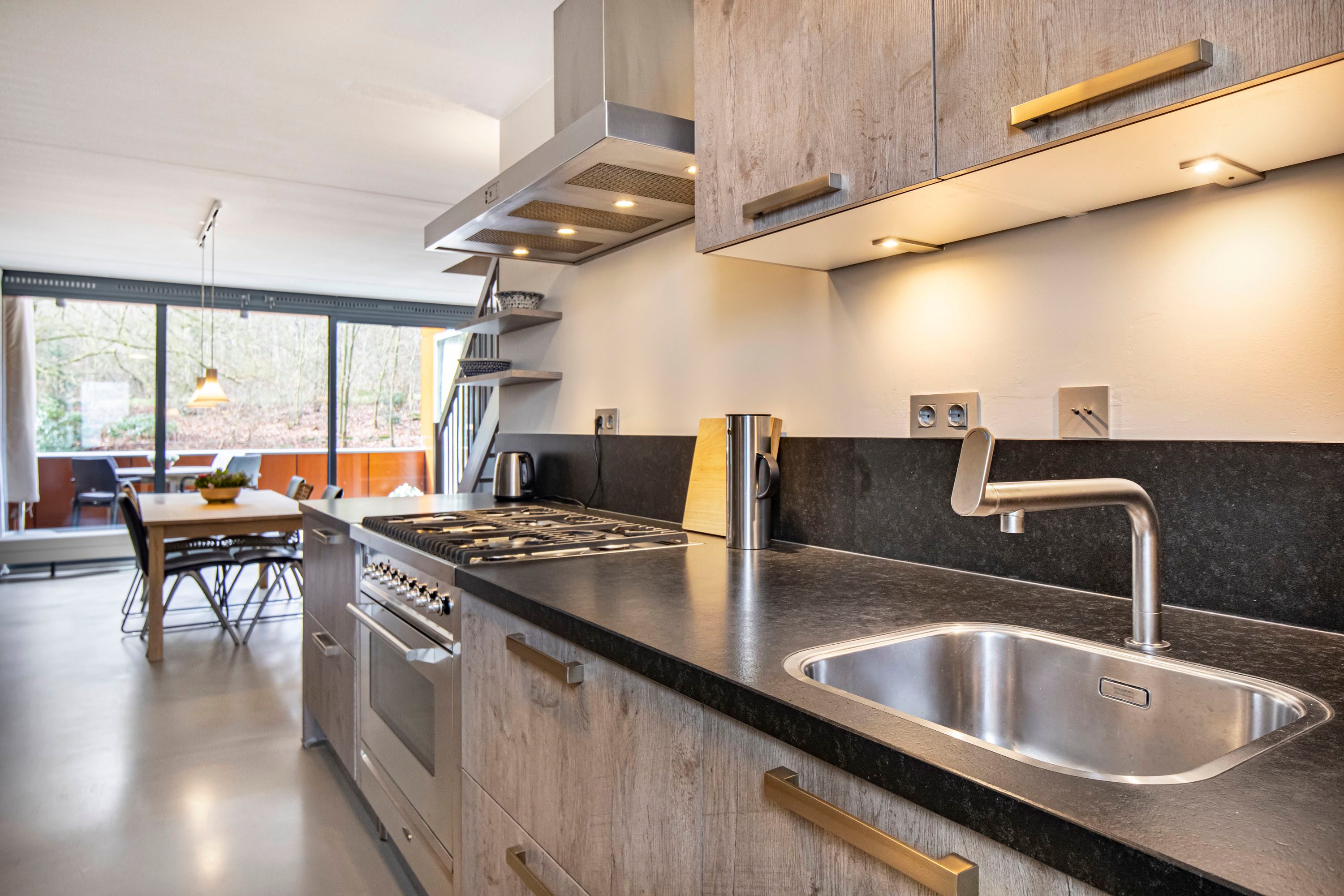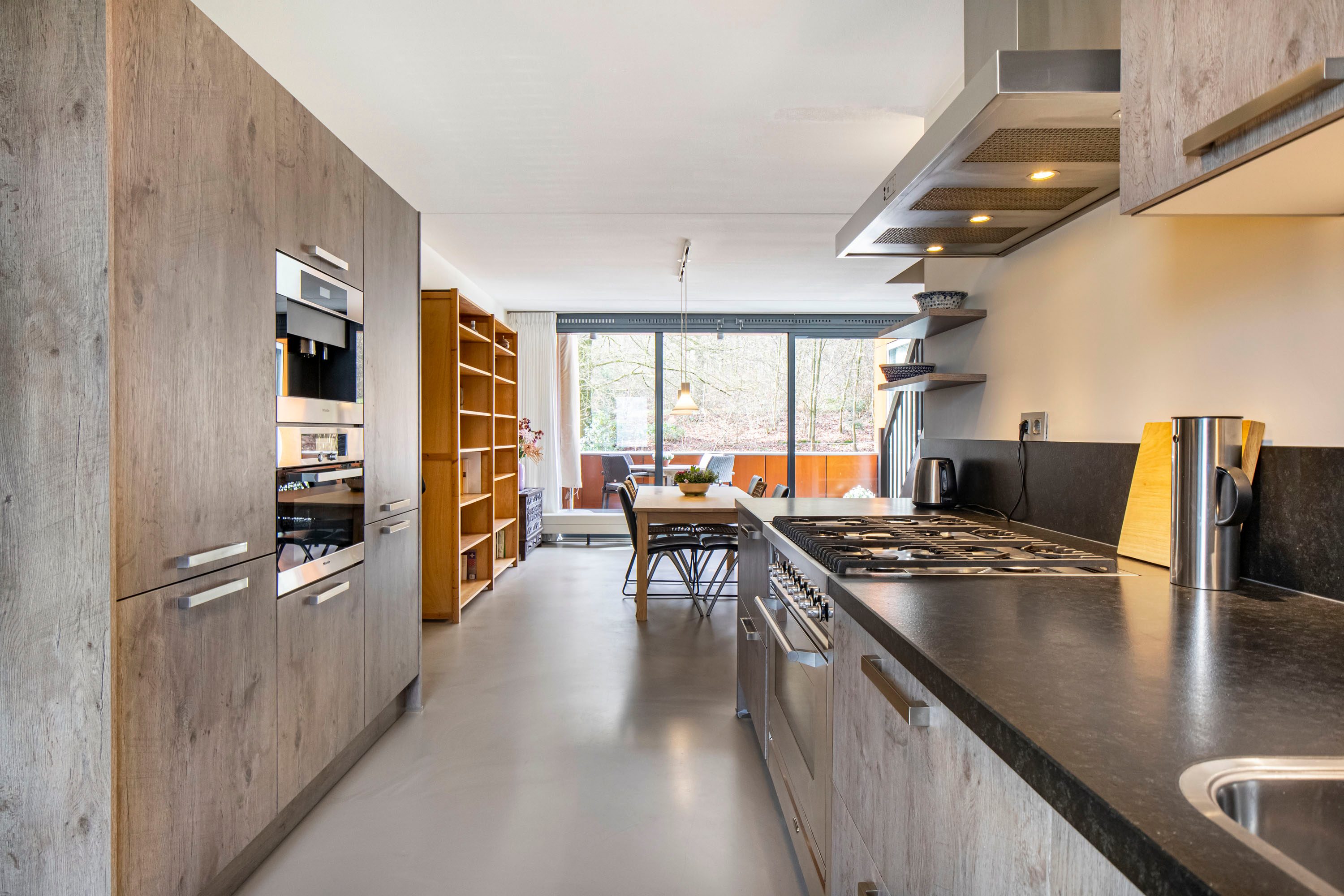 De woonverdieping vormt een prachtig licht en open geheel, waarbij de royale woonkamer van maar liefst circa 61m² direct de aandacht trekt. De grote schuifpui en de aanwezige raampartijen zorgen voor een overvloed aan daglicht en creëren een ruimtelijk en ontspannen woongevoel. In de woonkamer is bovendien airconditioning aanwezig, waardoor het hier het hele jaar door comfortabel vertoeven is. Vanuit de woonkamer loop je zo het inpandige terras op het zonnige zuidwesten op, waar je in alle privacy geniet van het groene uitzicht. De eetkamer sluit harmonieus aan op zowel de woonkamer als de keuken, waardoor een natuurlijke indeling en een fijne doorloop ontstaat. De gietvloer en de open trap versterken het moderne en luchtige karakter van deze verdieping. De halfopen keuken is uitgevoerd met warme houttint fronten en voorzien van diverse inbouwapparatuur, waaronder een Boretti fornuis met 6 pitten, een fijne plek voor iedere kookliefhebber. Op deze woonlaag bevindt zich tevens een ruime slaapkamer van circa 13m² met schuifdeurkast en een badkamer ensuite. De badkamer is uitgerust met een whirlpool, inloopdouche en wastafel. Daarnaast is er op deze verdieping een separate toiletruimte en een bergruimte met C.V. opstelling aanwezig.