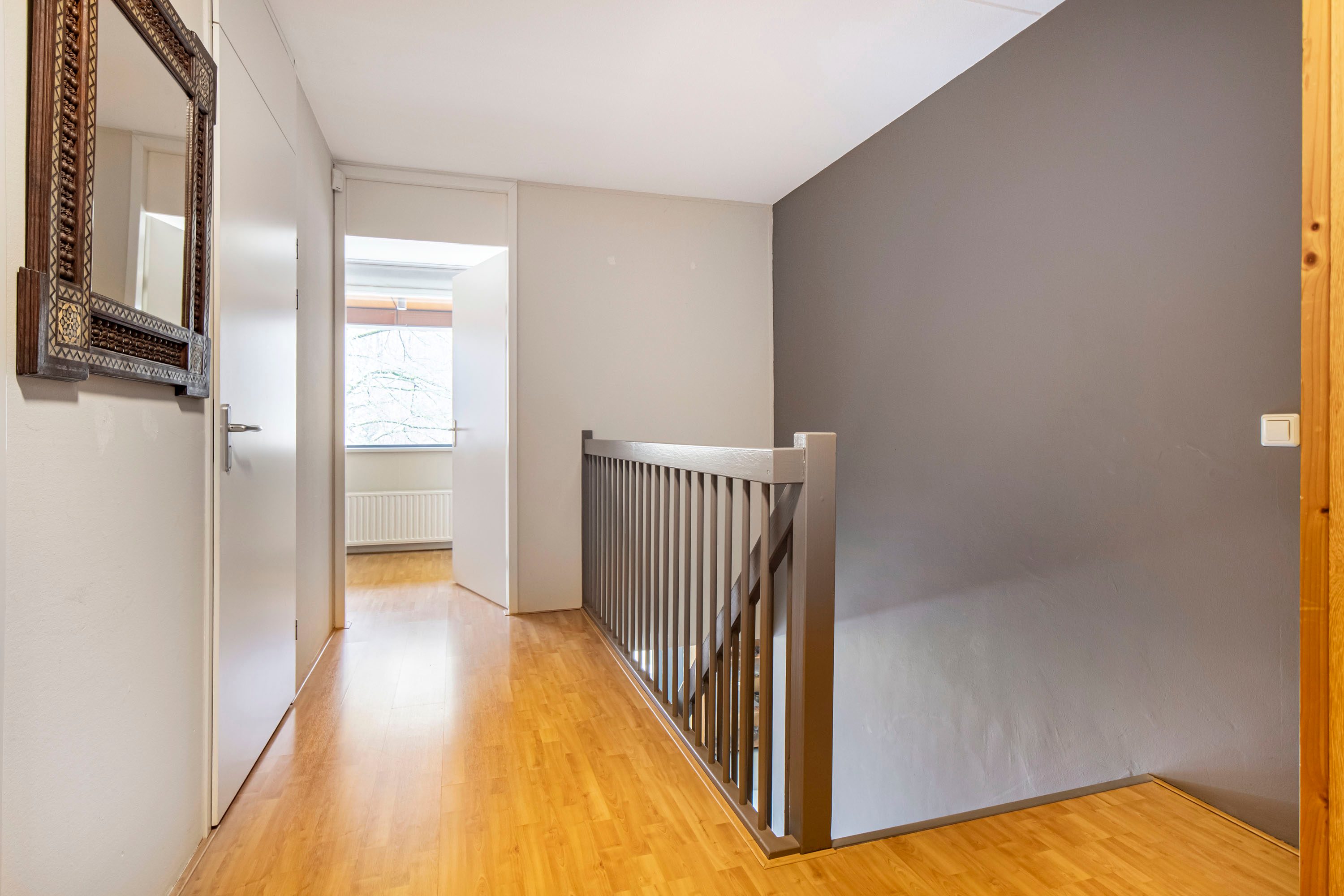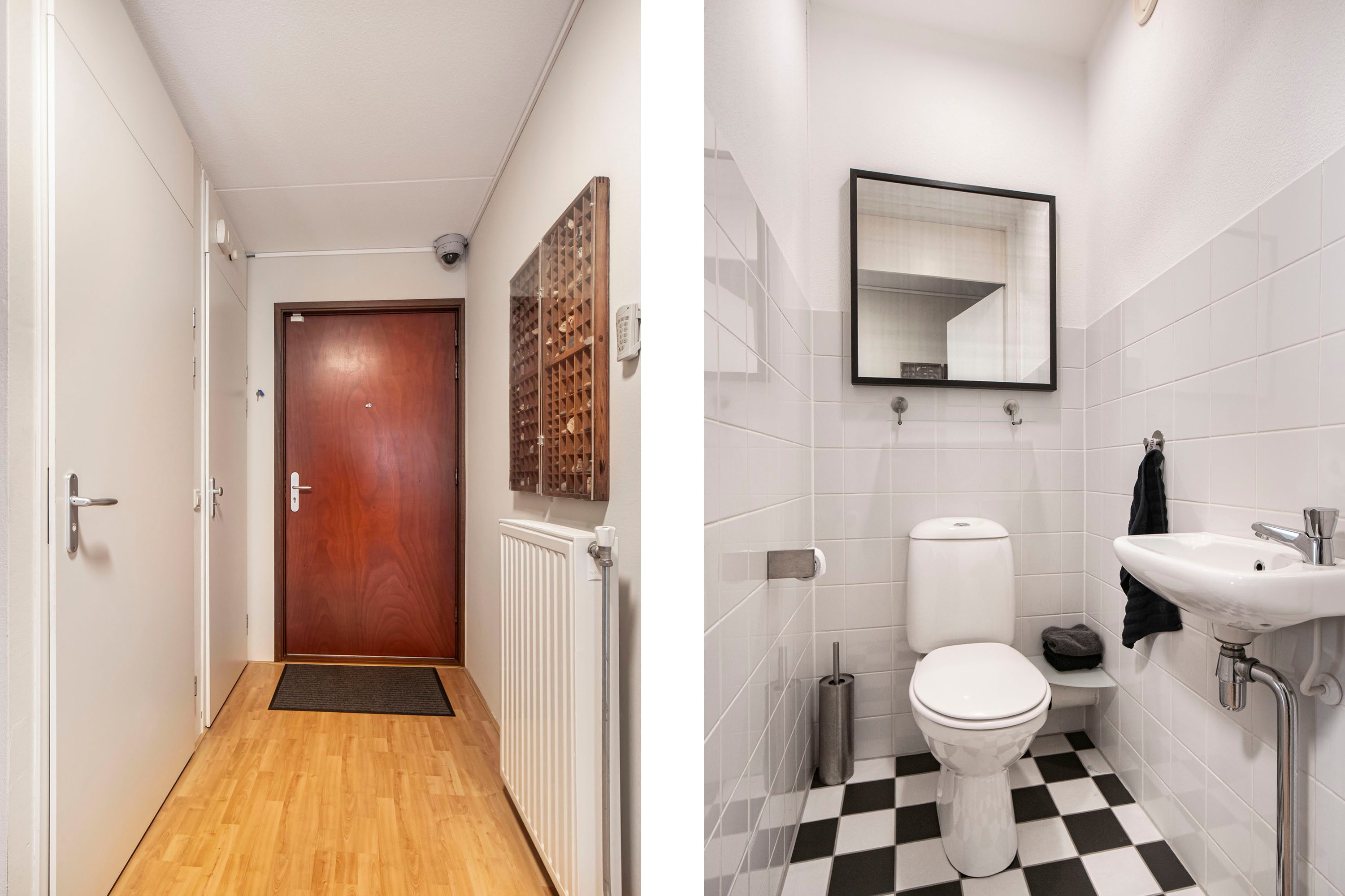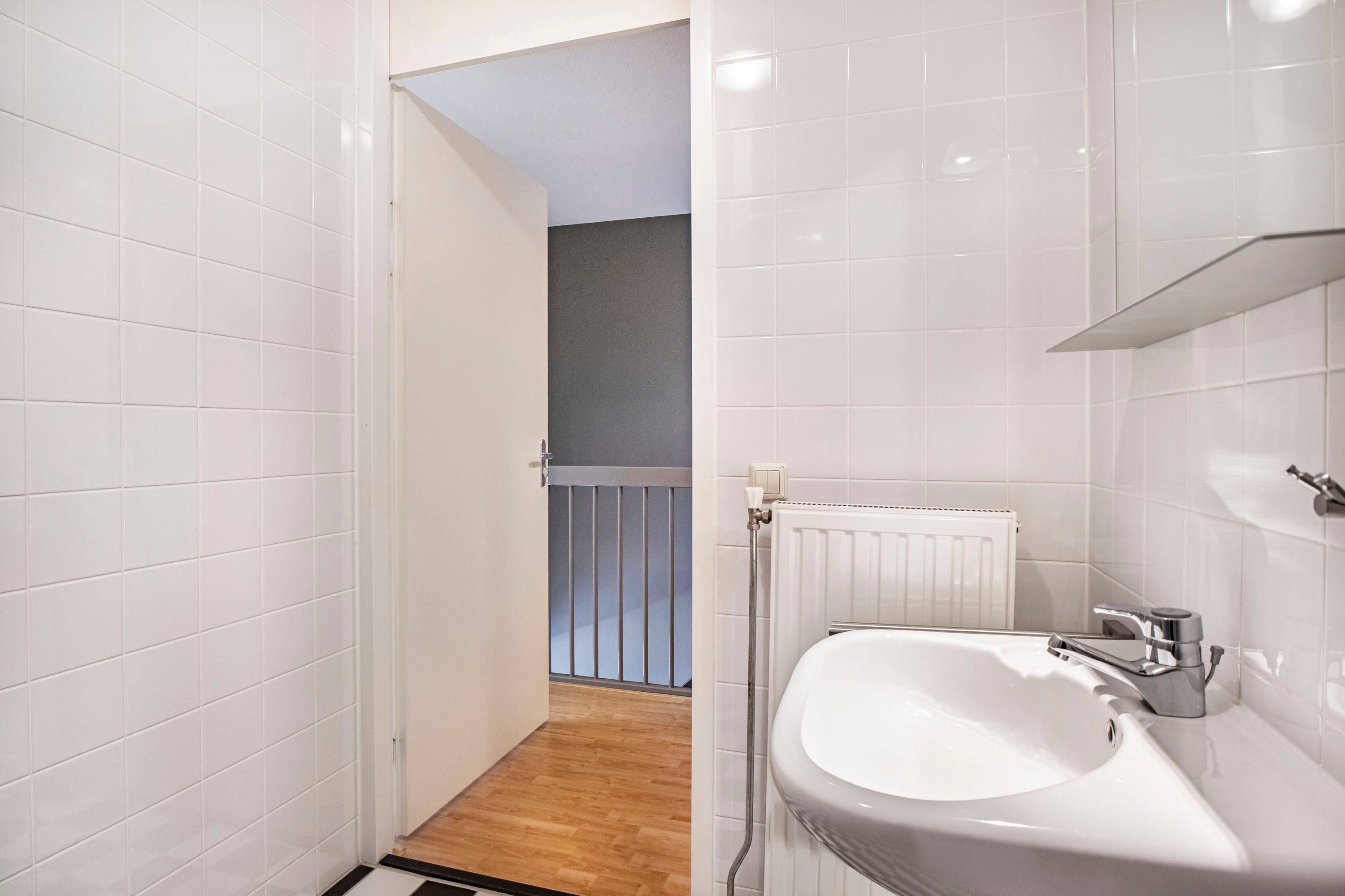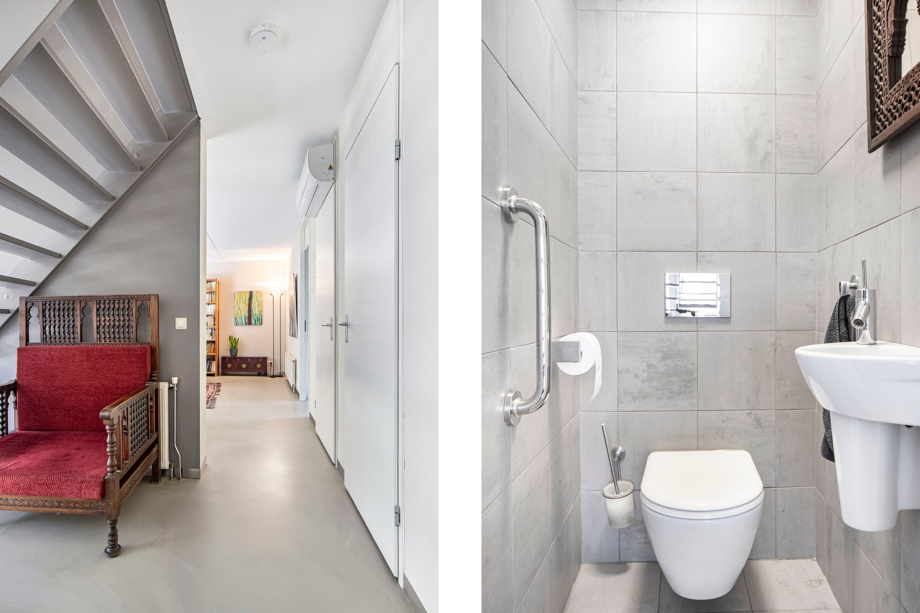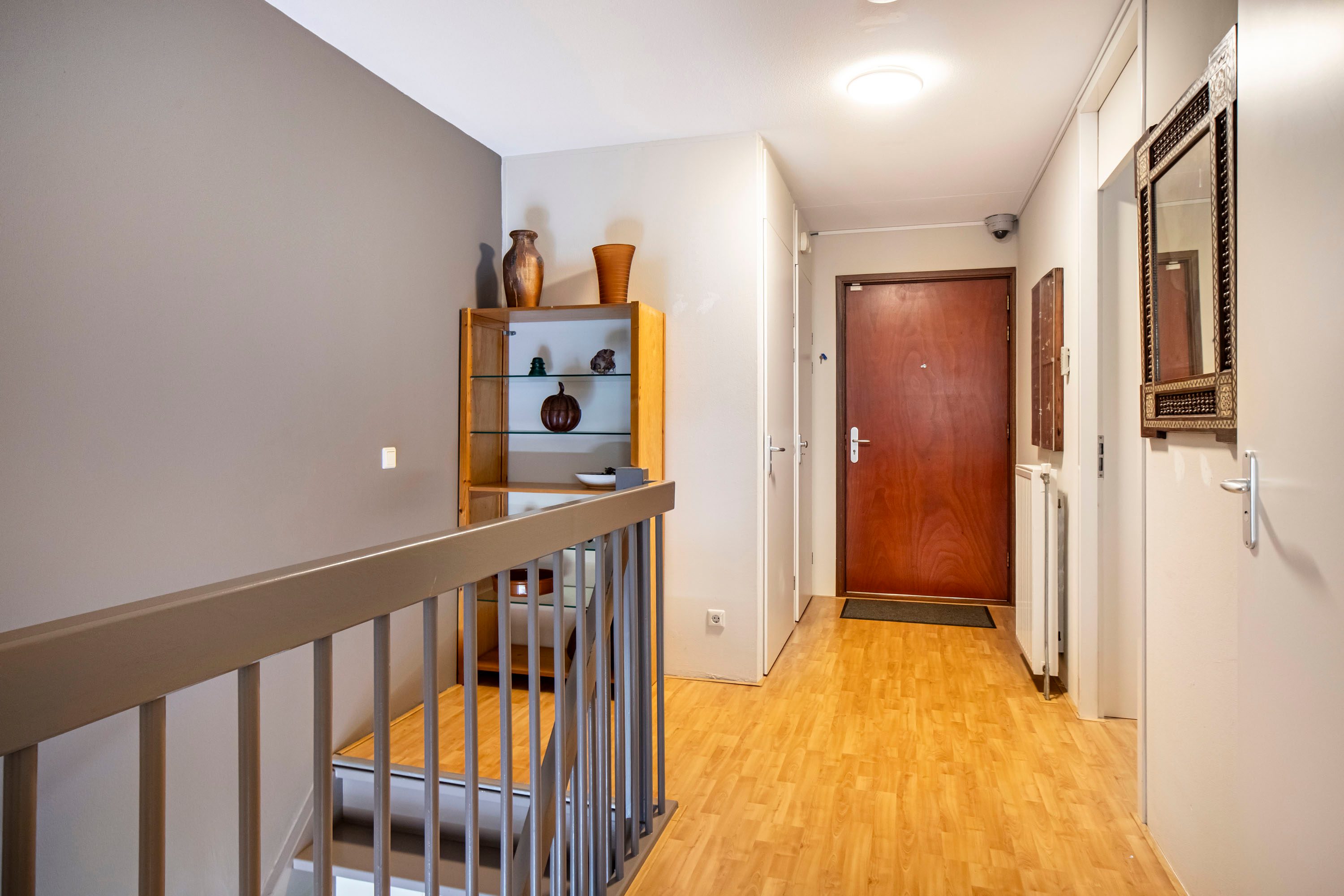 De eerste verdieping is zowel bereikbaar via de trapopgang vanaf de woonverdieping als rechtstreeks via de portiek met lift en trappenhuis. Hierdoor vormt deze woonlaag een praktische entree tot het appartement. Je komt binnen in een ruime hal met plek voor een garderobe en toegang tot de separate toiletruimte. Bovendien is het appartement eveneens toegankelijk via de keuken op de woonverdieping.