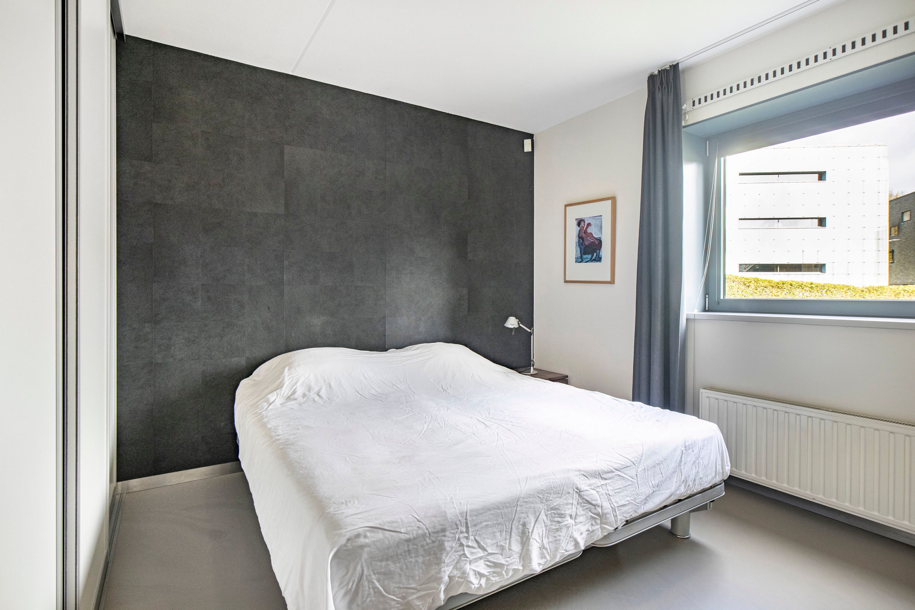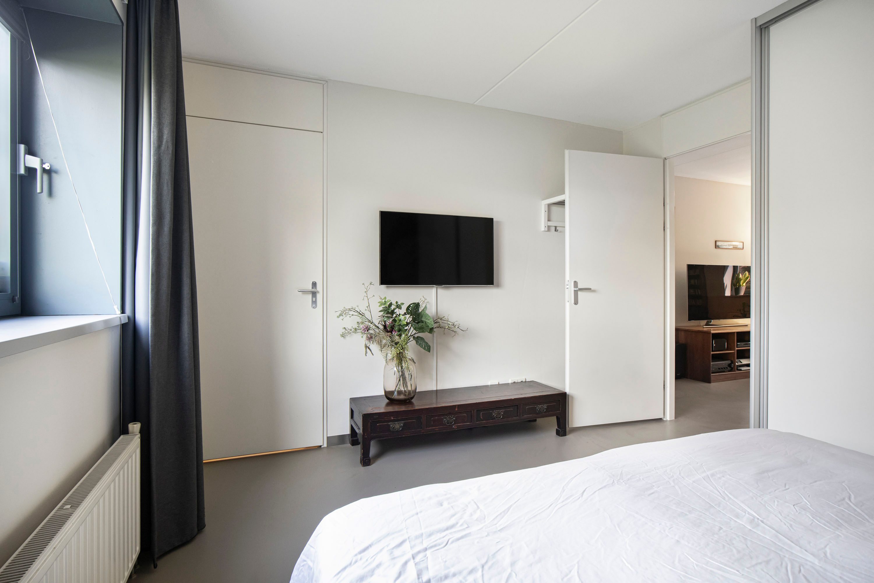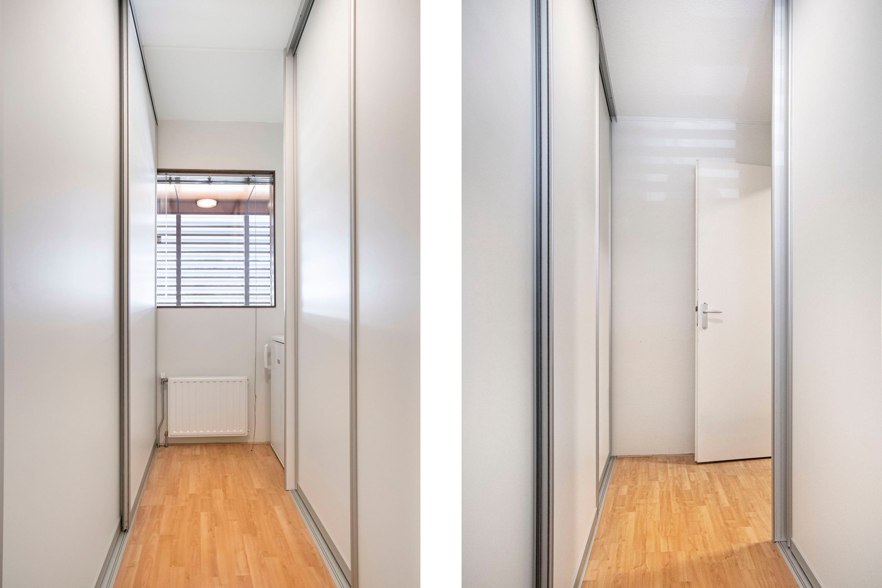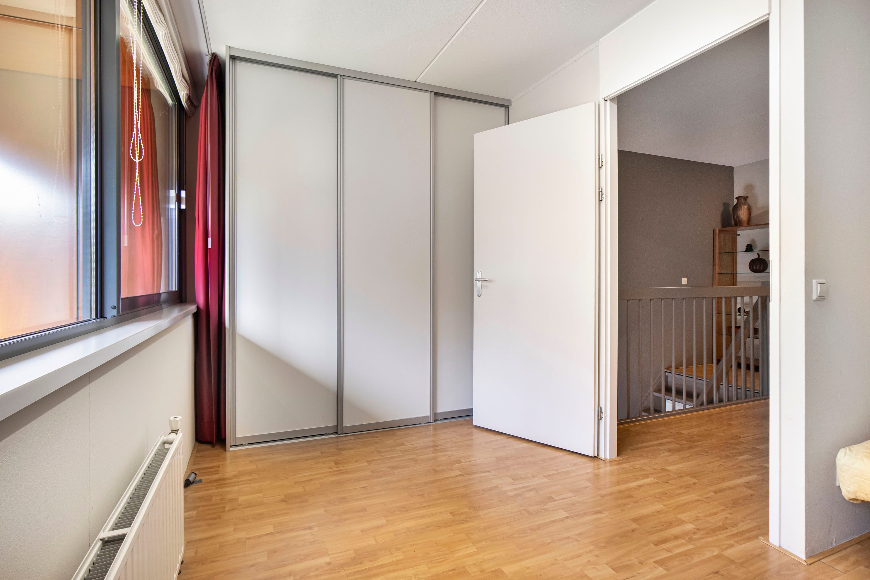 Aan de achterzijde bevindt zich een ruime slaapkamer van circa 12m². De kamer is prettig licht dankzij het brede raam en beschikt over een vaste kast, ideaal voor extra opbergruimte. Direct naast deze slaapkamer ligt de praktische tweede badkamer, voorzien van een douche, wastafel en de opstelplaats voor de wasmachine. De tweede slaapkamer op deze verdieping is momenteel ingericht als praktische kastenkamer met vaste schuifdeurkasten. Met een oppervlakte van circa 6 m² (exclusief kasten) biedt deze ruimte echter volop mogelijkheden en is deze ook uitstekend te gebruiken als slaap- of werkkamer.