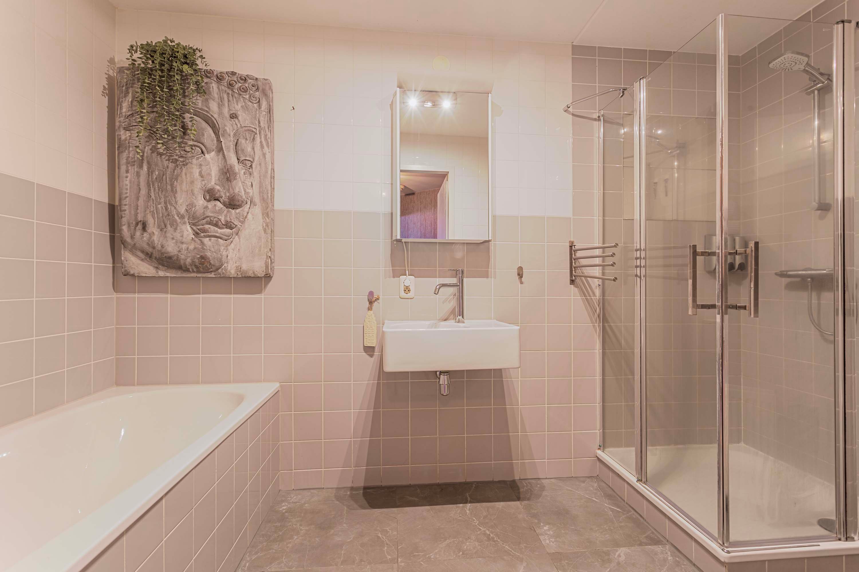 Het appartement biedt een nette badkamer met ligbad, douchecabine en wastafel. En er is een apart toilet met een fonteintje. In de waskamer/bijkeuken treft je de opstelplaats voor de mechanische ventilatie/warmte-terug-win systeem en C.V.-ketel aan. Hier bevindt zich eveneens de wasmachine/droger-aansluiting.