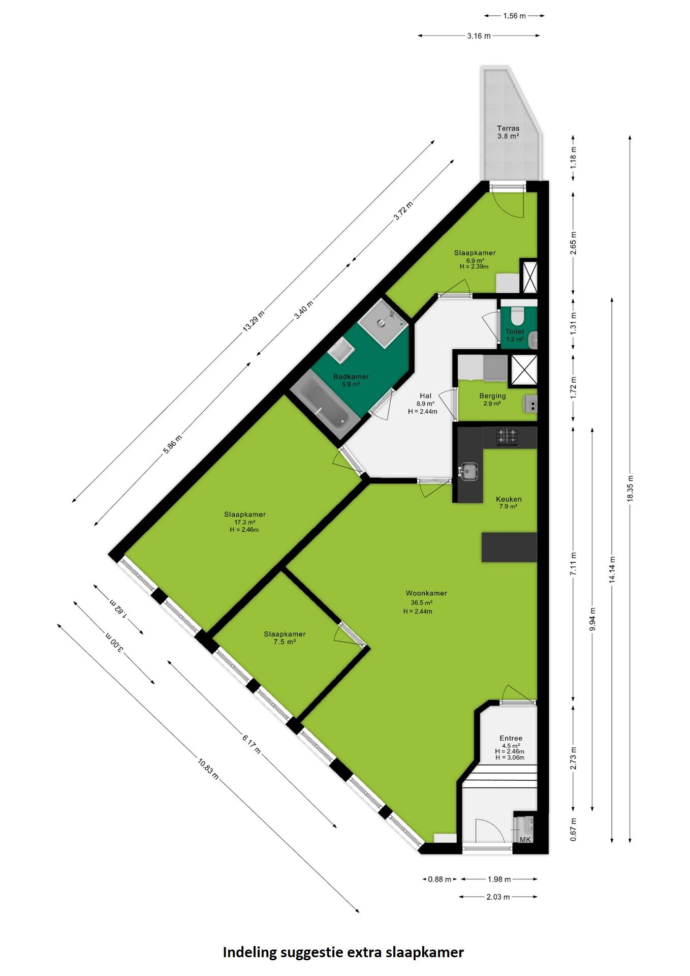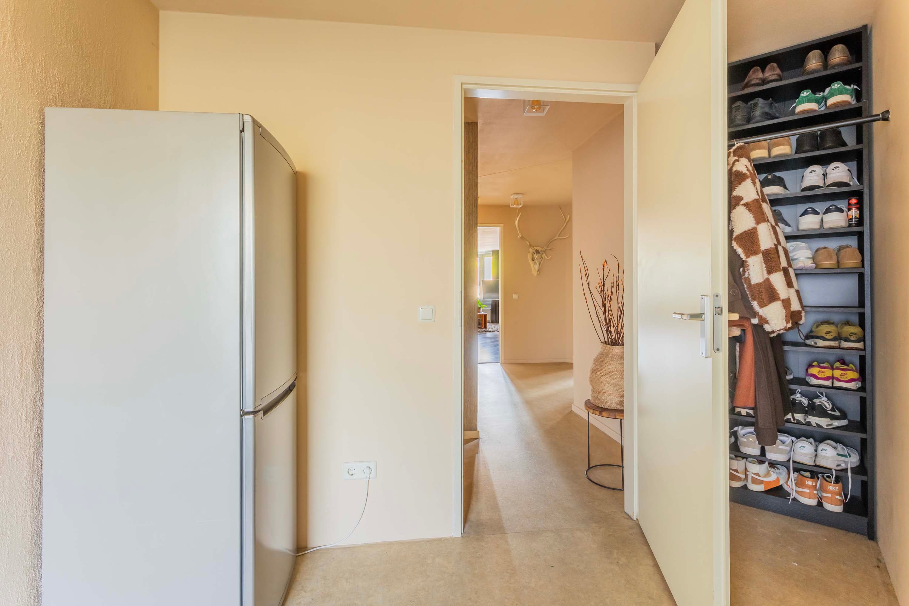 Ook vind je aan de achterzijde van de woning een -driehoekige- kamer/doorloop naar buiten voor bijvoorbeeld een thuiswerkplek, opslag of (kleding)kasten.