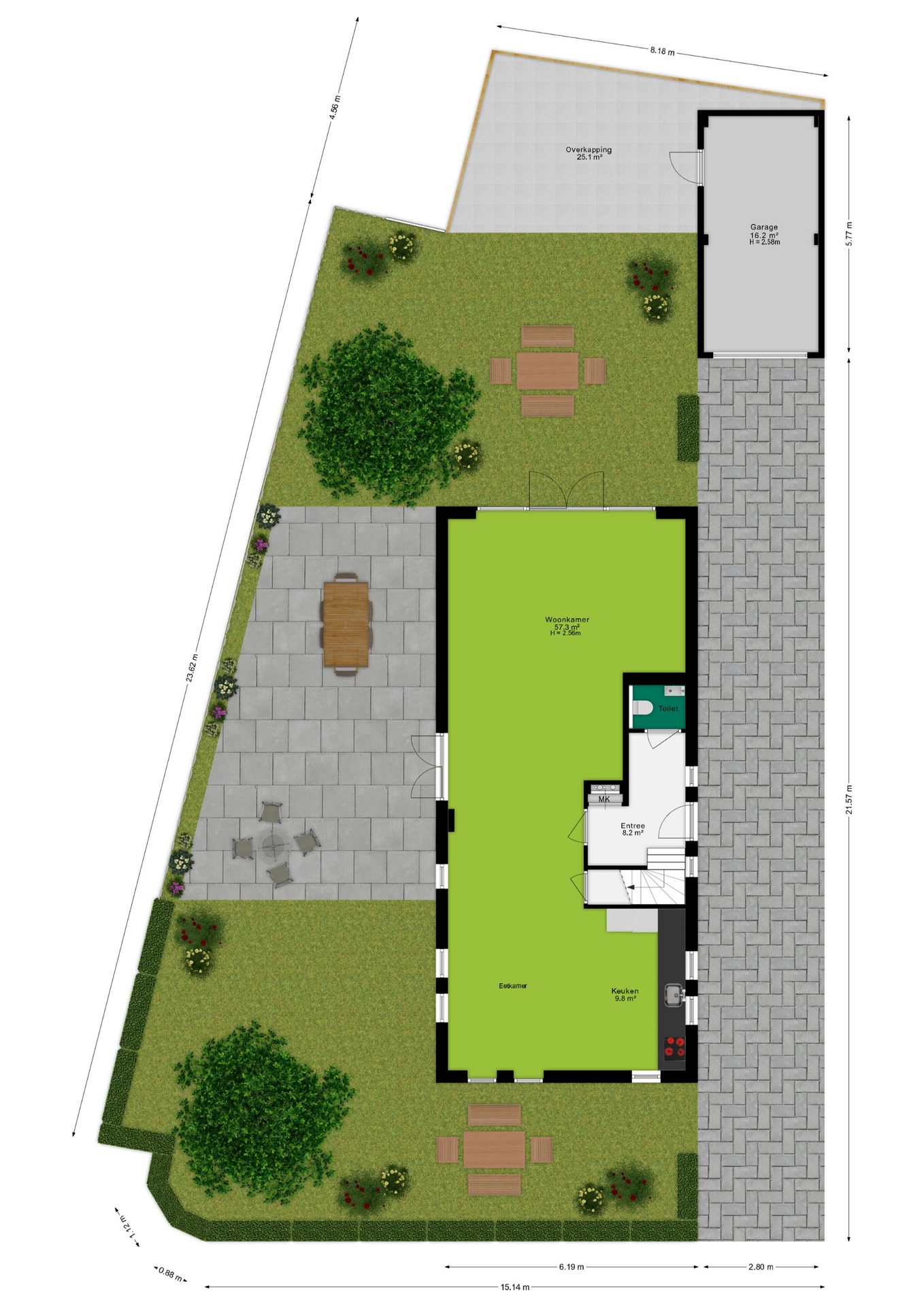 Rondom de woning liggen een voor-, zij- en achtertuin, waardoor je op elk moment van de dag optimaal kunt genieten van het buitenleven en de zon. De achtertuin, gunstig gelegen op het zonnige zuiden, voelt aan als een waar verlengstuk van de woning en biedt volop ruimte om te ontspannen, te spelen en te genieten. Achterin de tuin is een sfeervolle overkapping gerealiseerd, dé perfecte plek voor lange, gezellige avonden met familie en vrienden, tot in de late uurtjes. De ruime tuin zorgen ervoor dat je altijd een fijne zitplek kunt kiezen, in de zon of juist in de schaduw. Dankzij de gunstige ligging ervaar je hier bovendien veel rust en privacy. De tuin aan de zijkant leent zich uitstekend als speelplek voor kinderen of voor het plaatsen van ligbedden, terwijl de garage, direct grenzend aan de overkapping, praktisch én comfortabel is dankzij de elektrisch bedienbare deur. Een heerlijke buitenruimte waar comfort, gezelligheid en functionaliteit perfect samenkomen.