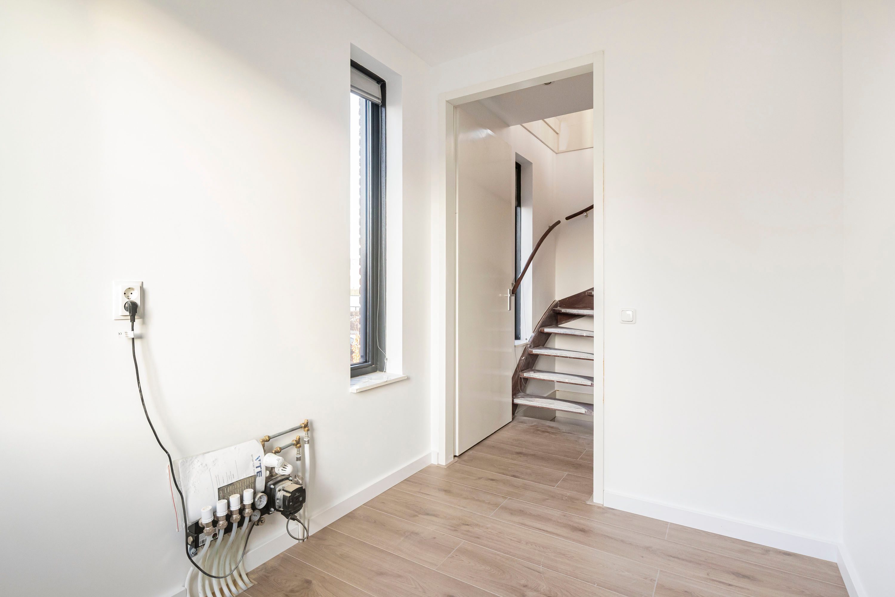 De overloop vormt het centrale punt van deze verdieping en biedt toegang tot drie comfortabele slaapkamers, een moderne luxe badkamer en een praktische was-/bergruimte. Alle slaapkamers zijn prettig van formaat, elk met een oppervlakte van circa 10 m², en zijn afgewerkt met een strakke vloer voorzien van vloerverwarming, wat zorgt voor extra comfort en een luxe uitstraling. De badkamer is recent vernieuwd en hoogwaardig afgewerkt met een moderne en stijlvolle opstelling. Hier beschik je over een ruime inloopdouche, een dubbele wastafel met fraai wastafelmeubel en een toilet. De kleurstelling waant je in een luxe setting en de doordachte indeling creëren een fijne wellness achtige sfeer, waar ontspanning en gebruiksgemak samenkomen. Daarnaast bevindt zich op deze verdieping een aparte was-/ en bergruimte, ideaal voor het netjes opbergen van huishoudelijke spullen en het praktisch inrichten van de was opstelling. Kortom, een verdieping waar comfort, luxe en functionaliteit perfect in balans zijn.