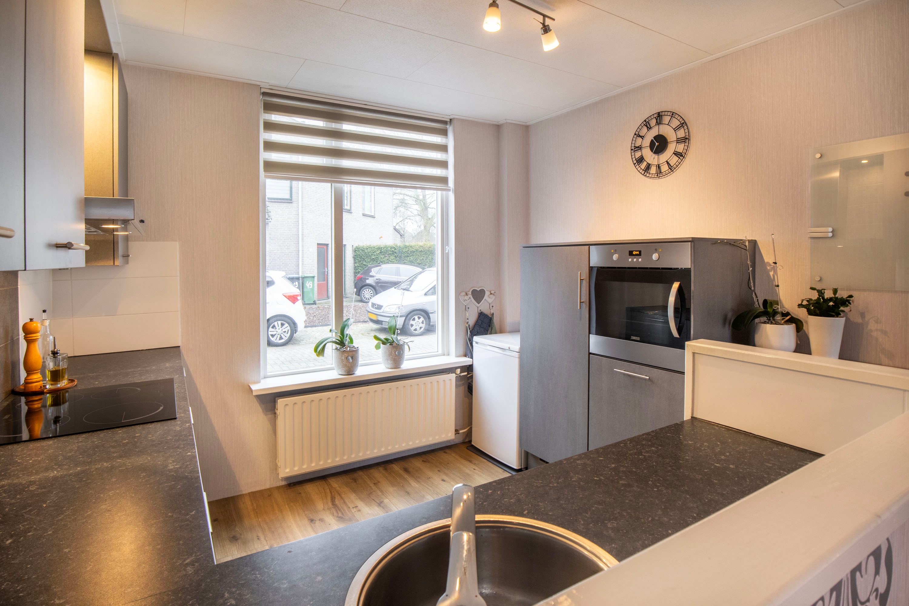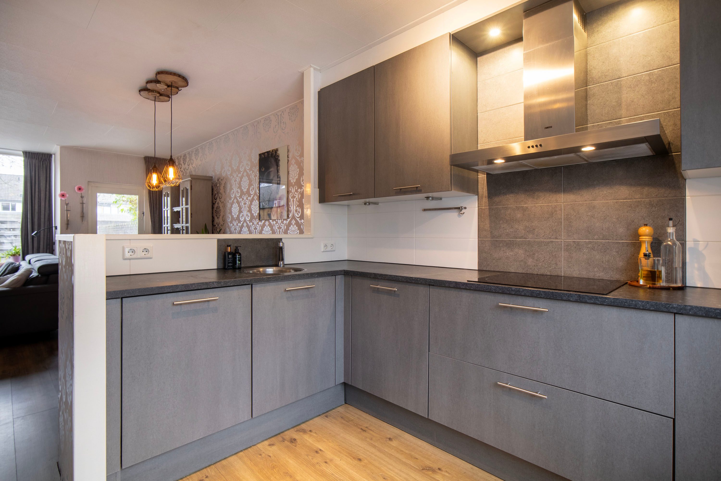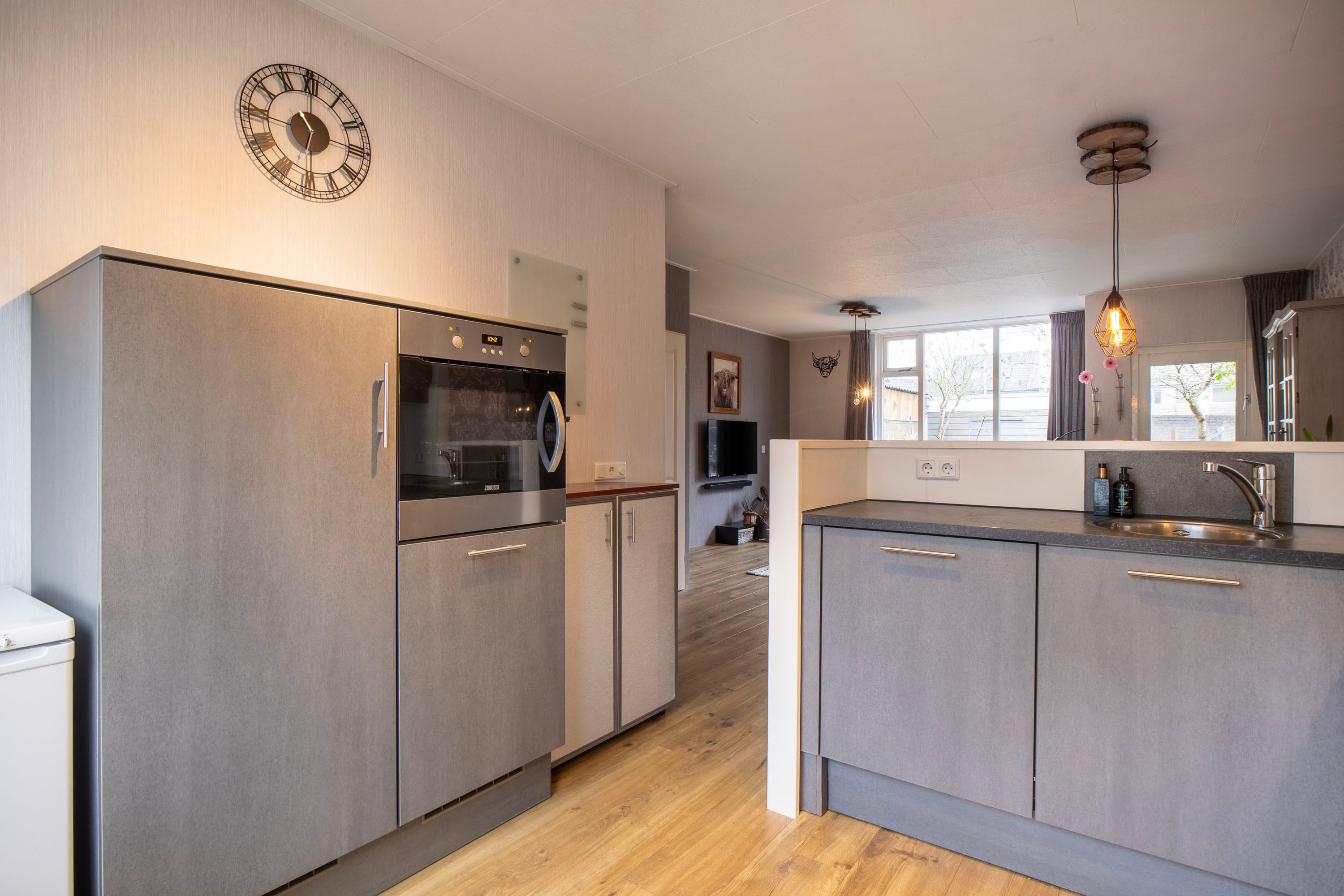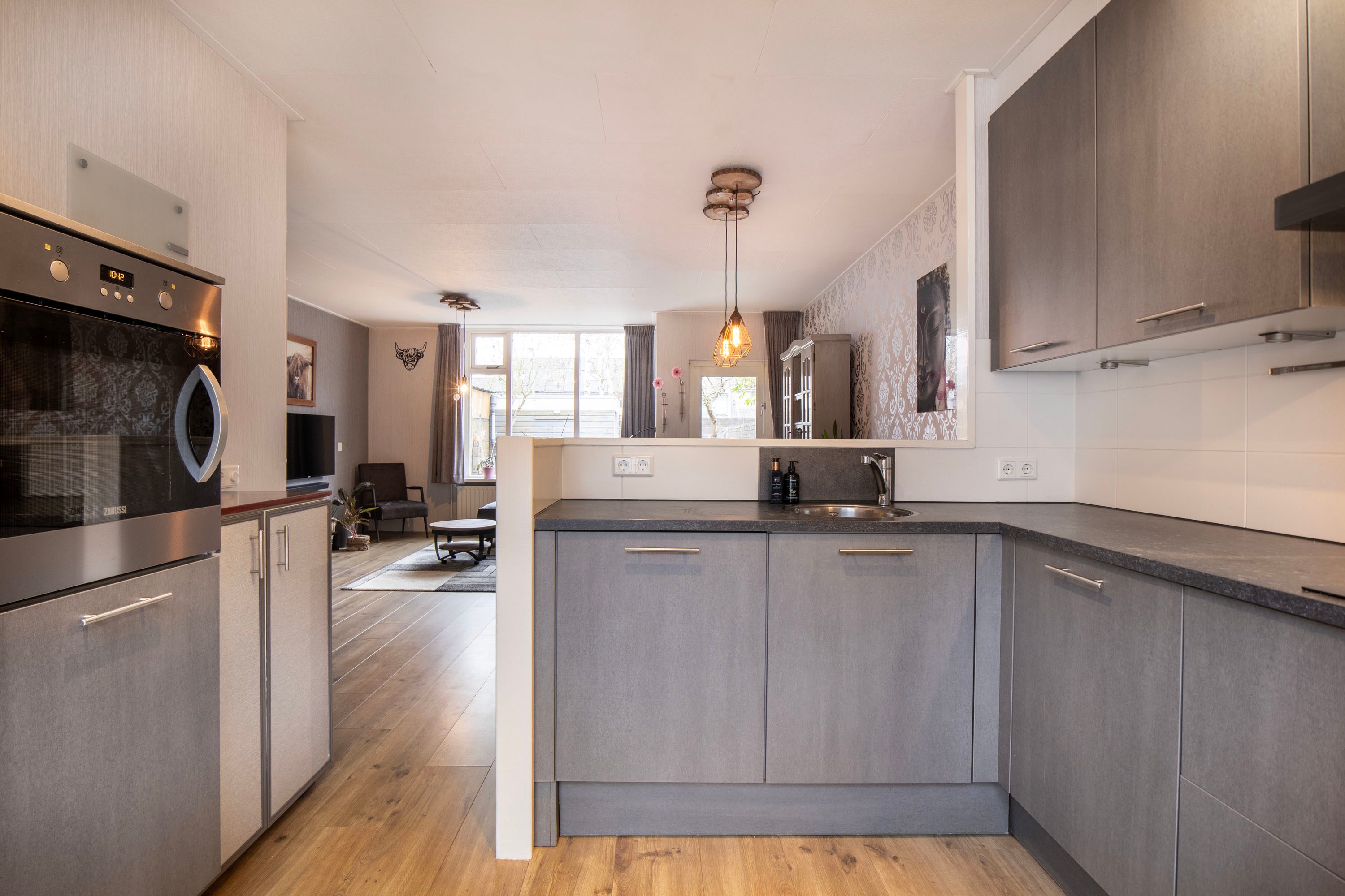 De open keuken staat in directe verbinding met het woon- en eetgedeelte. Door de lage afscheiding, waarin het aanrecht met spoelbak is verwerkt, ontstaat extra werkruimte op een efficiënte manier zonder het open karakter te verliezen. De keuken is voorzien van een oven, inductiekookplaat met afzuigkap, vaatwasser, koelkast en een losse vriezer. De spotjes boven het werkblad zorgen voor prettig werklicht en het grote raam draagt bij aan een aangename lichtinval.