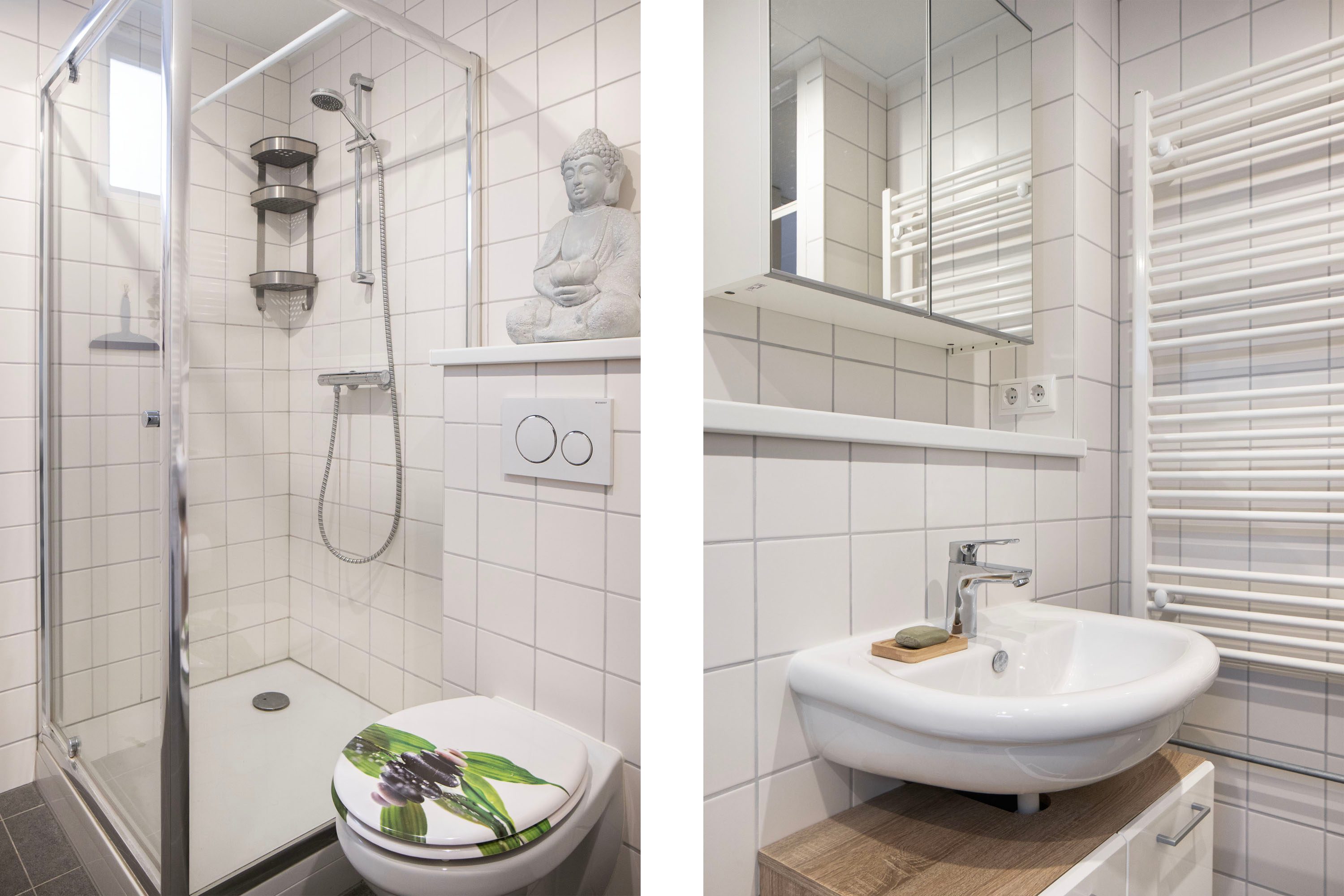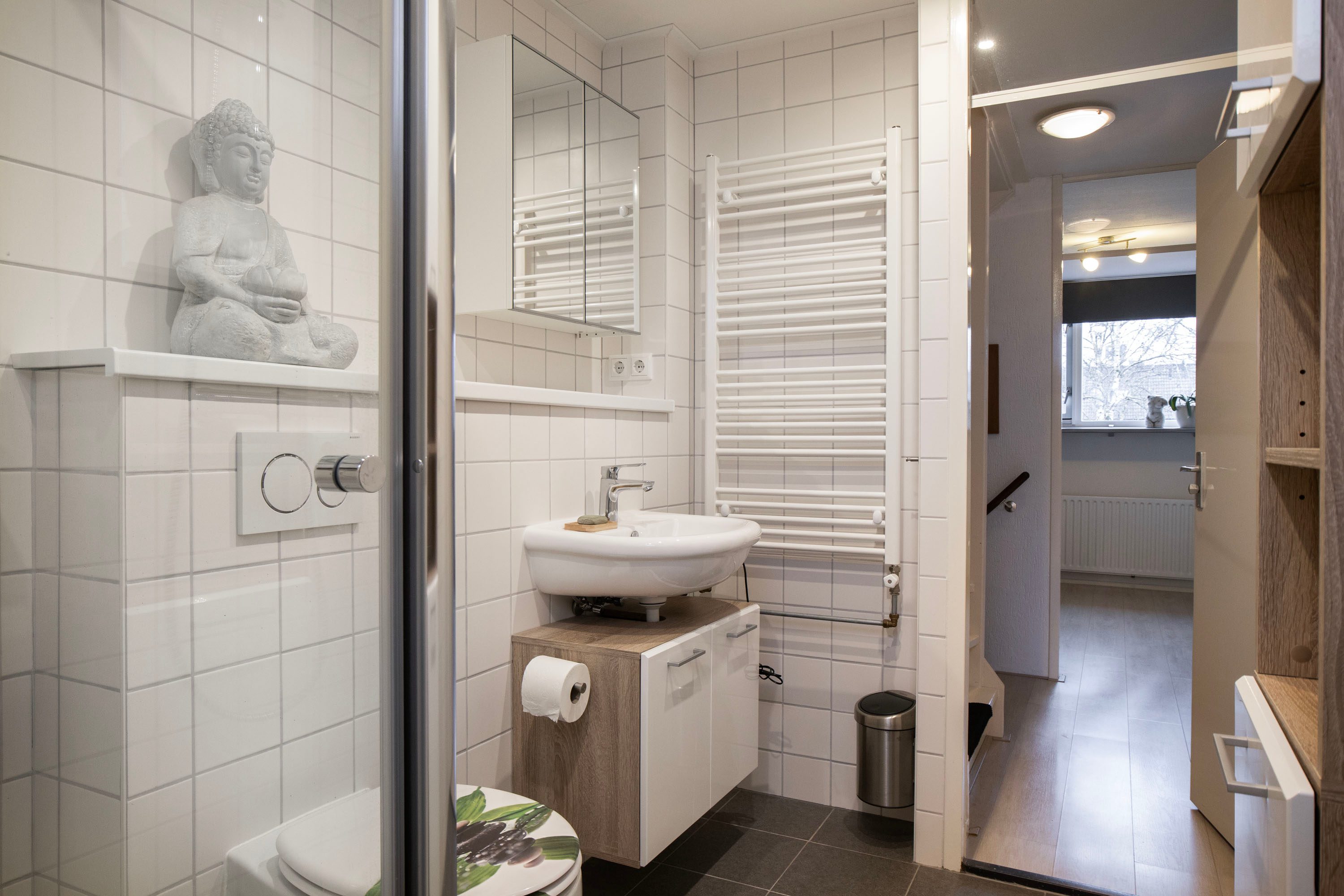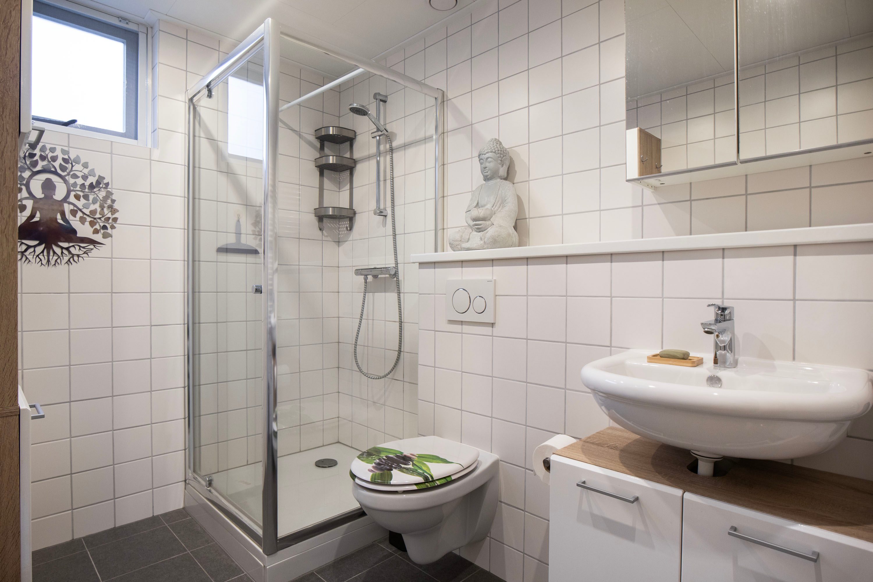 De badkamer is uitgerust met een douche, toilet, wastafel met meubel en een radiator. De ruimte is volledig betegeld, wat het onderhoud eenvoudig maakt.