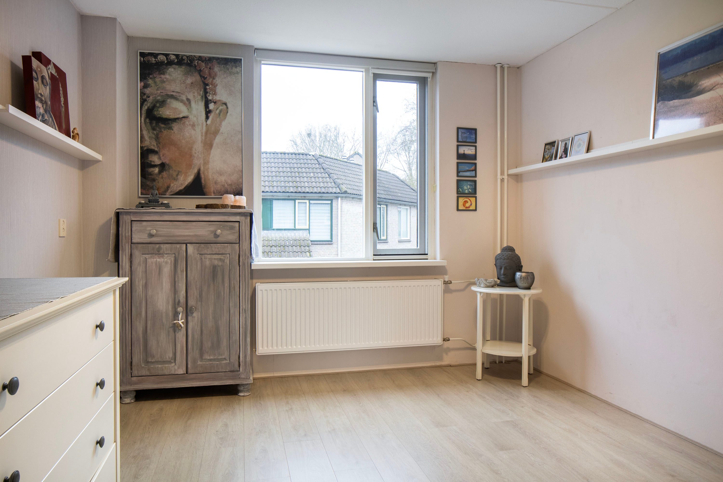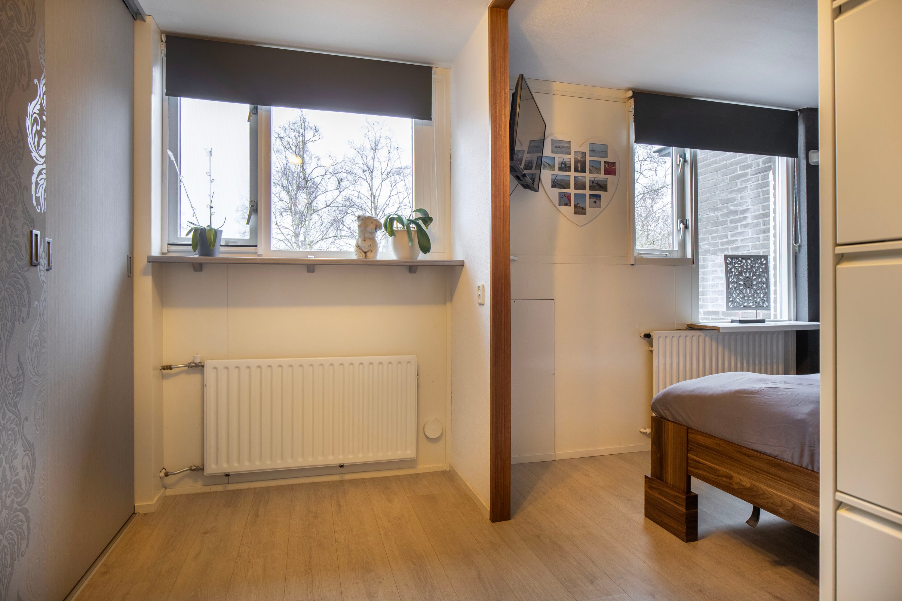 De tweede slaapkamer van circa 12 m² bevindt zich aan de voorzijde van de woning en is een lichte, prettige ruimte die uitstekend geschikt is als (kinder)slaapkamer, werk- of hobbykamer.