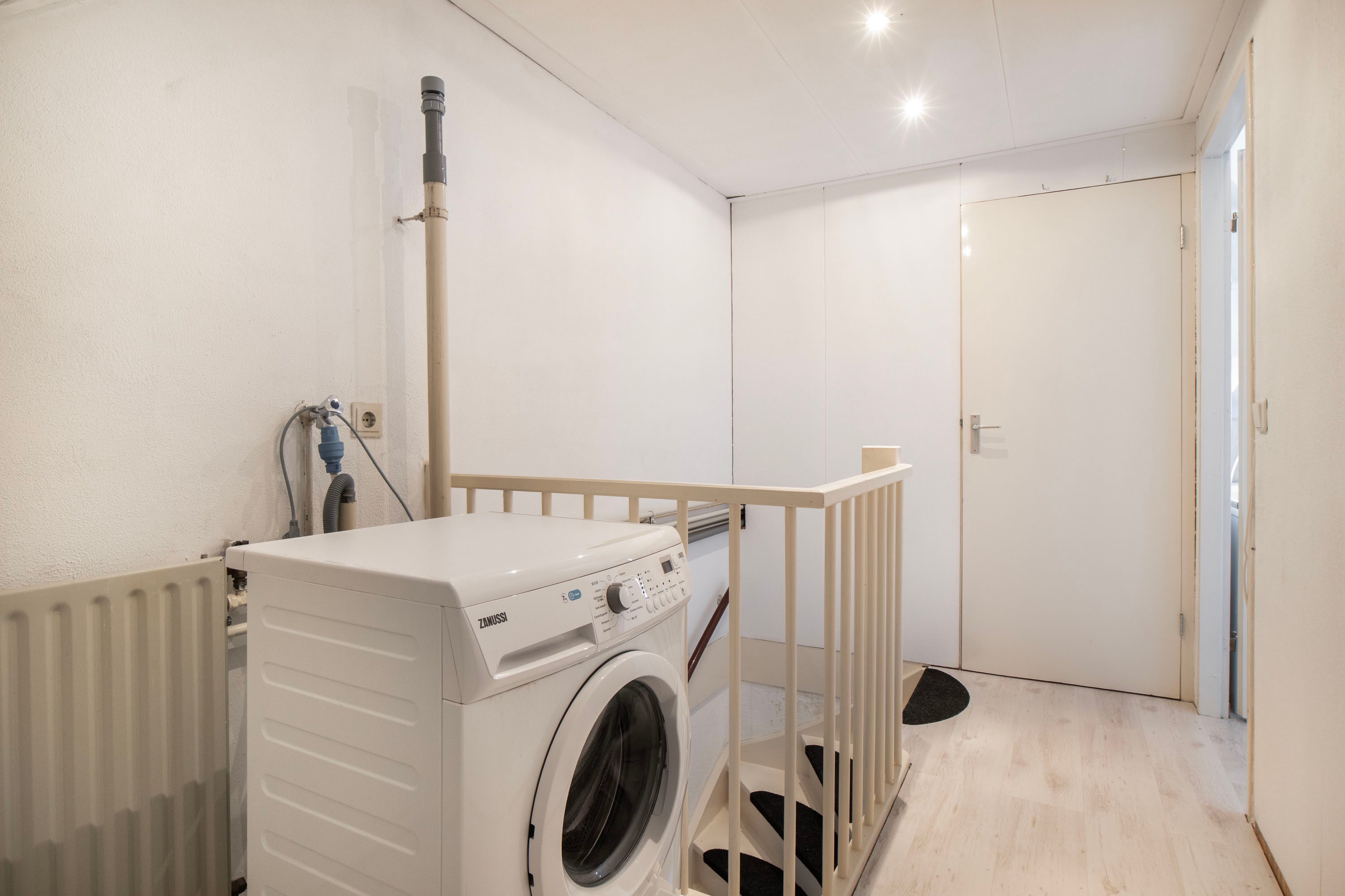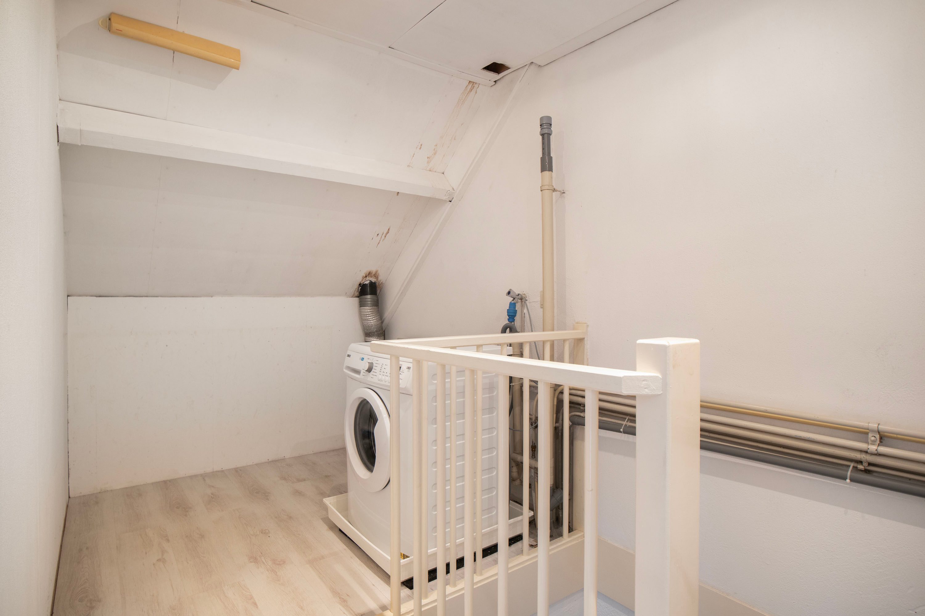 Via de trap bereik je de tweede verdieping. Je komt uit op de overloop waar de wasmachineaansluiting zich bevindt. Hier is tevens voldoende ruimte om een praktische washoek te creëren en bijvoorbeeld de was te drogen.