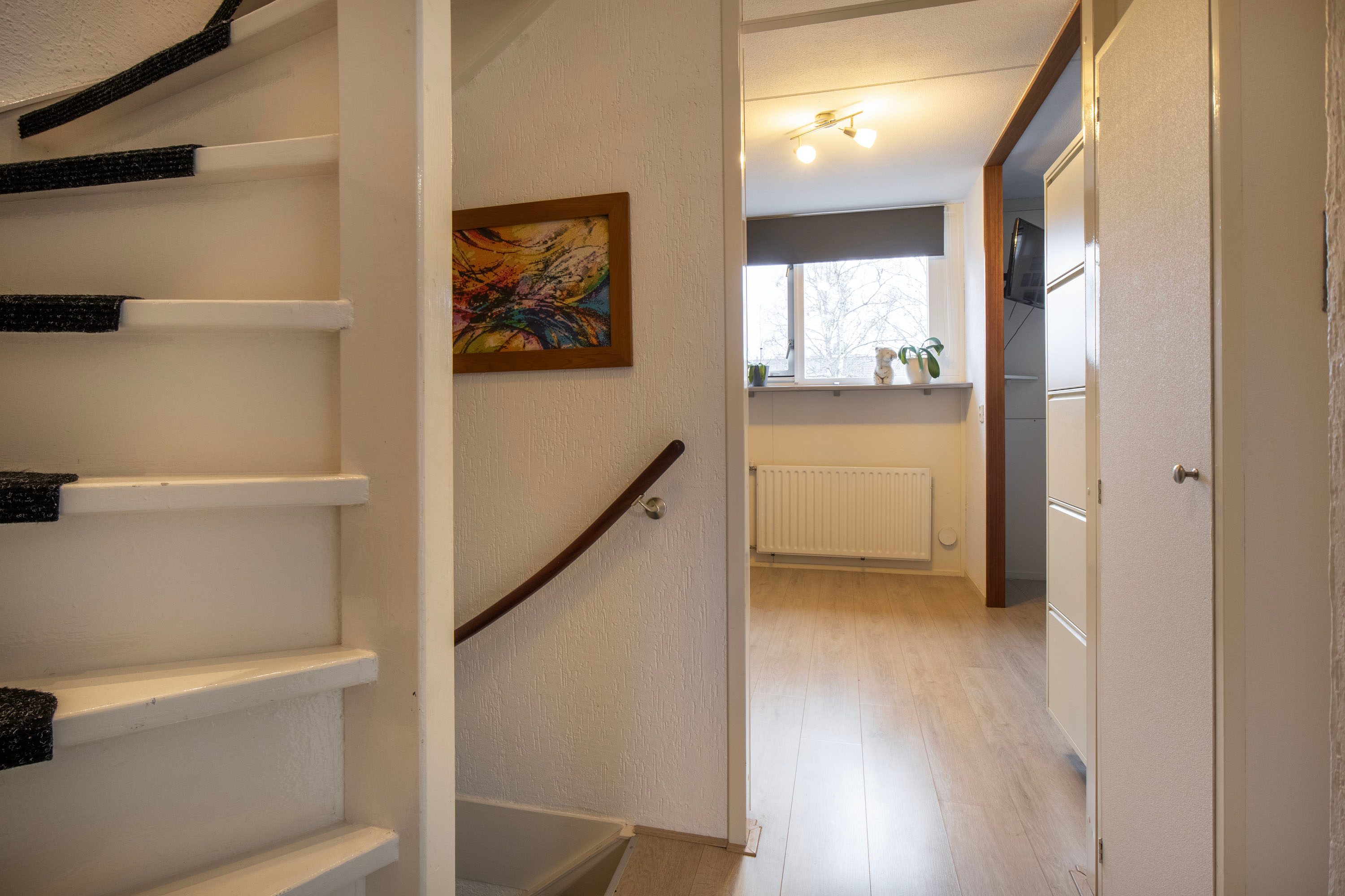 Via de trap in de hal bereik je de eerste verdieping, waar zich twee slaapkamers en de badkamer bevinden.