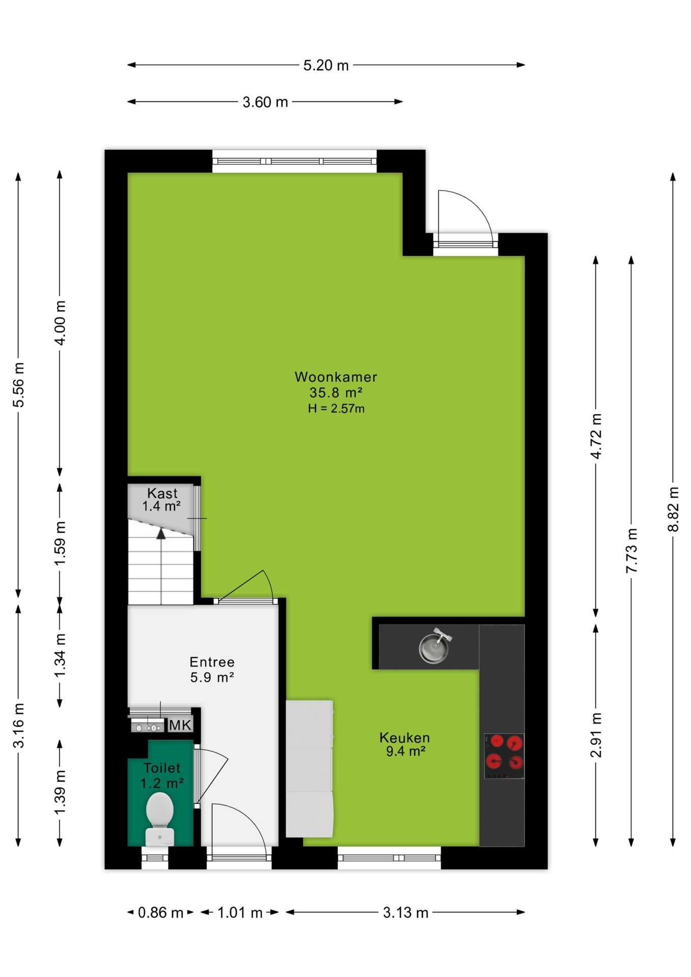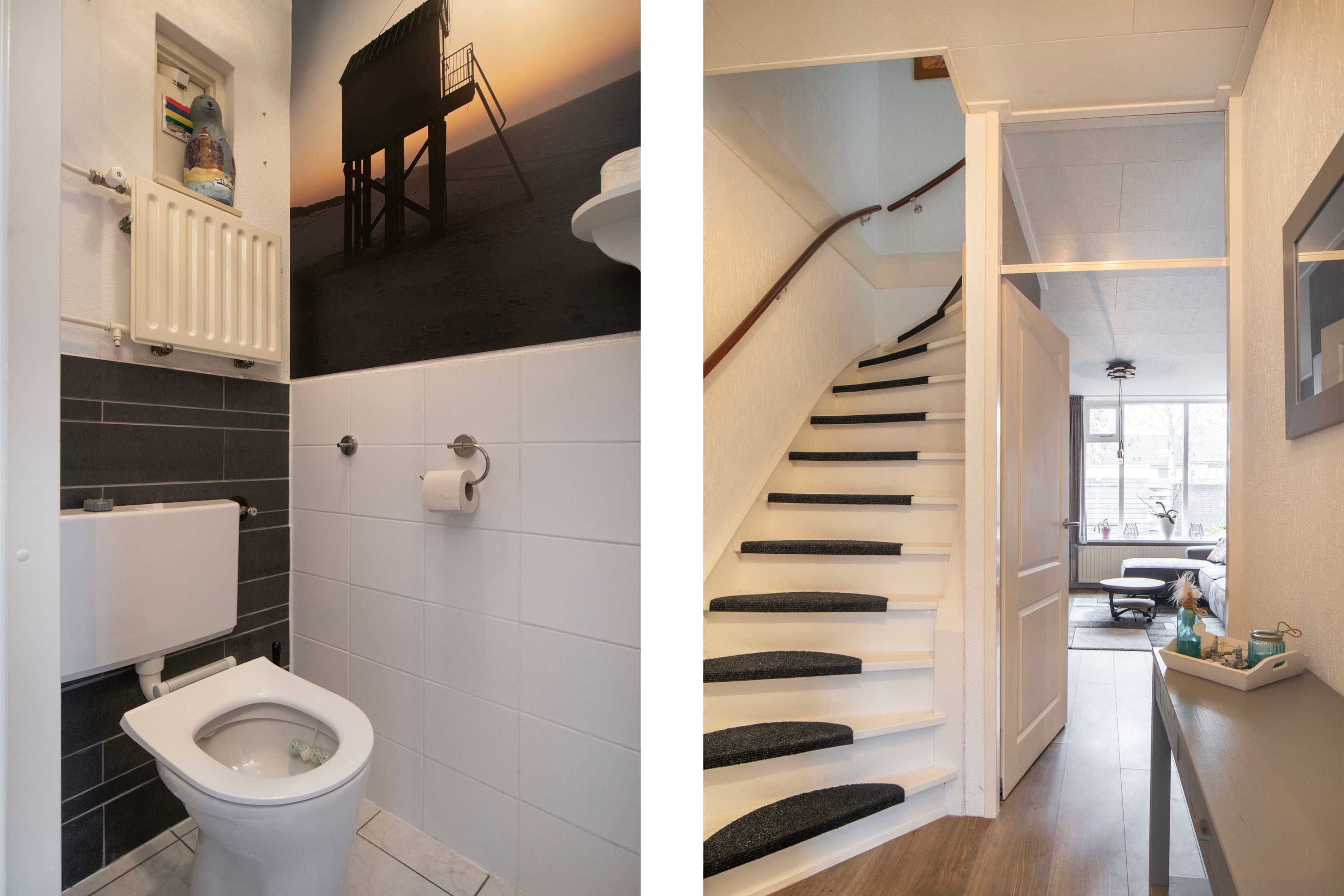 Bij binnenkomst betreed je de hal met het toilet, meterkast, trapopgang naar de eerste verdieping en toegang tot de woonkamer.