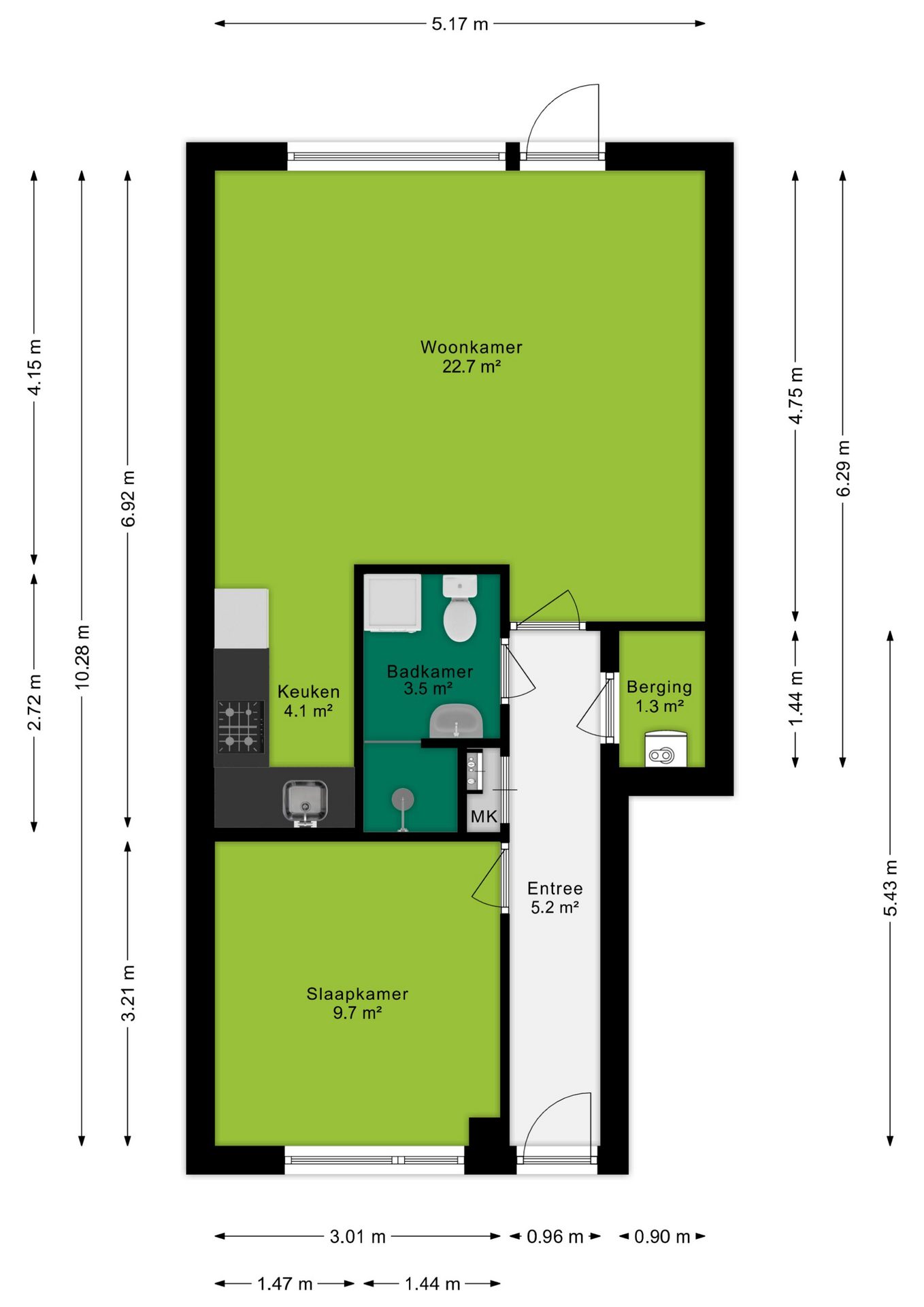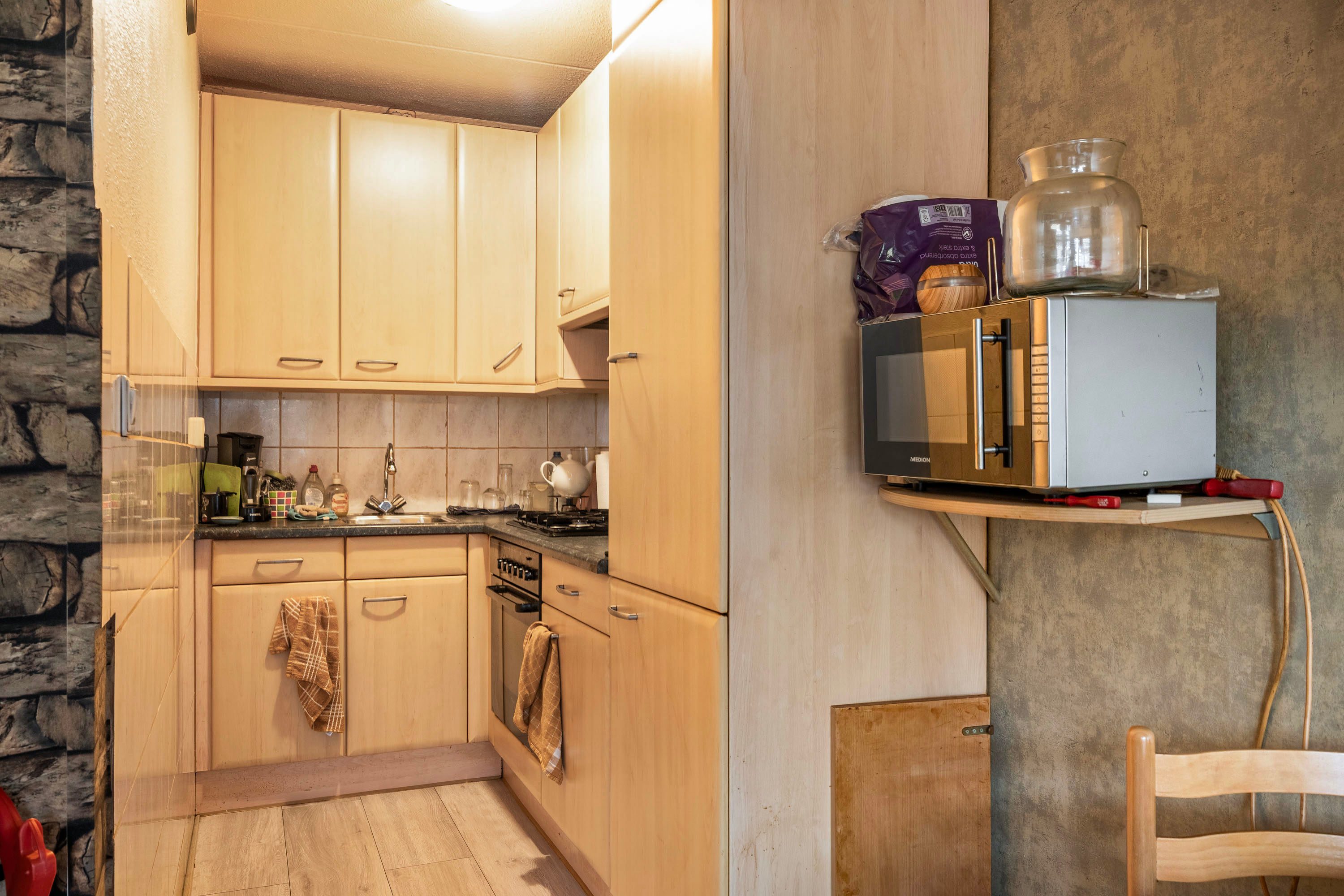 Via de entree van 5,2 m², waar ook de meterkast is geplaatst, bereik je de lichte woonkamer van 22,7 m². Deze ruimte biedt voldoende plek voor een hoekbank en een knus zitgedeelte. Het grote raam aan de achterzijde zorgt voor prettig natuurlijk licht. De halfopen, L-vormige keuken van 4,1 m² is compact maar praktisch ingericht en voorzien van diverse inbouwapparatuur zoals een kookplaat, afzuigkap, oven en koel-vriescombinatie.
