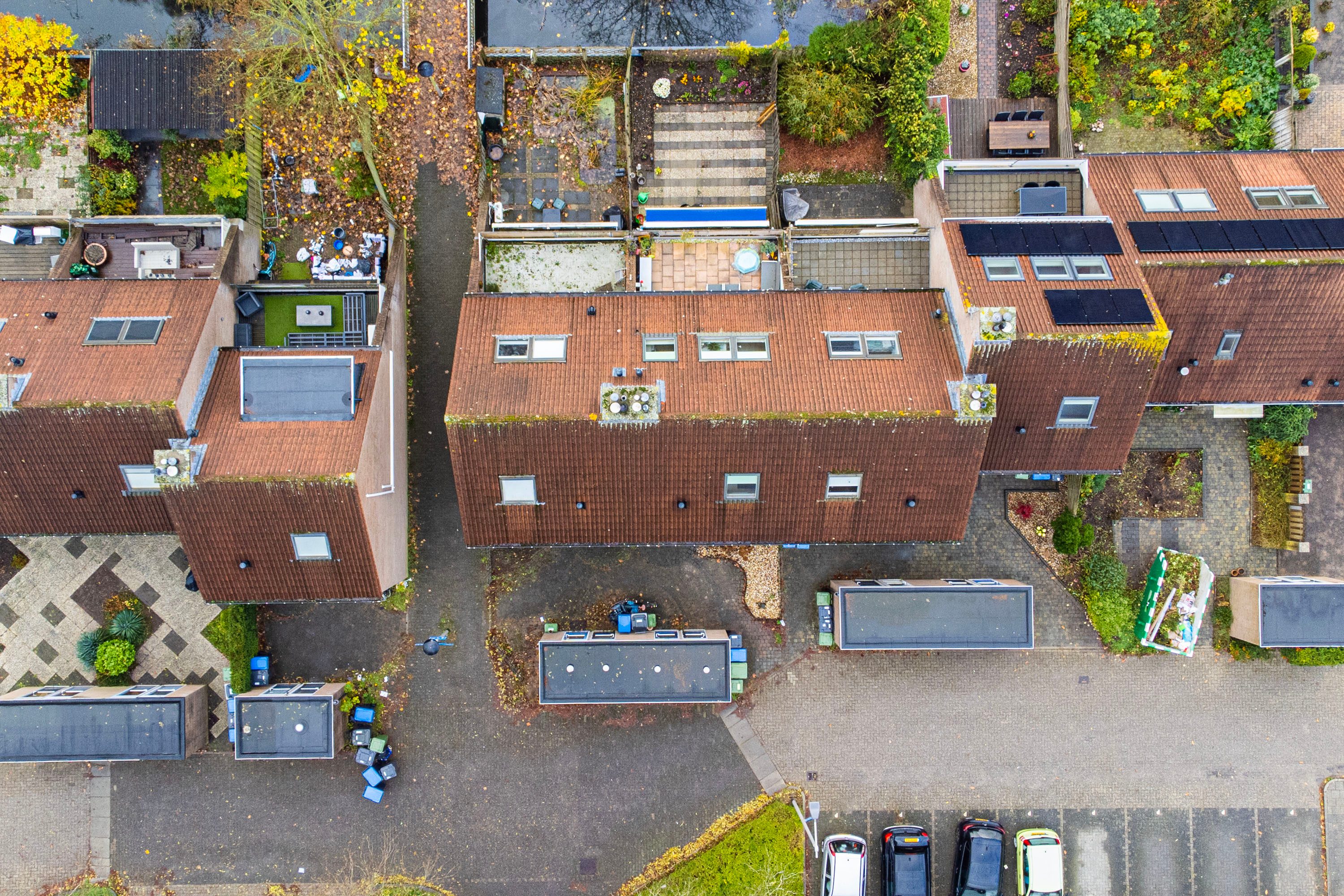 De op het zuidwesten gelegen tuin biedt voldoende ruimte voor het creëren van een comfortabele loungehoek, ook bevindt zich hier een handige houten berging. In de compacte voortuin bevindt zich een stenen berging ideaal voor het opbergen van extra spullen.