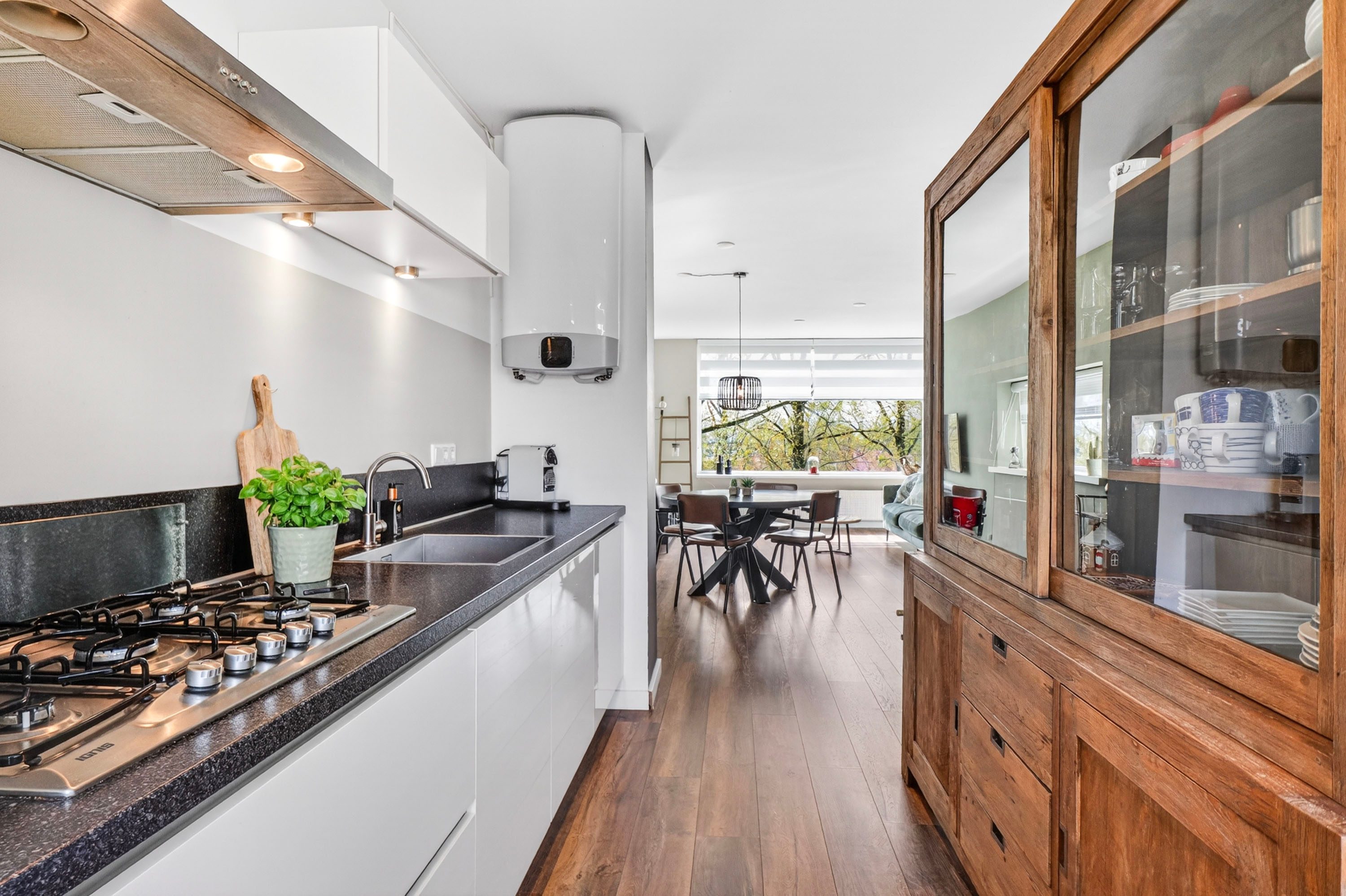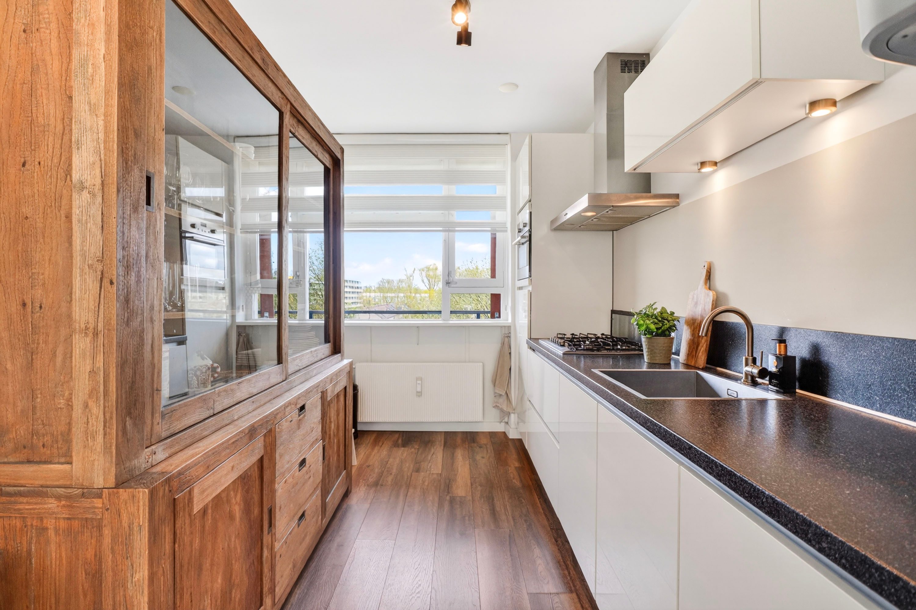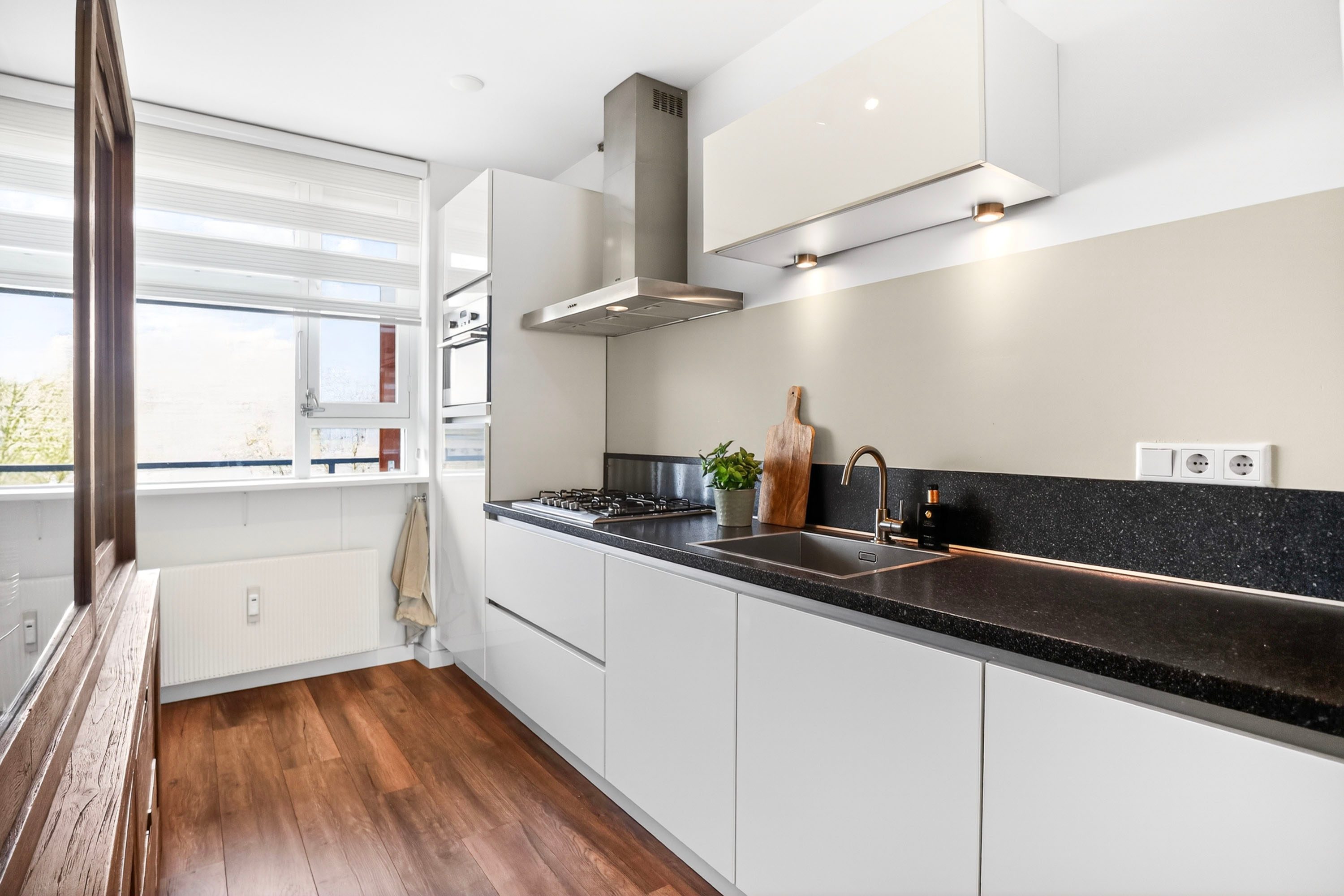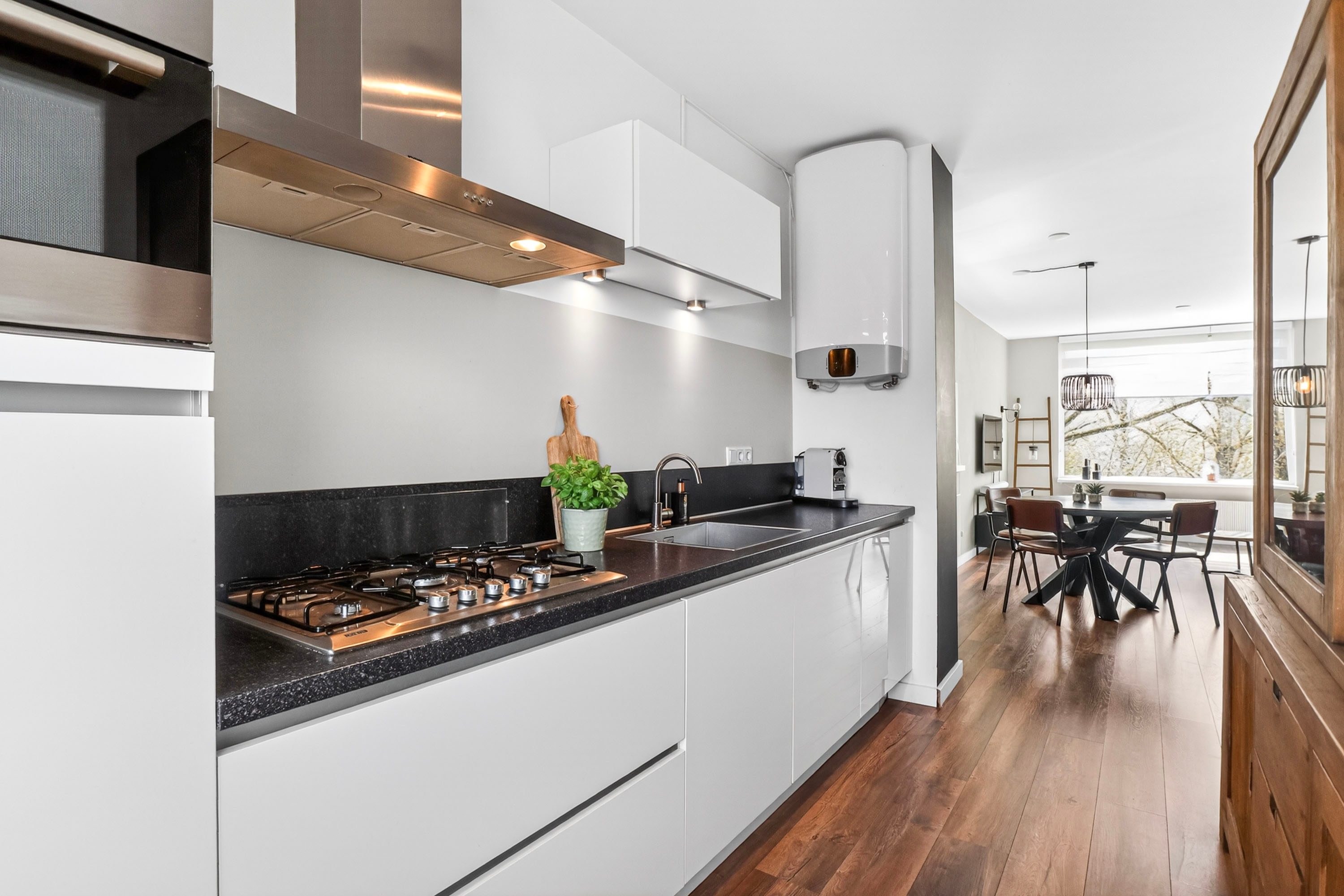 De ruime hal met meterkast geeft je toegang tot alle vertrekken. De lichte woonkamer is voorzien van een laminaatvloer en dankzij de grote raampartijen geniet je hier van veel lichtinval en een fraai, vrij uitzicht. Met een oppervlakte van circa 25 m² biedt de woonkamer volop ruimte voor een gezellige zithoek en een eettafel. Vanuit de woonkamer bereik je het balkon, waar je uitkijkt over een groene omgeving en dankzij de hoge ligging geniet je van een weids uitzicht. Een fijne plek om tot rust te komen en van het buitenleven te genieten. De hoekligging zorgt bovendien voor een extra raam, wat de woning voorziet van nog meer daglicht. De moderne keuken heeft een lichte uitstraling en is uitgerust met diverse inbouwapparatuur, waaronder een koel-vriescombinatie, gasfornuis, afzuigkap, vaatwasser en een combi-oven/magnetron.