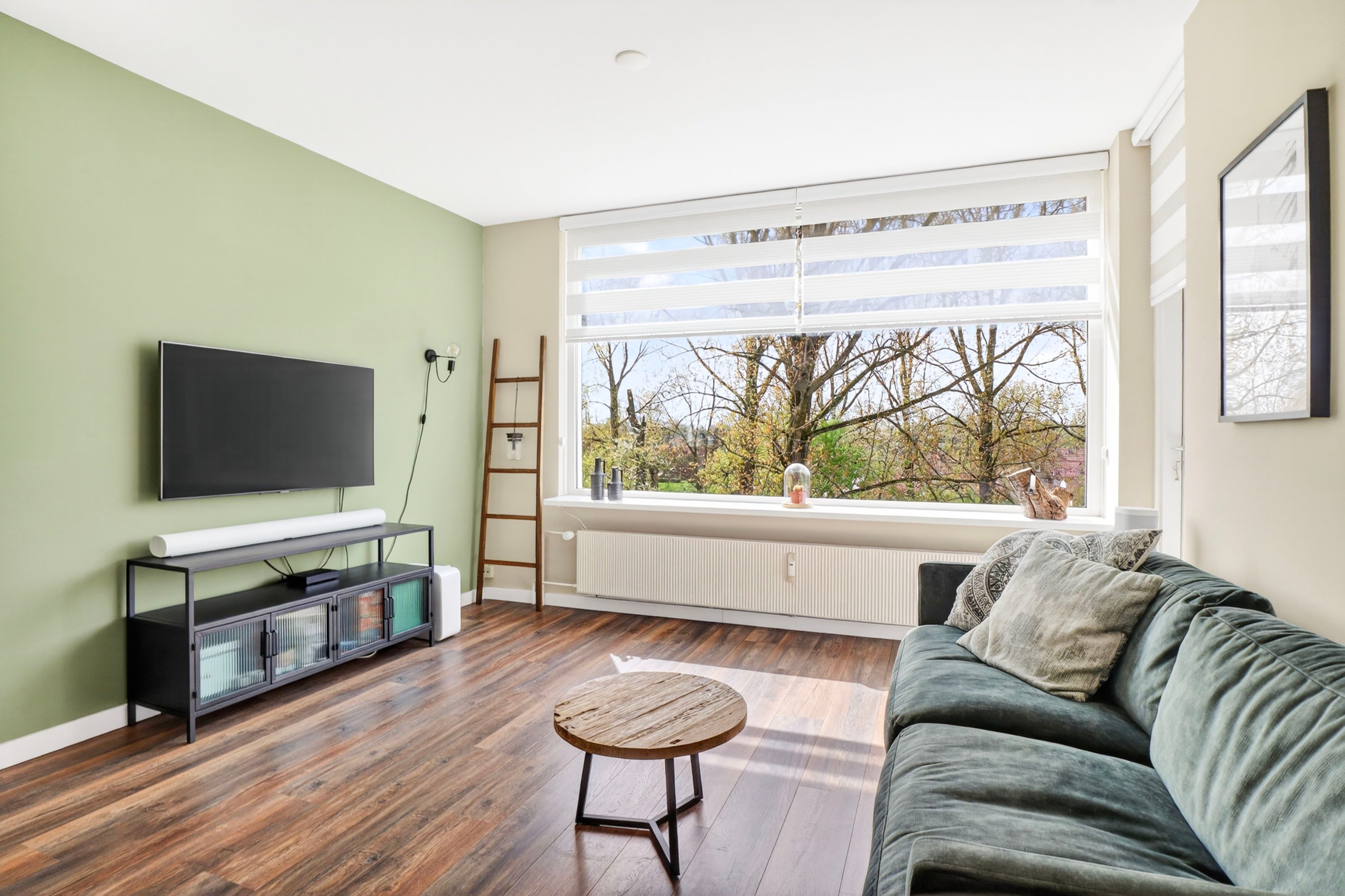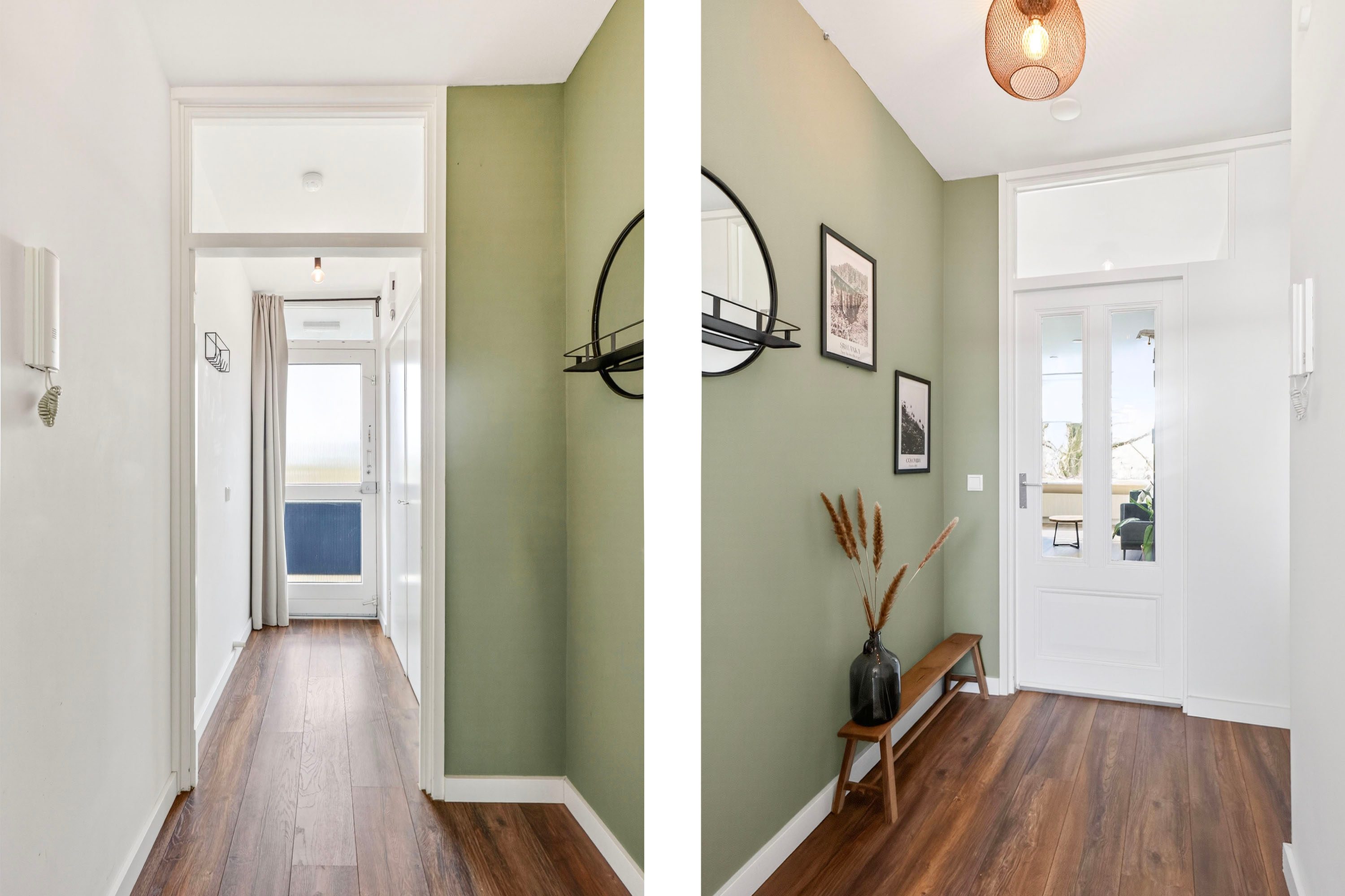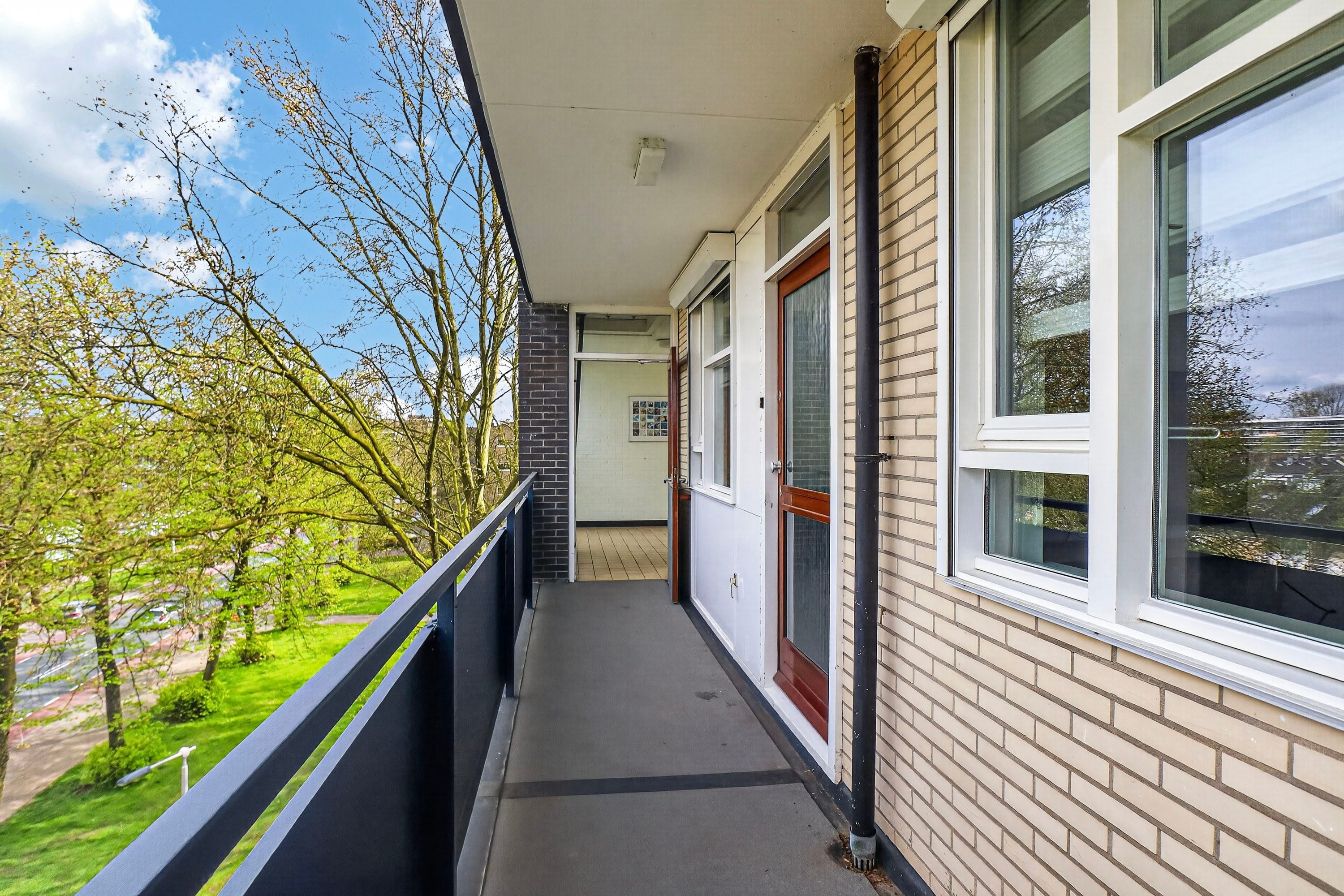 De ruime hal met meterkast geeft je toegang tot alle vertrekken. De lichte woonkamer is voorzien van een laminaatvloer en dankzij de grote raampartijen geniet je hier van veel lichtinval en een fraai, vrij uitzicht. Met een oppervlakte van circa 25 m² biedt de woonkamer volop ruimte voor een gezellige zithoek en een eettafel. Vanuit de woonkamer bereik je het balkon, waar je uitkijkt over een groene omgeving en dankzij de hoge ligging geniet je van een weids uitzicht. Een fijne plek om tot rust te komen en van het buitenleven te genieten. De hoekligging zorgt bovendien voor een extra raam, wat de woning voorziet van nog meer daglicht. De moderne keuken heeft een lichte uitstraling en is uitgerust met diverse inbouwapparatuur, waaronder een koel-vriescombinatie, gasfornuis, afzuigkap, vaatwasser en een combi-oven/magnetron.