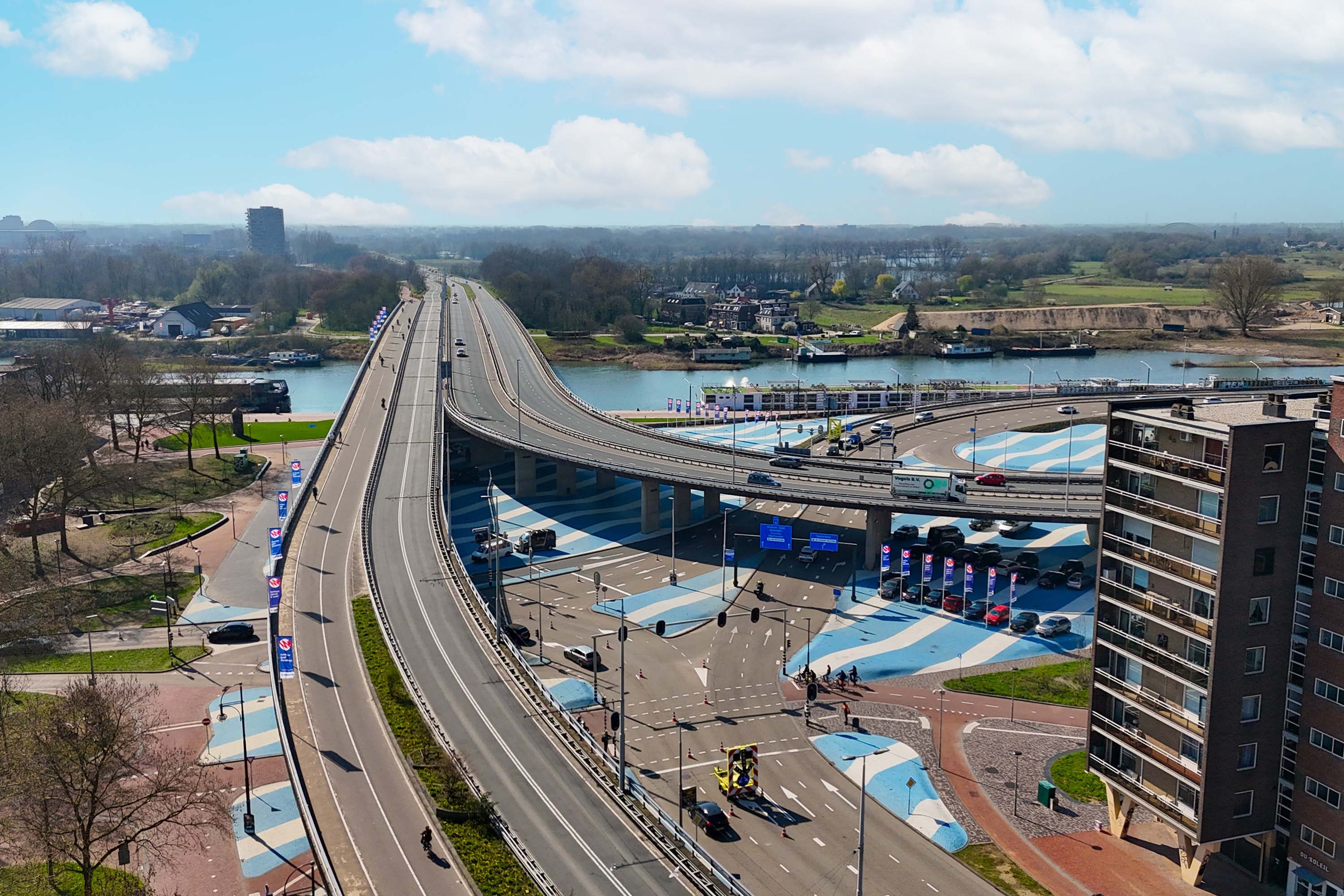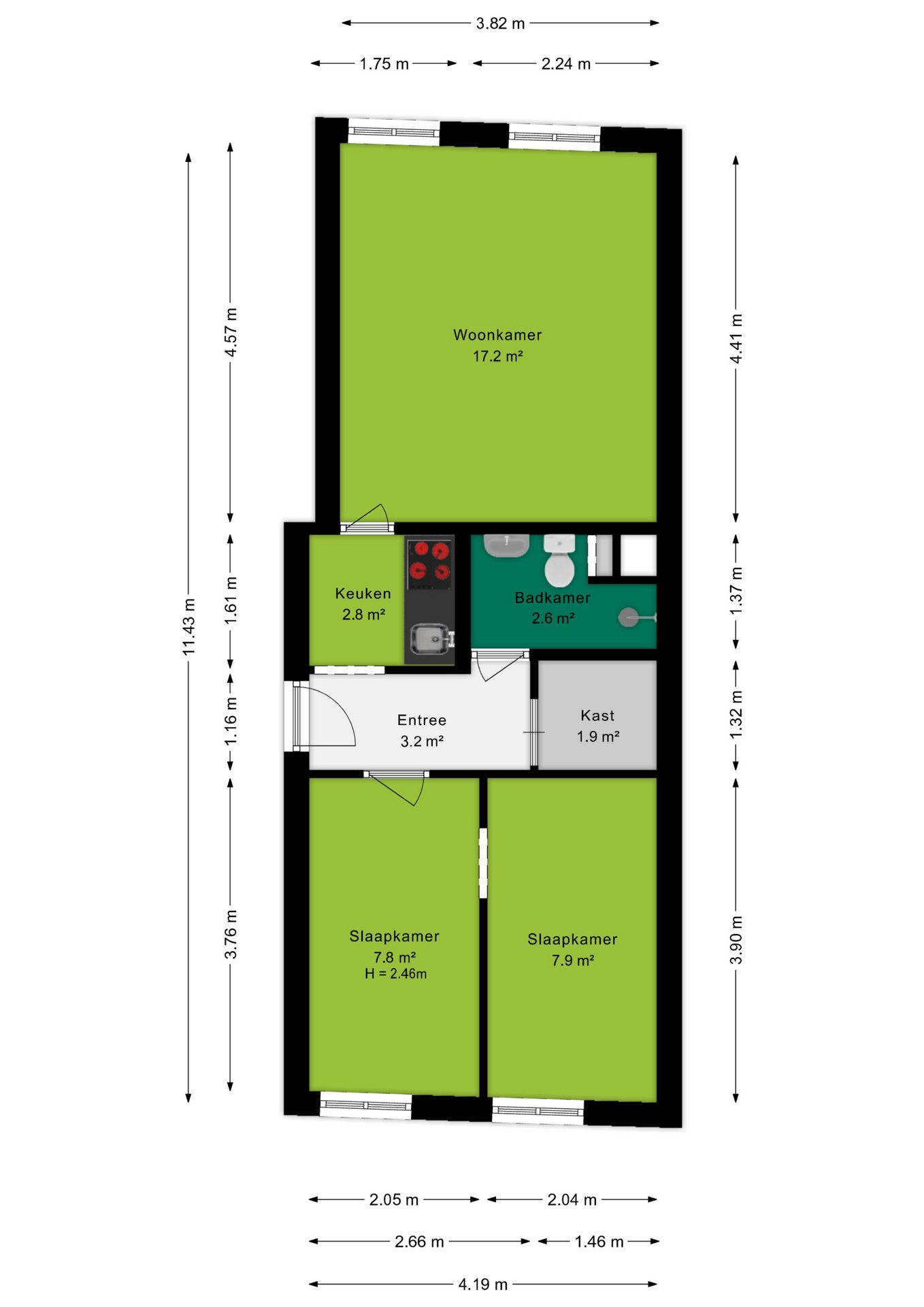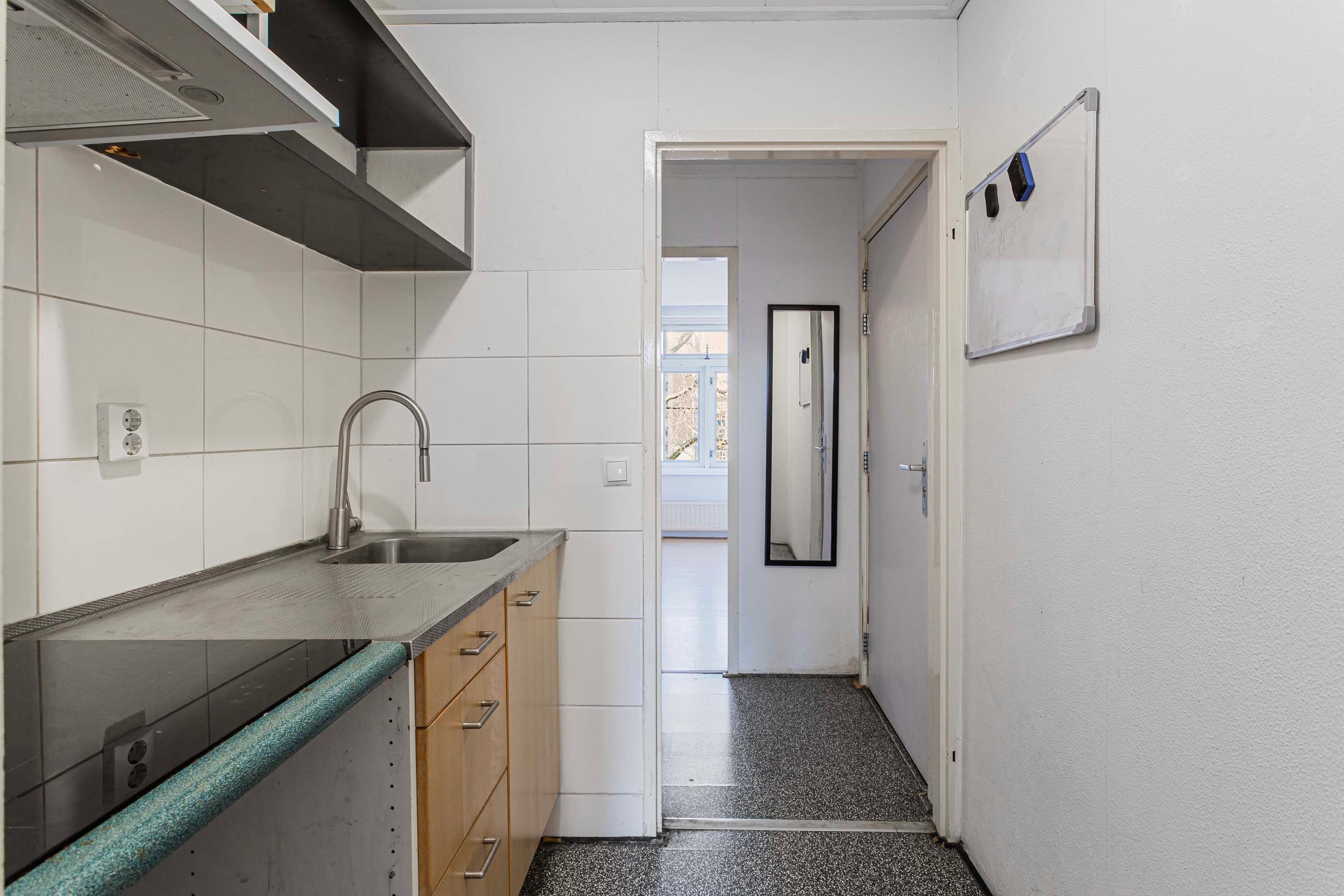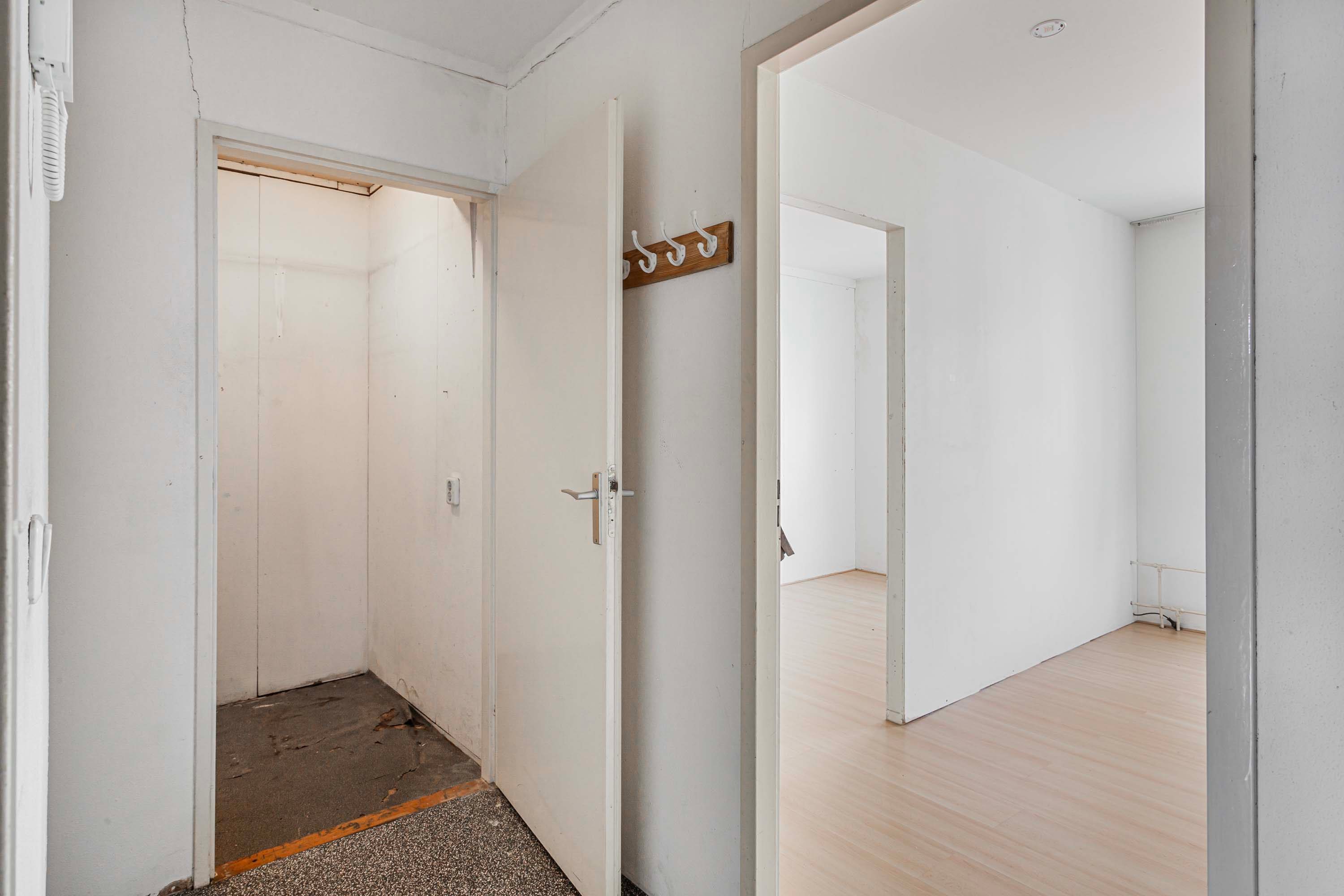 Via de entree stap je het appartement binnen. Vanuit hier heb je direct toegang tot de centraal gelegen keuken en toegang biedt tot de woonkamer. De keuken is uitgerust met een eenvoudig keukenblok, voorzien van een kookplaat, afzuigkap en spoelbak. Aan de achterzijde bevindt zich de lichte woonkamer (ca. 17 m²), waar twee raampartijen zorgen voor een mooie lichtinval en een open, aangename sfeer. Vanuit hier kijk je richting de binnenstad, terwijl de ruimte zich uitstekend leent voor een gezellige zithoek en een eettafel, waardoor je de woonkamer sfeervol en praktisch kunt inrichten. Aan de voorzijde bevinden zich twee slaapkamers van vergelijkbare grootte (ca. 7,8 m² en 7,9 m²). Dankzij de ligging bieden deze kamers een leuk uitzicht richting de Nelson Mandelabrug. Beide ruimtes zijn praktisch in te richten en lenen zich uitstekend voor een comfortabele slaapkamer met inloopkast en fijne thuiswerkplek. De badkamer is compact en voorzien van een douche, toilet en wastafel. Daarnaast is er een separate berging van ca. 2 m² aanwezig, ideaal voor het plaatsen van de wasmachine én het creëren van extra opbergruimte voor voorraad, schoonmaakspullen of andere spullen die je graag uit het zicht bewaart.