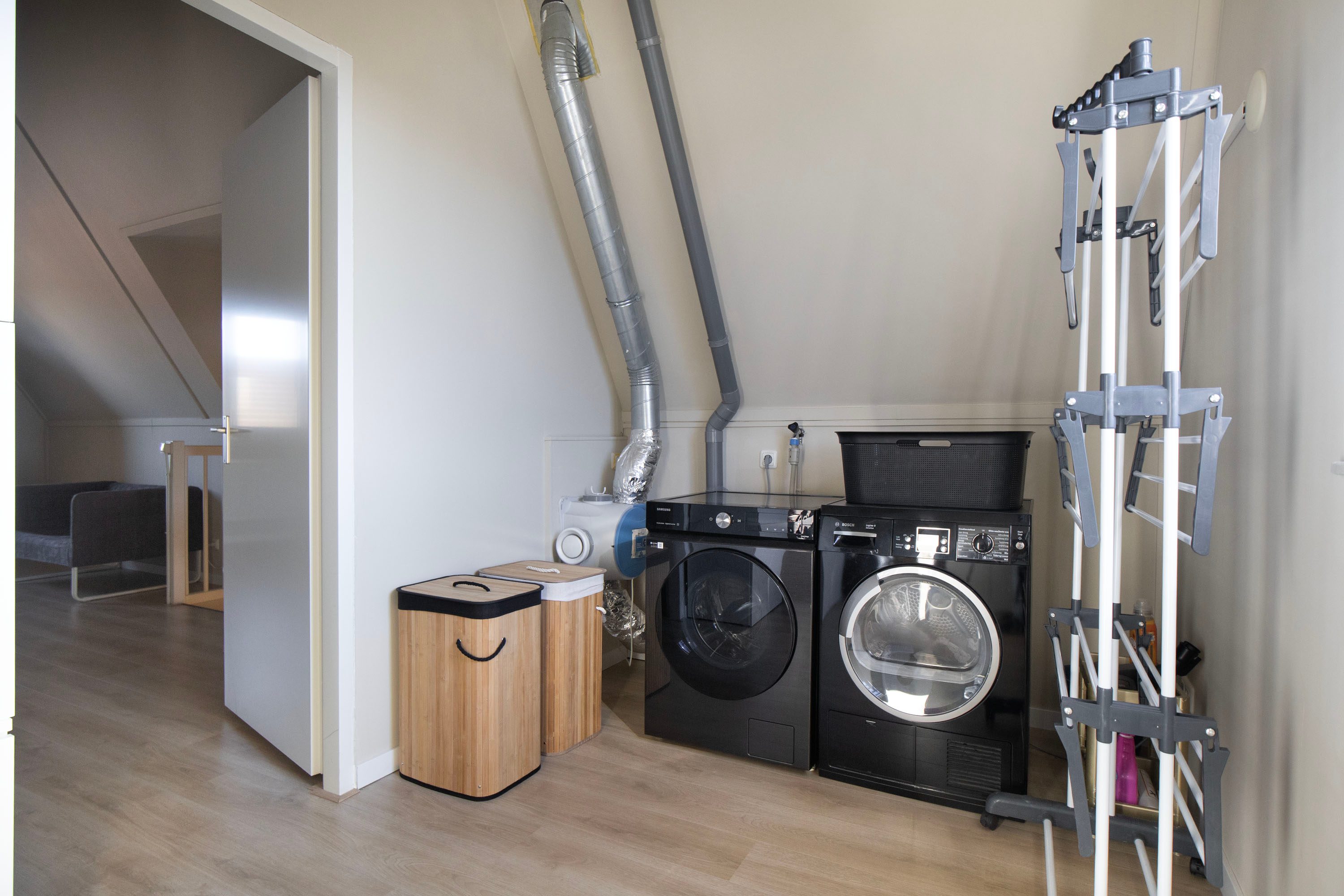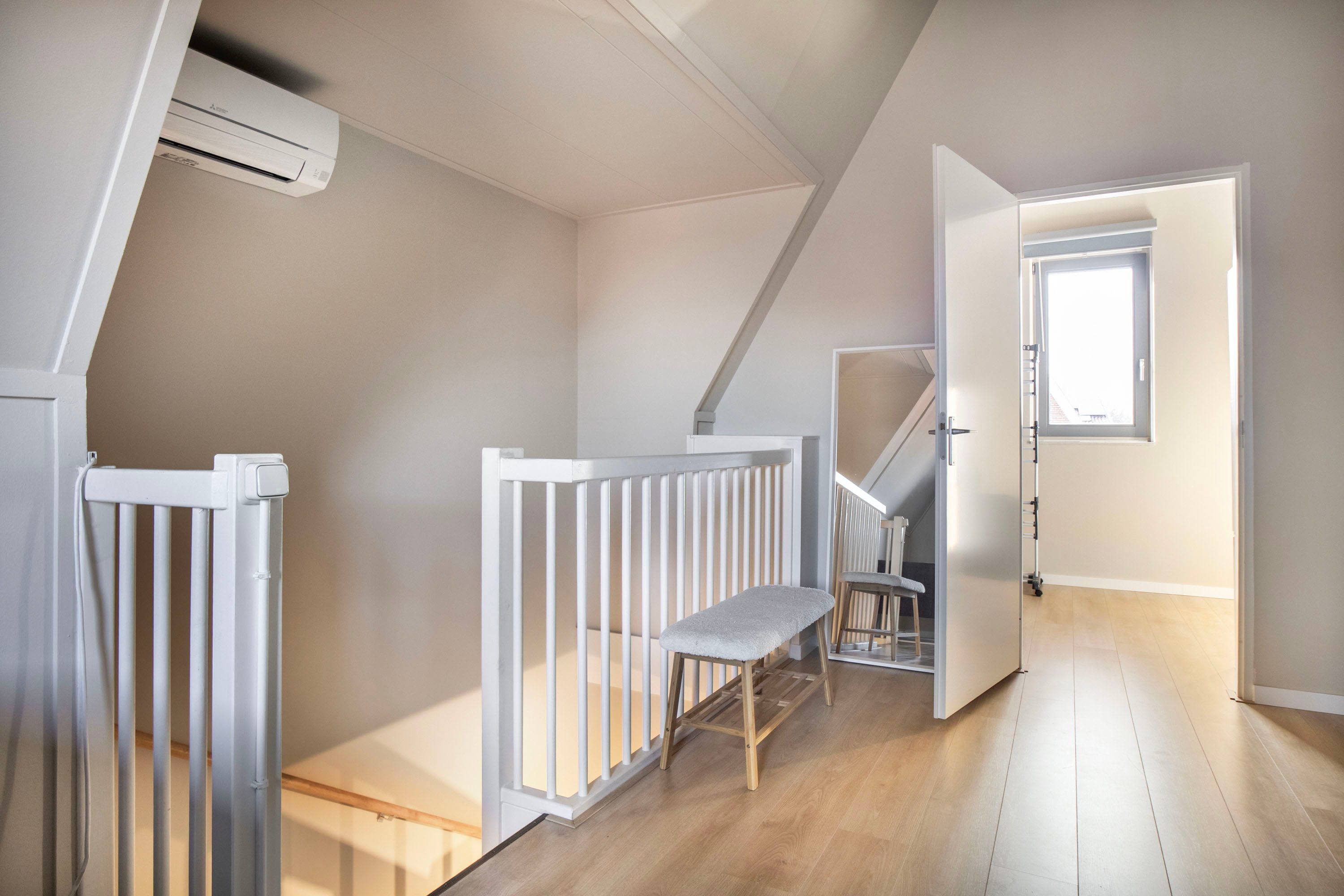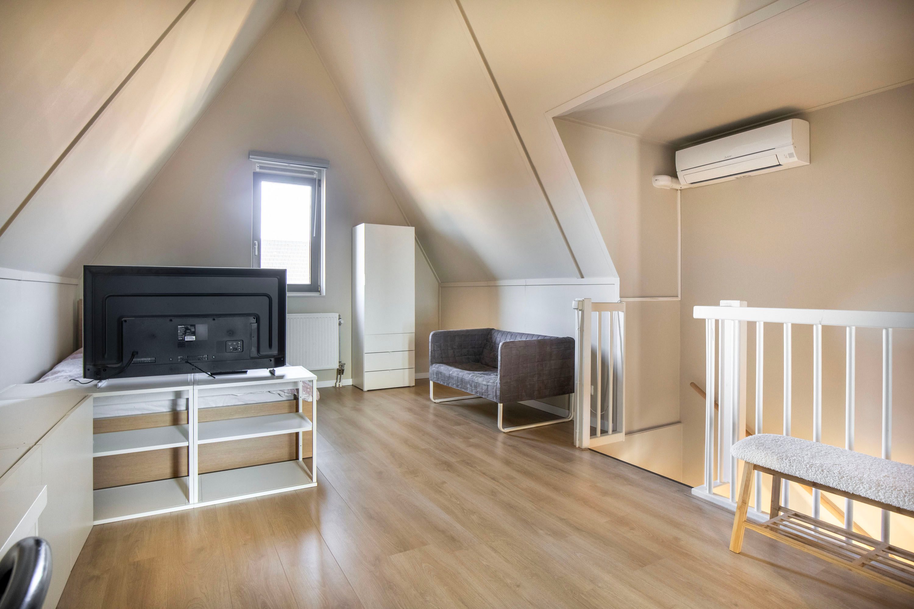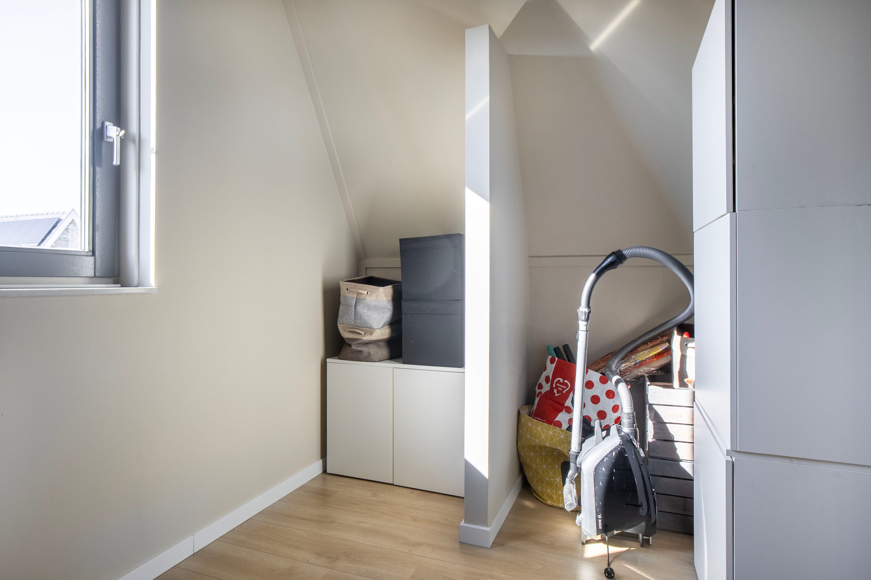 Op de tweede verdieping bevindt zich een vierde slaapkamer die dankzij de hoge nok en de speels oplopende daklijnen een bijzonder ruimtelijk gevoel biedt. Het is een heerlijke, rustige plek met volop privacy, ideaal als slaapkamer, werkruimte of studio. De kamer is keurig afgewerkt met een laminaatvloer en beschikt over een groot dakraam dat zorgt voor veel natuurlijk licht. De aanwezige airconditioning maakt het hier bovendien het hele jaar comfortabel. Aangrenzend vind je een praktische wasruimte. Deze separate ruimte biedt plaats aan de wasmachine en droger en heeft daarnaast voldoende extra bergruimte. Dankzij het raam is er ook hier daglicht en ventilatie aanwezig.