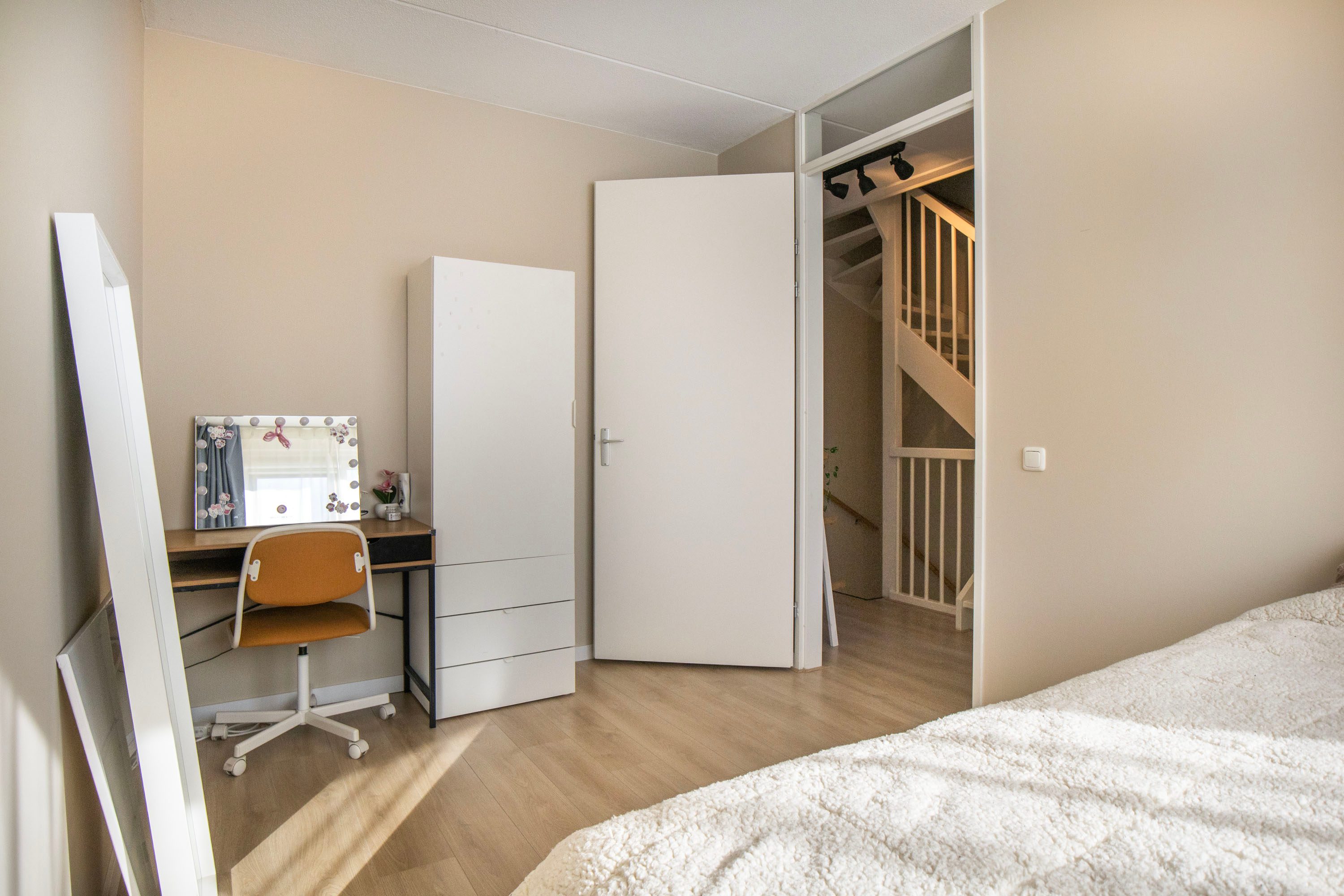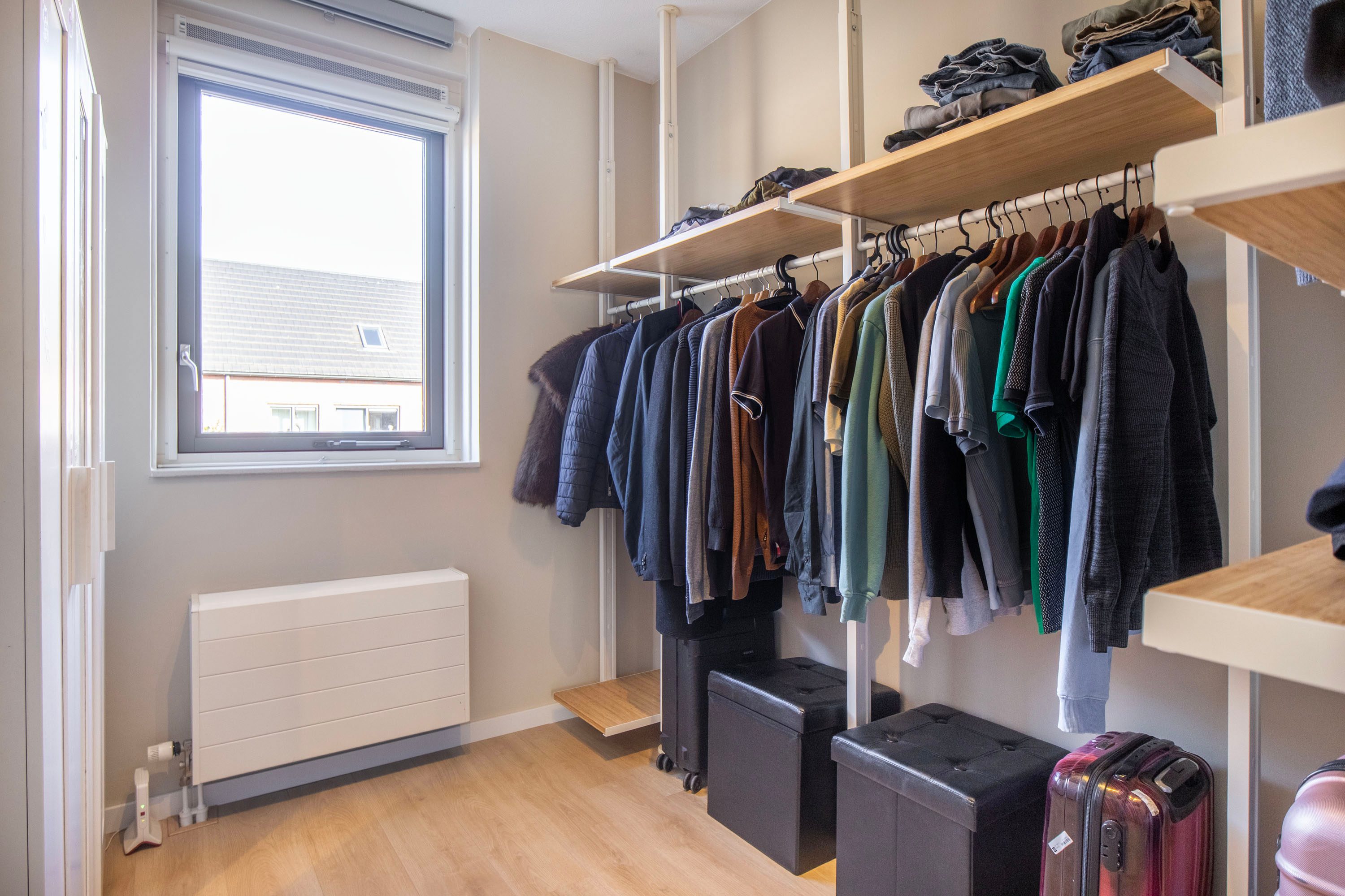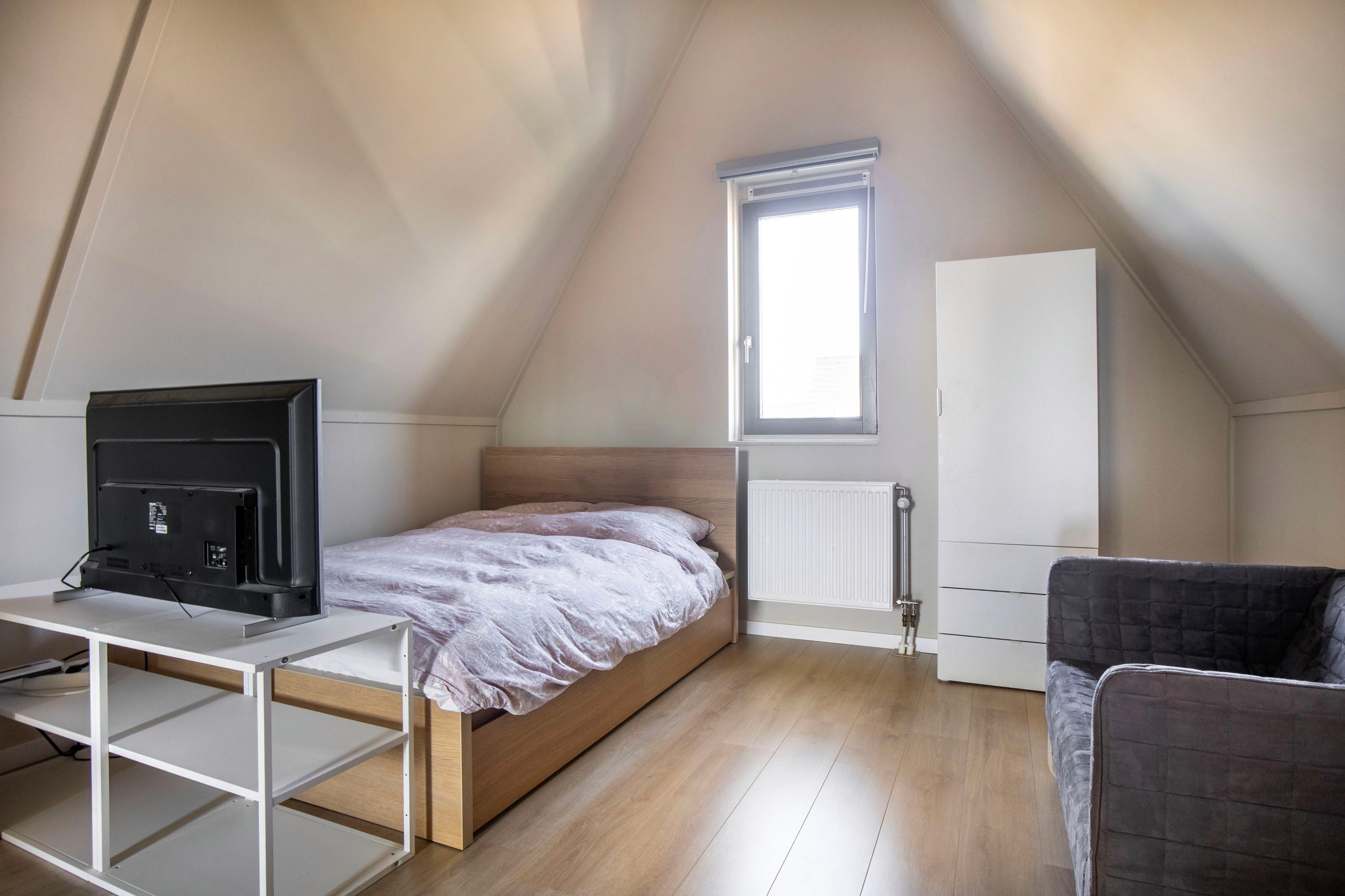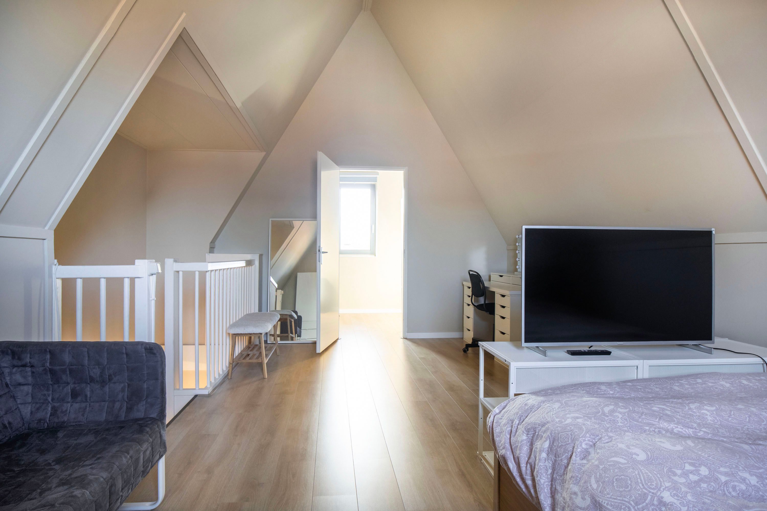 Op de tweede verdieping bevindt zich een vierde slaapkamer die dankzij de hoge nok en de speels oplopende daklijnen een bijzonder ruimtelijk gevoel biedt. Het is een heerlijke, rustige plek met volop privacy, ideaal als slaapkamer, werkruimte of studio. De kamer is keurig afgewerkt met een laminaatvloer en beschikt over een groot dakraam dat zorgt voor veel natuurlijk licht. De aanwezige airconditioning maakt het hier bovendien het hele jaar comfortabel. Aangrenzend vind je een praktische wasruimte. Deze separate ruimte biedt plaats aan de wasmachine en droger en heeft daarnaast voldoende extra bergruimte. Dankzij het raam is er ook hier daglicht en ventilatie aanwezig.