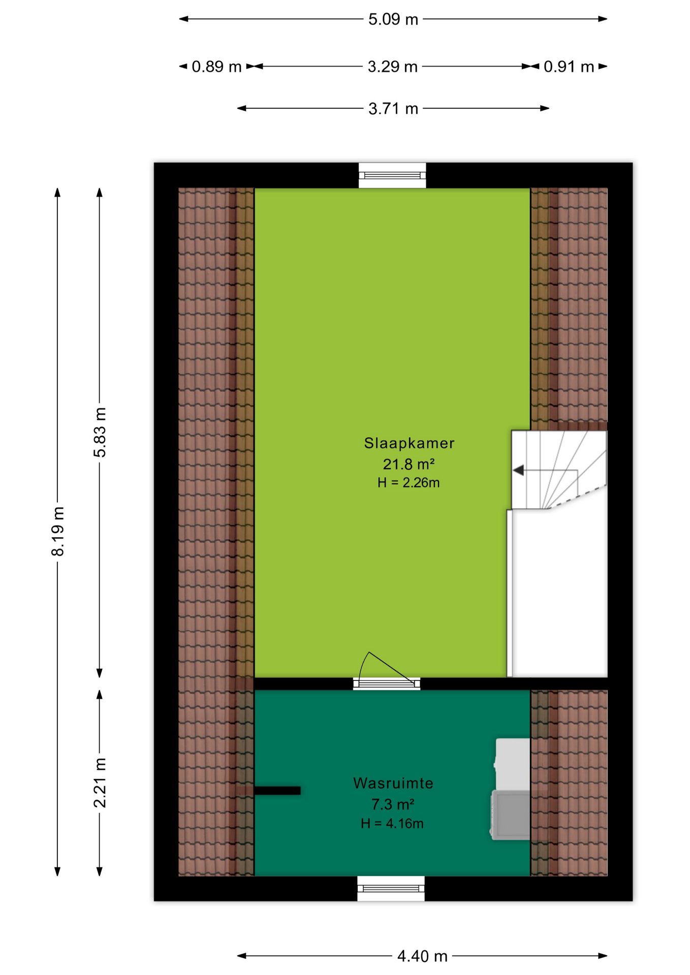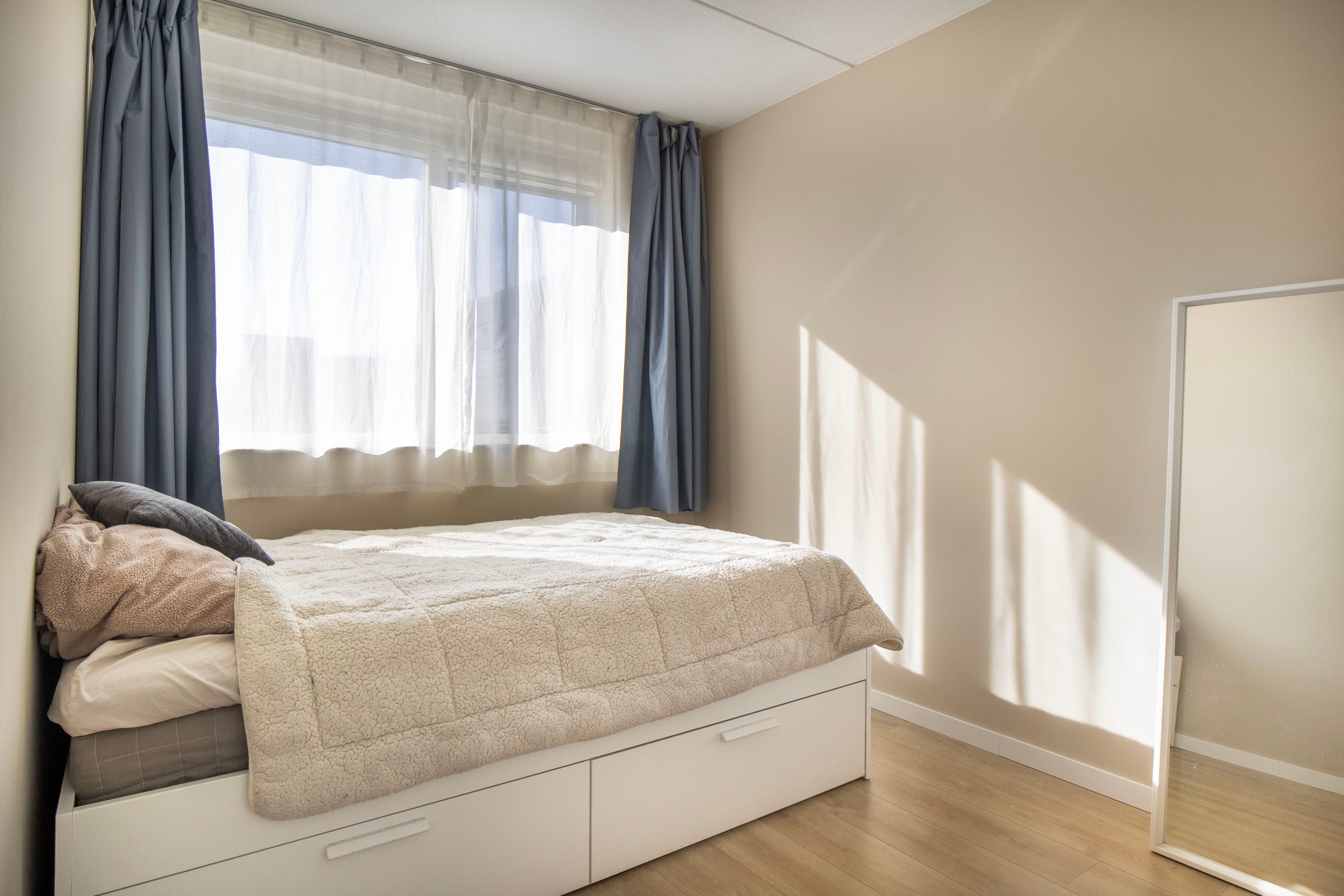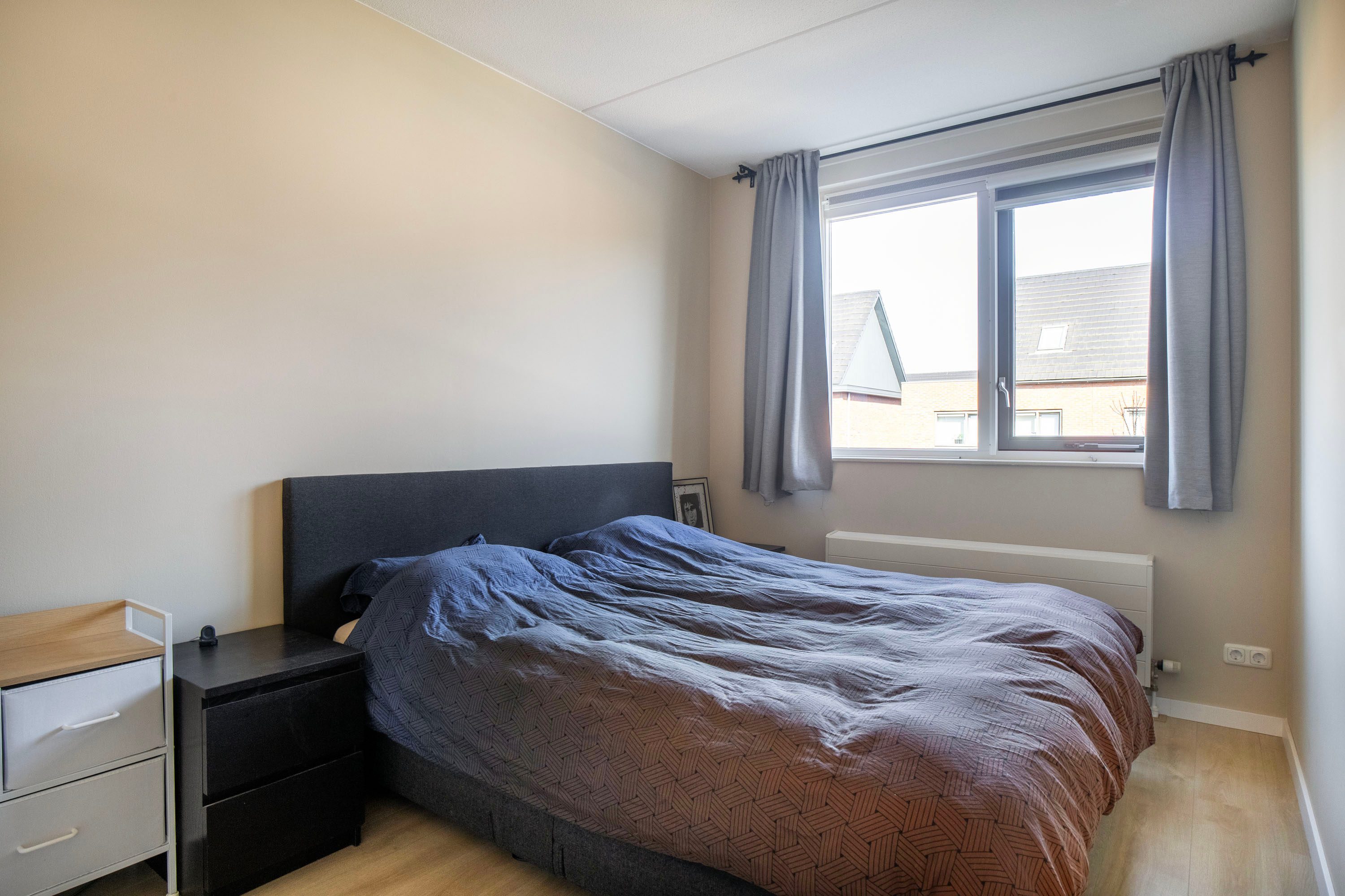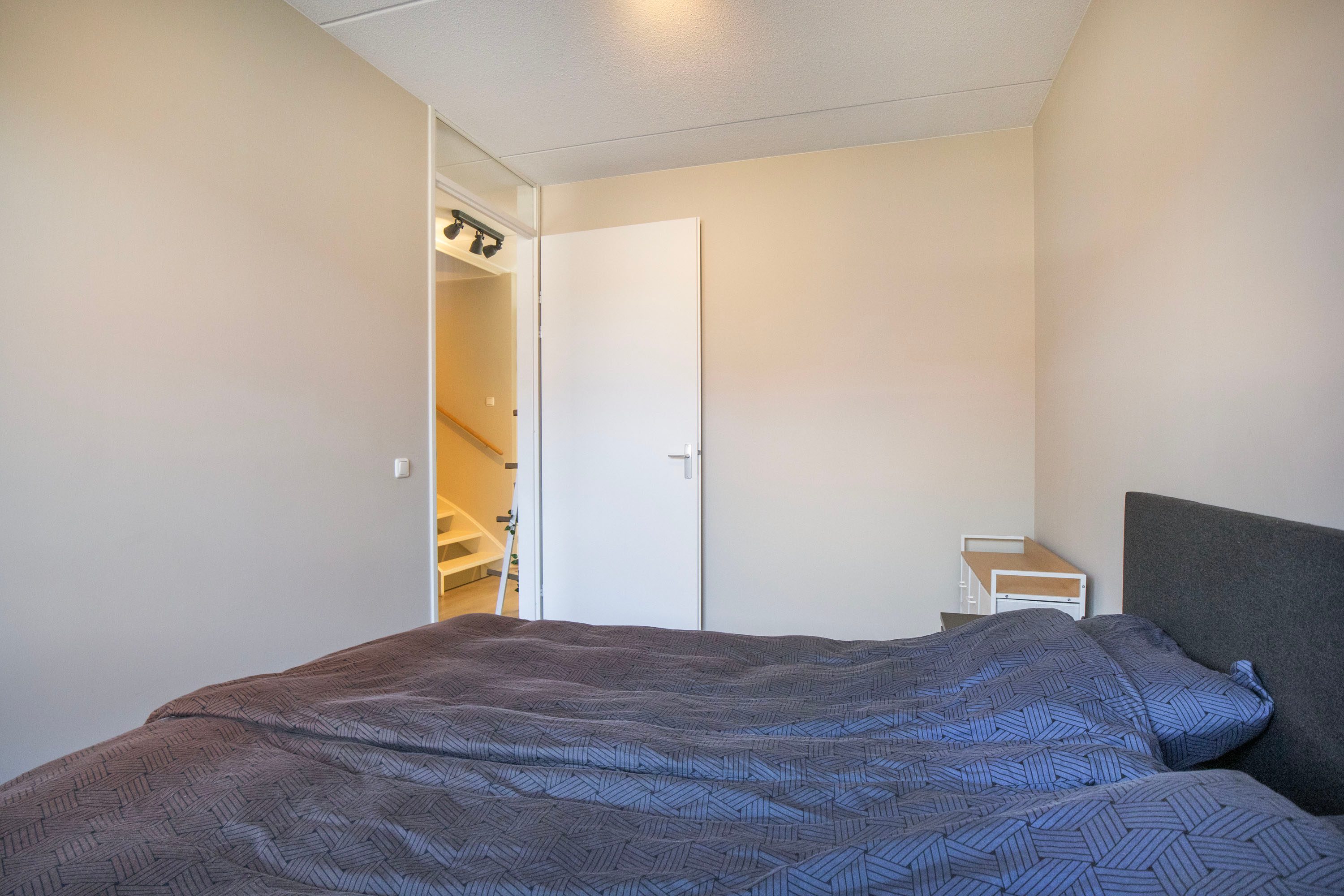 Op de tweede verdieping bevindt zich een vierde slaapkamer die dankzij de hoge nok en de speels oplopende daklijnen een bijzonder ruimtelijk gevoel biedt. Het is een heerlijke, rustige plek met volop privacy, ideaal als slaapkamer, werkruimte of studio. De kamer is keurig afgewerkt met een laminaatvloer en beschikt over een groot dakraam dat zorgt voor veel natuurlijk licht. De aanwezige airconditioning maakt het hier bovendien het hele jaar comfortabel. Aangrenzend vind je een praktische wasruimte. Deze separate ruimte biedt plaats aan de wasmachine en droger en heeft daarnaast voldoende extra bergruimte. Dankzij het raam is er ook hier daglicht en ventilatie aanwezig.