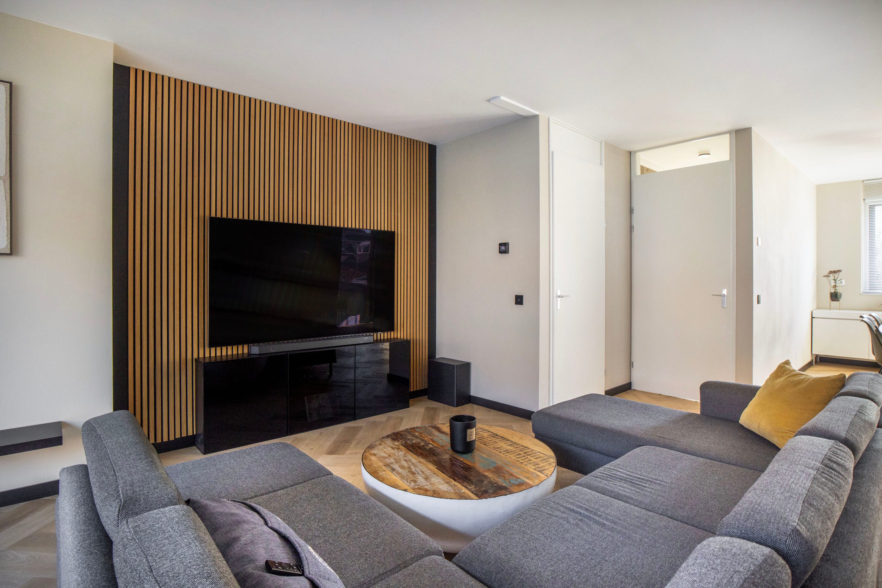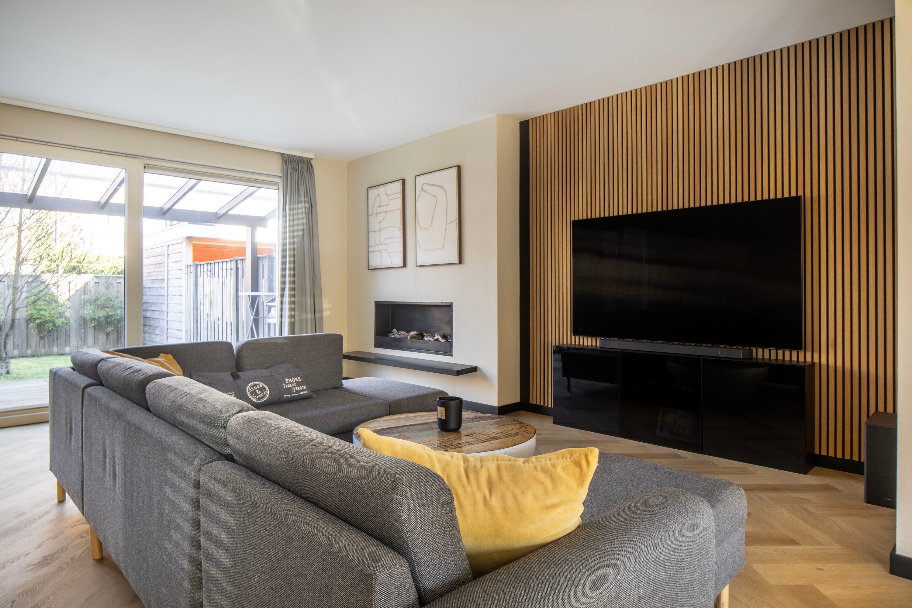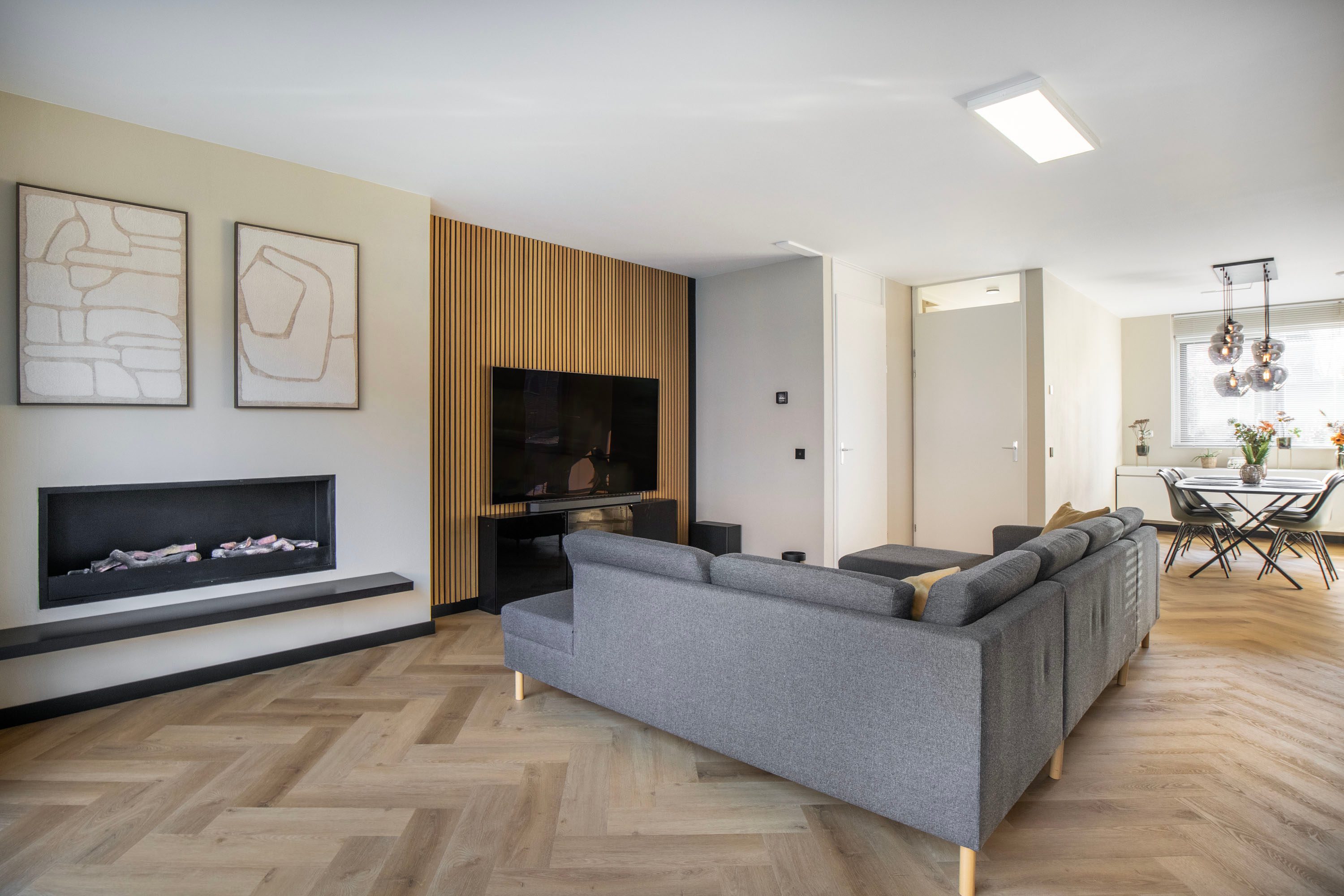 Je komt binnen in een nette hal met een modern afgewerkt toilet. Vanuit hier stap je de ruime woonkamer binnen, waar de sfeervolle visgraatvloer met vloerverwarming direct zorgt voor een warme en stijlvolle uitstraling. Aan de tuinzijde is een comfortabele zithoek ingericht, compleet met een sfeervolle ethanolhaard en een strakke houten lattenwand, een echte blikvanger. Dankzij de grote raampartijen en de schuifpui geniet je hier de hele dag van een prachtige lichtinval en een naadloze verbinding met de tuin. Aan de voorzijde van de woning bevindt zich een ideale plek voor een werk- of speelgedeelte.