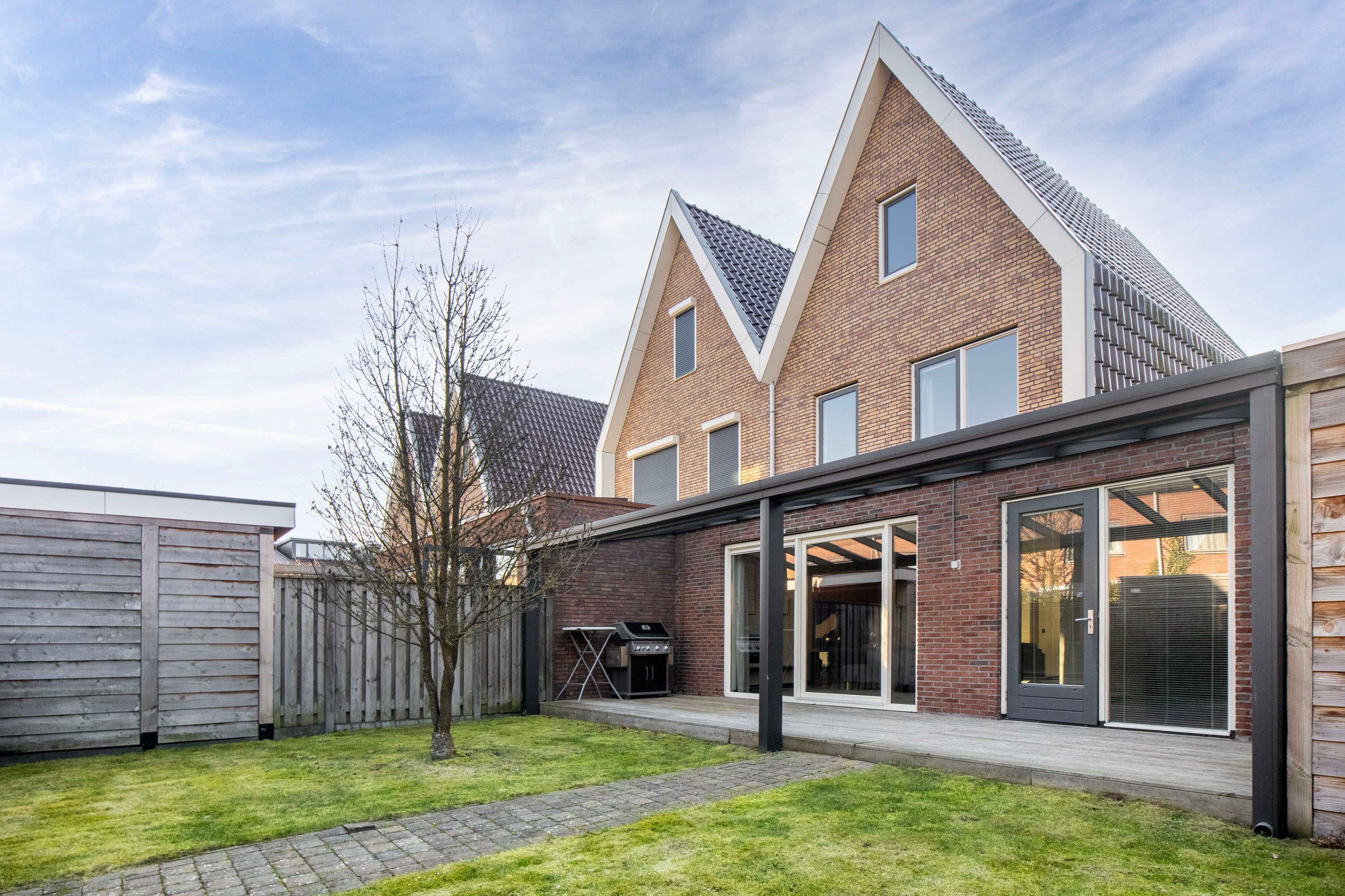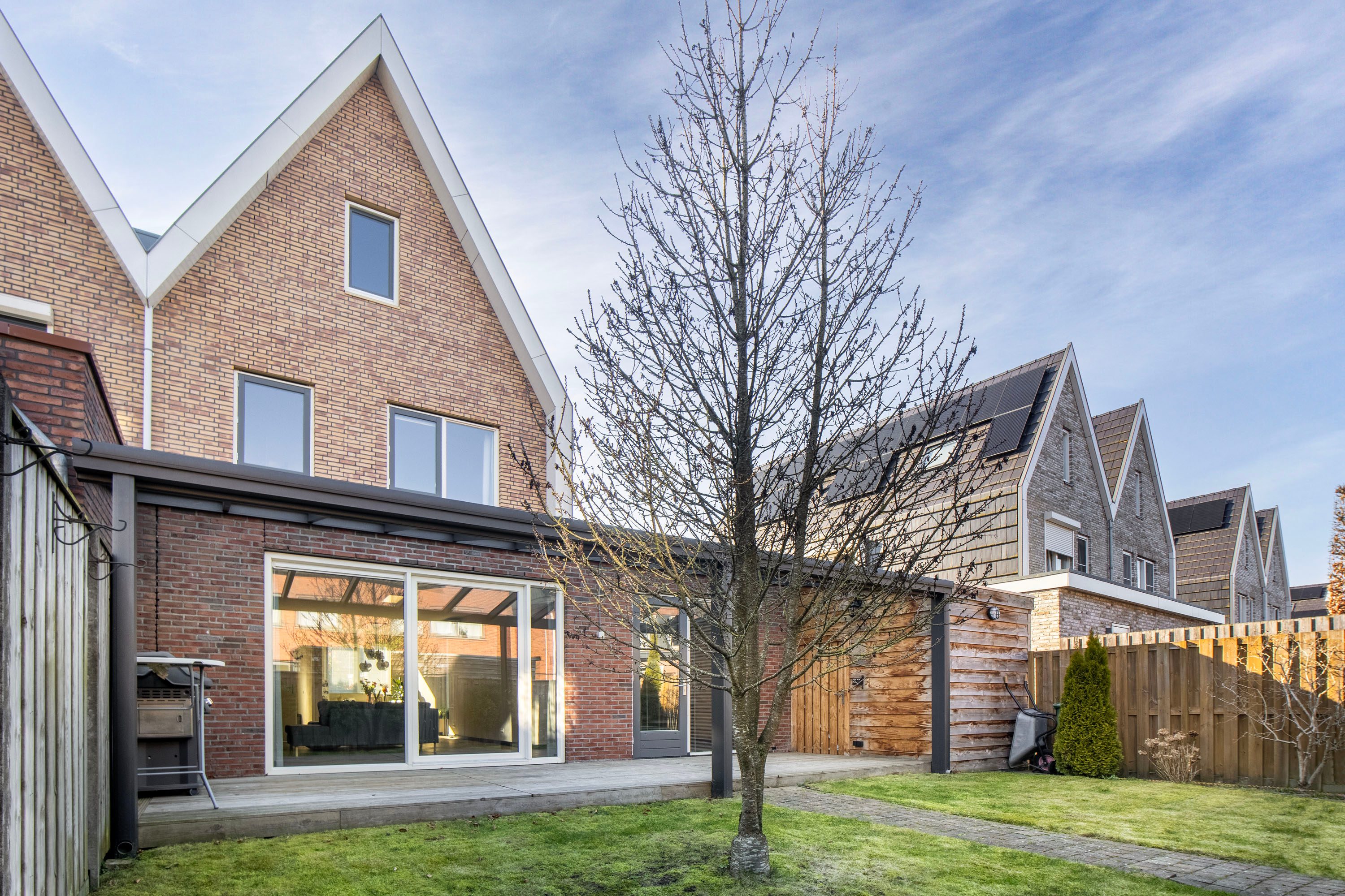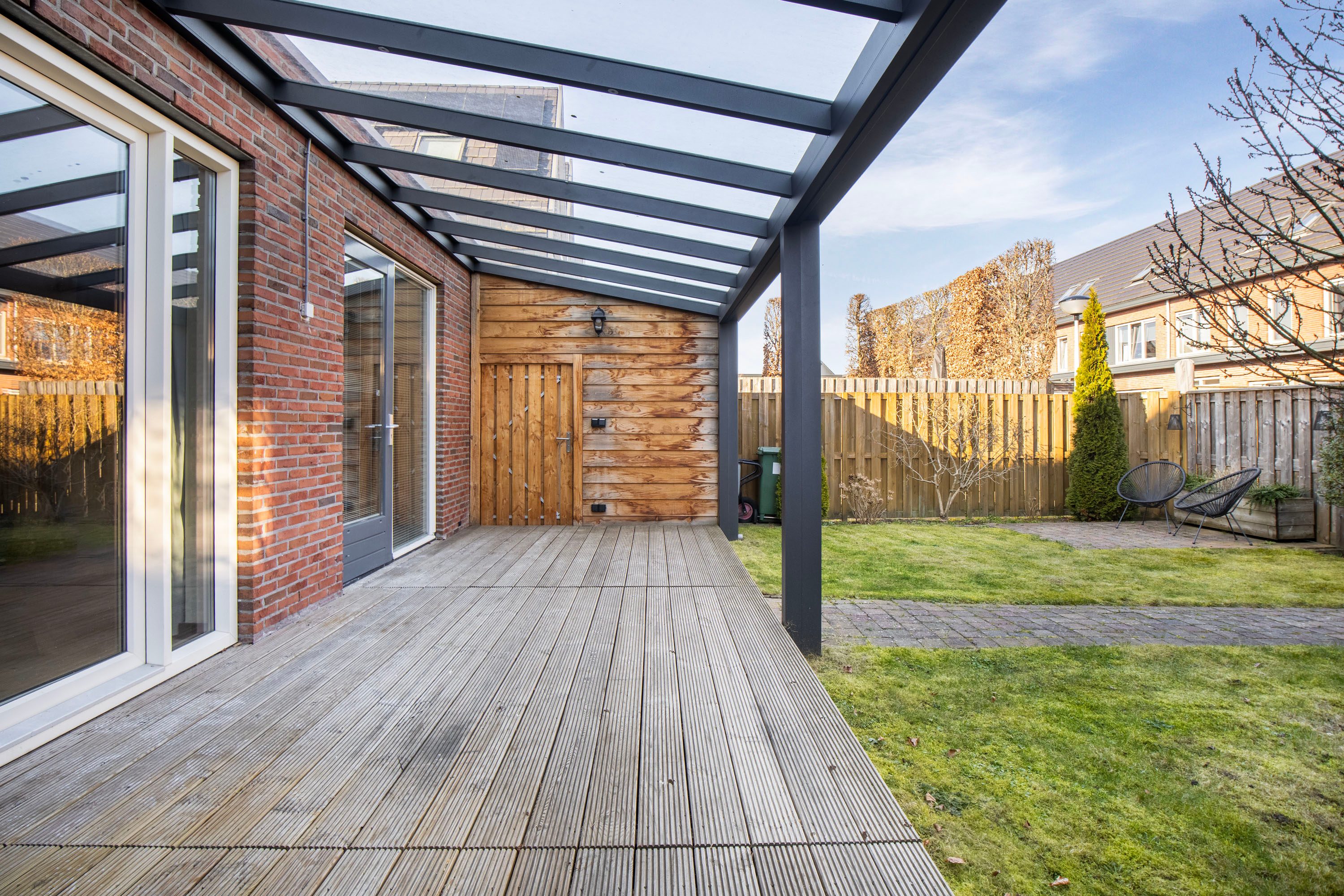Via de schuifpui stap je zo de fijne achtertuin in, gelegen op het noordoosten. Dankzij de ruime afmetingen kun je hier op elk moment van de dag een plek in de zon óf juist in de schaduw vinden, ideaal voor zowel ontspannen loungen als gezellig buiten eten. De stijlvolle overkapping fungeert als een natuurlijk verlengstuk van de woonkamer, waardoor je al vroeg in het voorjaar én tot laat in het najaar heerlijk buiten kunt zitten. Inpandig is er een praktische berging aanwezig, ideaal voor fietsen, tuinspullen of extra opslag. Daarnaast beschikt de woning over een achterom. Je auto parkeer je gemakkelijk op je eigen oprit.