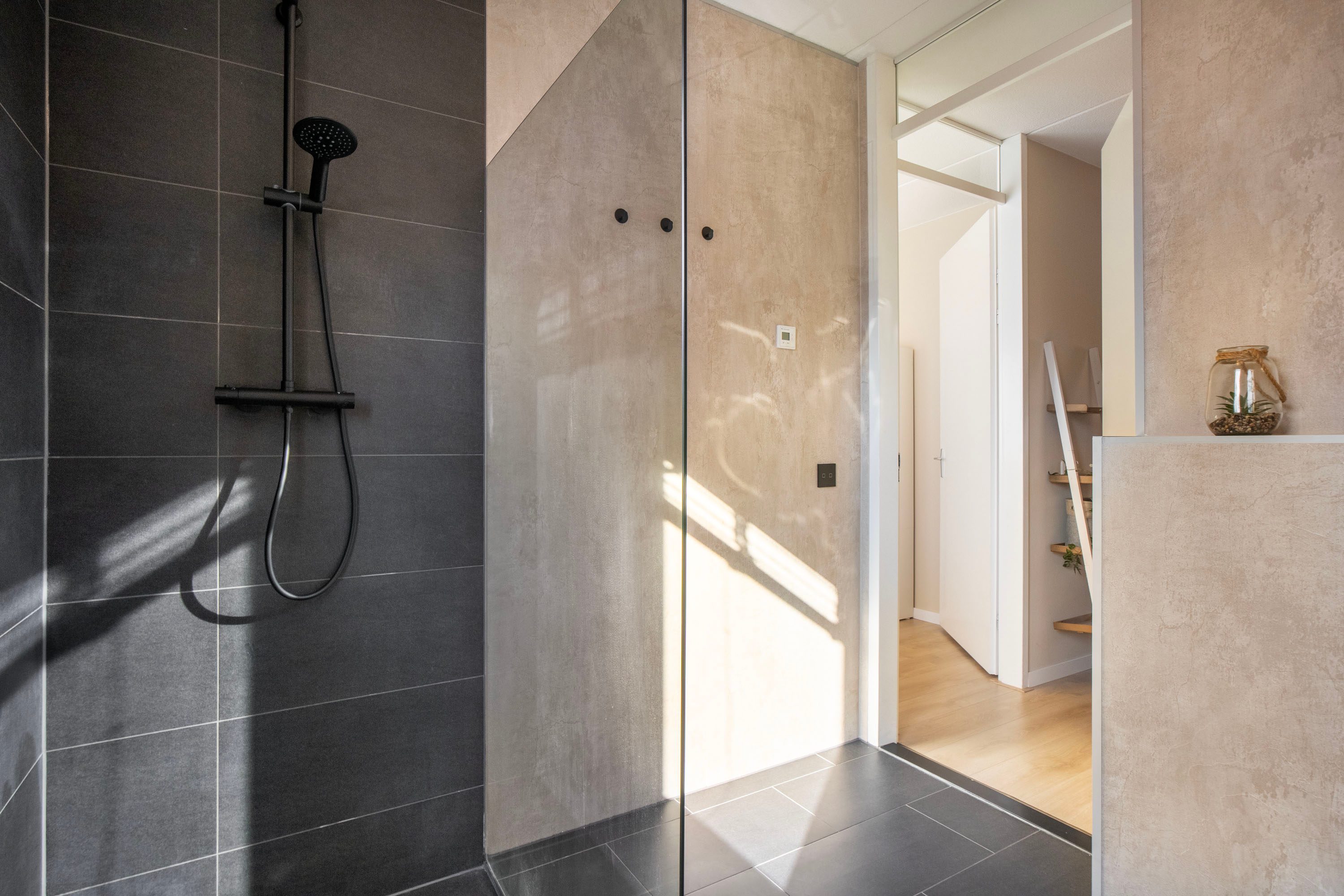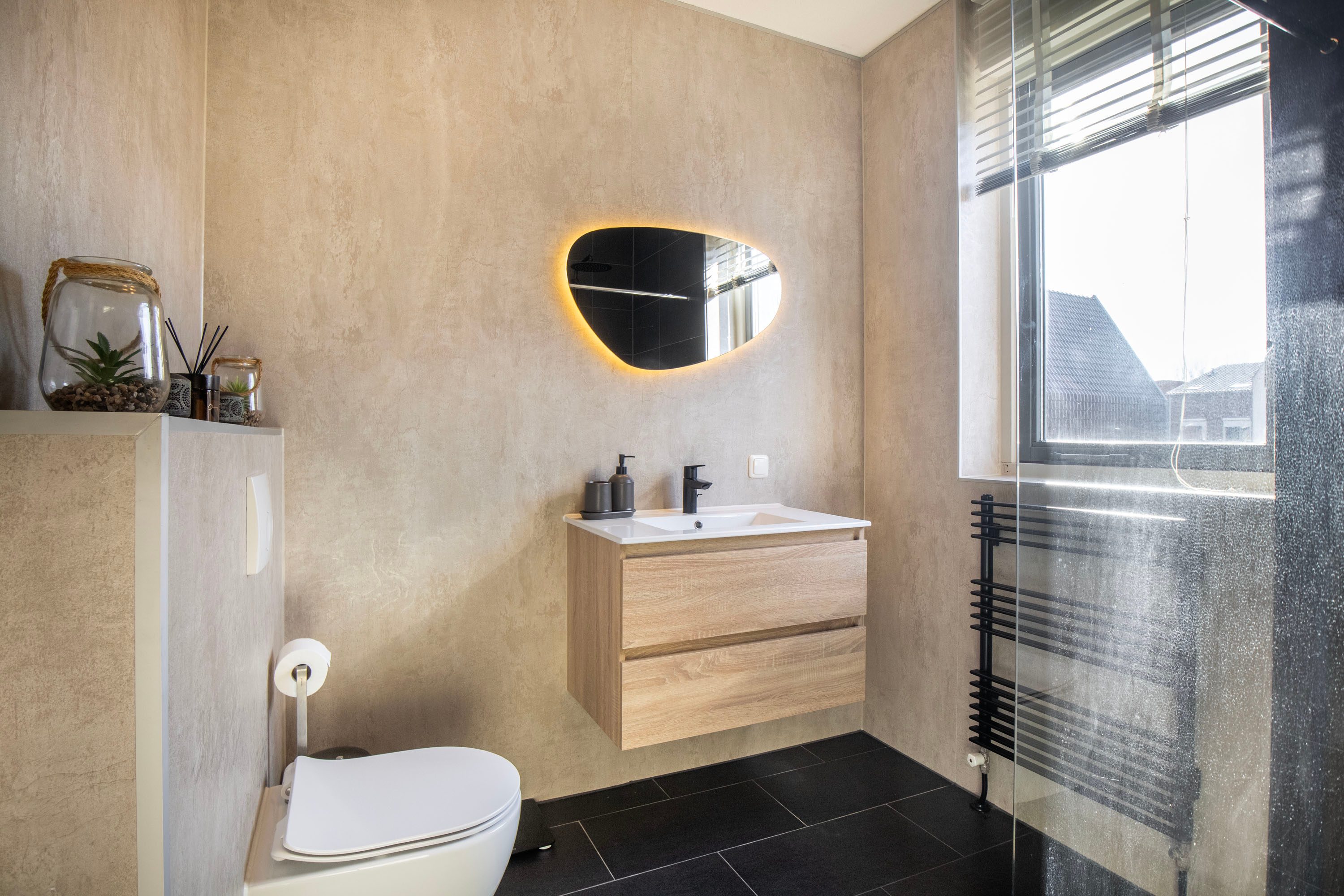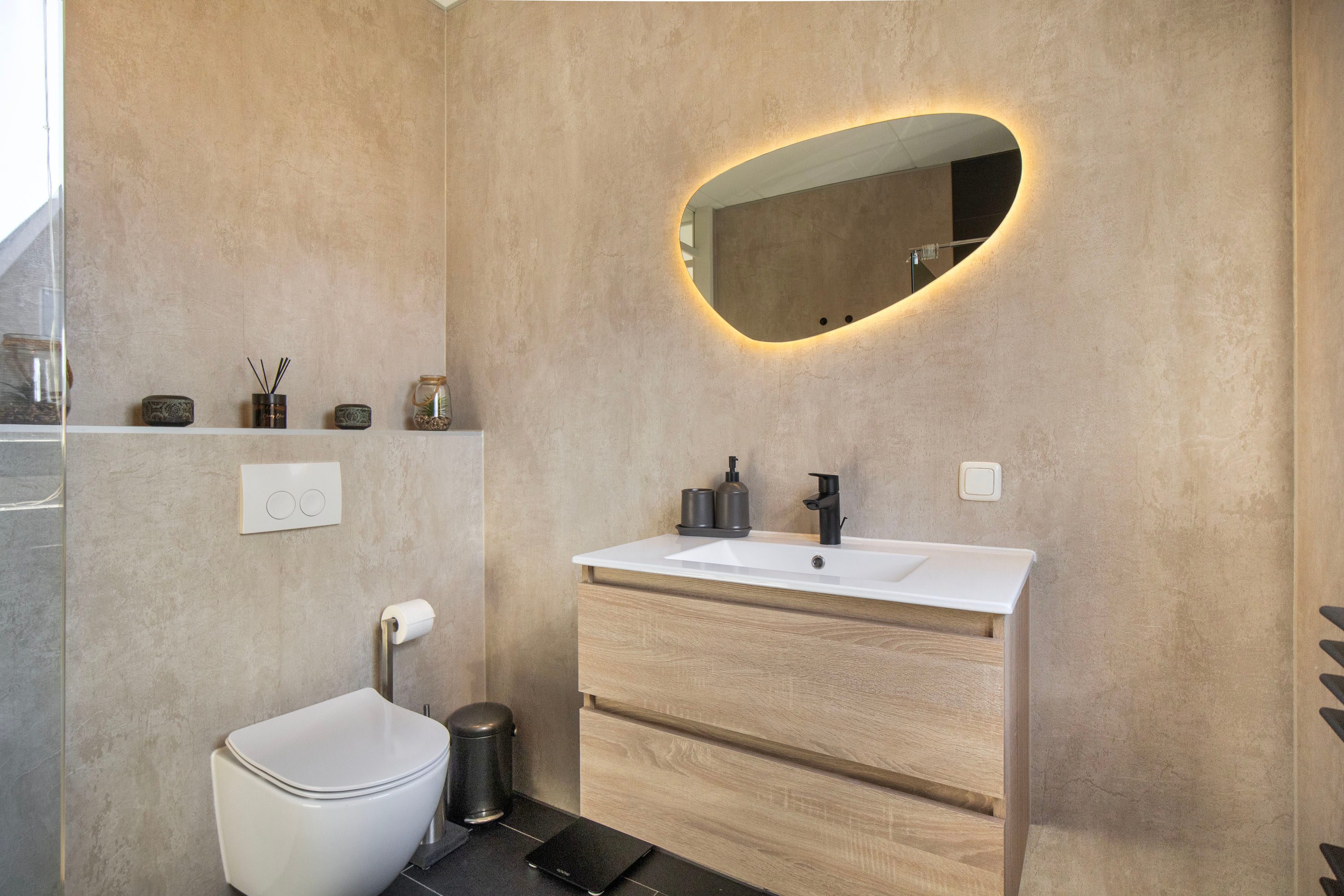 De badkamer is in 2026 deels vernieuwd en straalt een moderne, luxe hotelsfeer uit. De combinatie van de rustige wanden, een zwart afgewerkt wastafelmeubel en een stijlvol verlichte designspiegel geeft de ruimte een eigentijds karakter. De inloopdouche is voorzien van een glazen wand en een zwarte regendouche, terwijl het tweede toilet extra comfort biedt. Een groot raam zorgt voor volop daglicht én natuurlijke ventilatie. Het donkere tegelwerk op de vloer contrasteert mooi met de lichte afwerking van de muren, wat de badkamer een strakke, hoogwaardige uitstraling geeft.