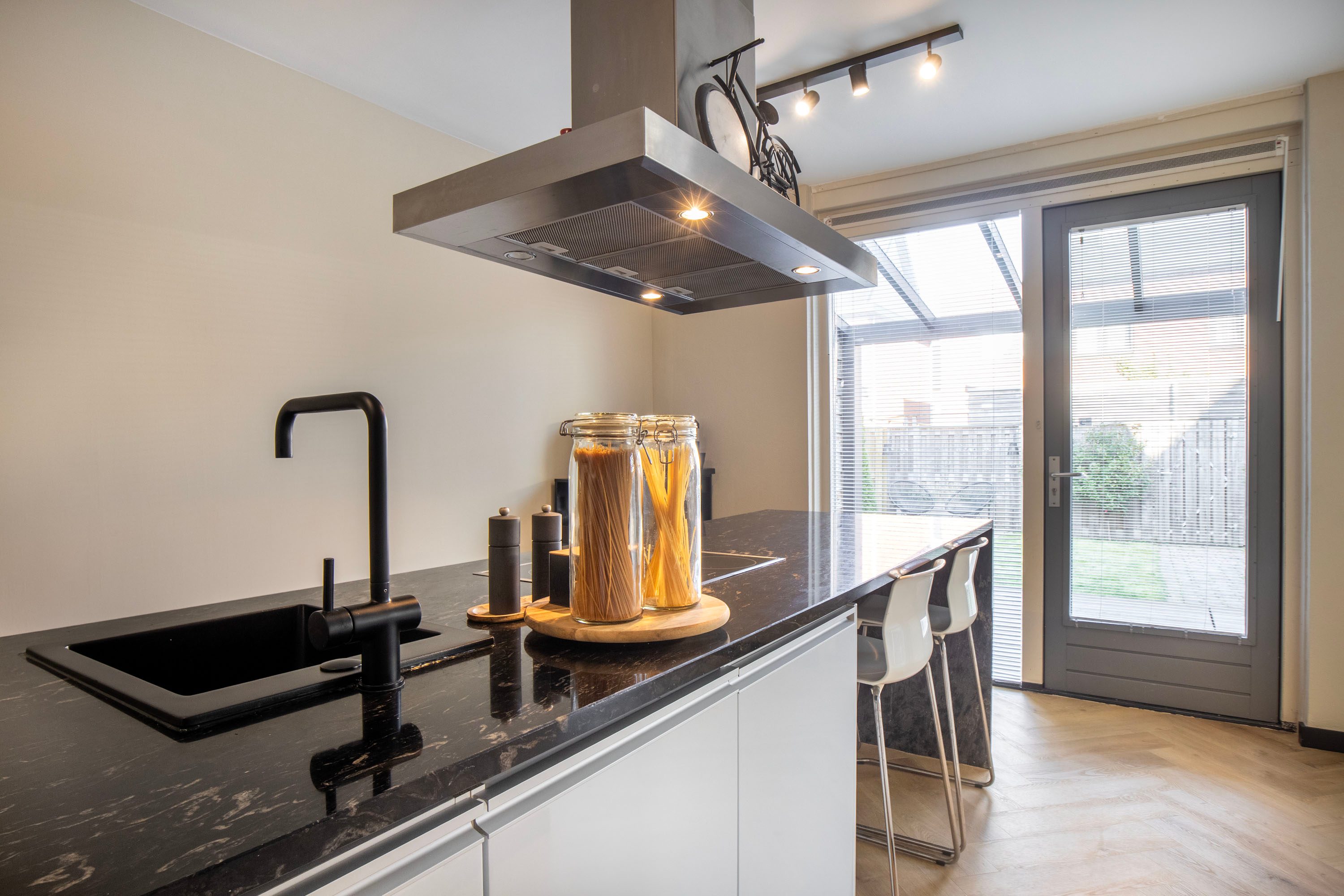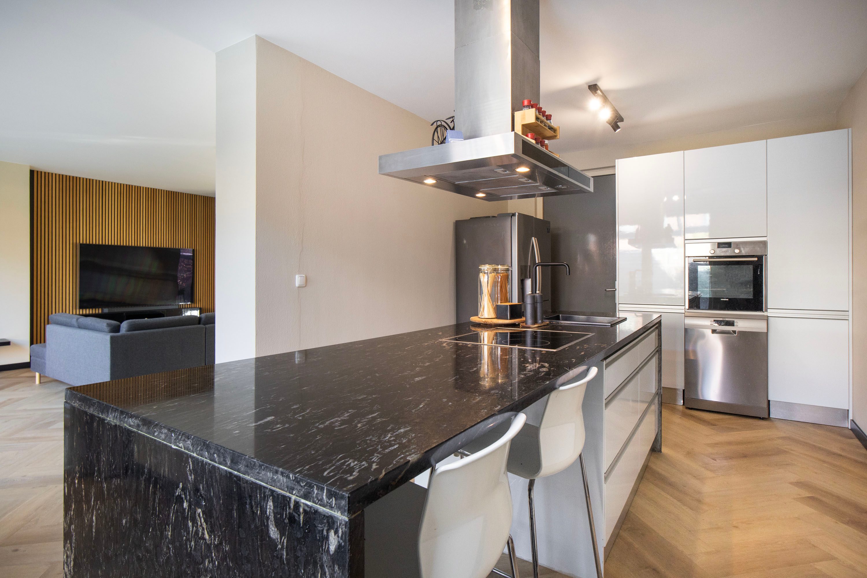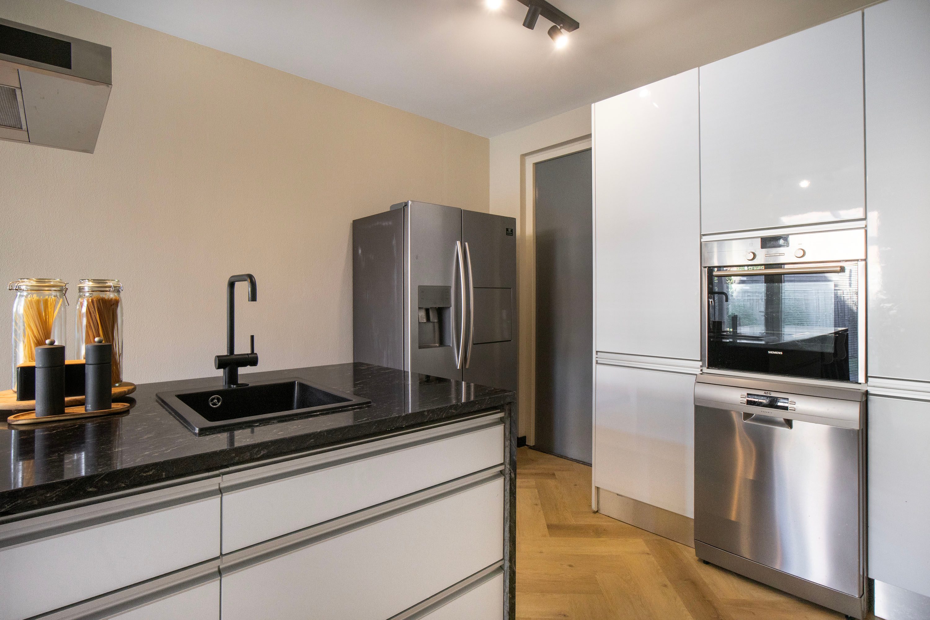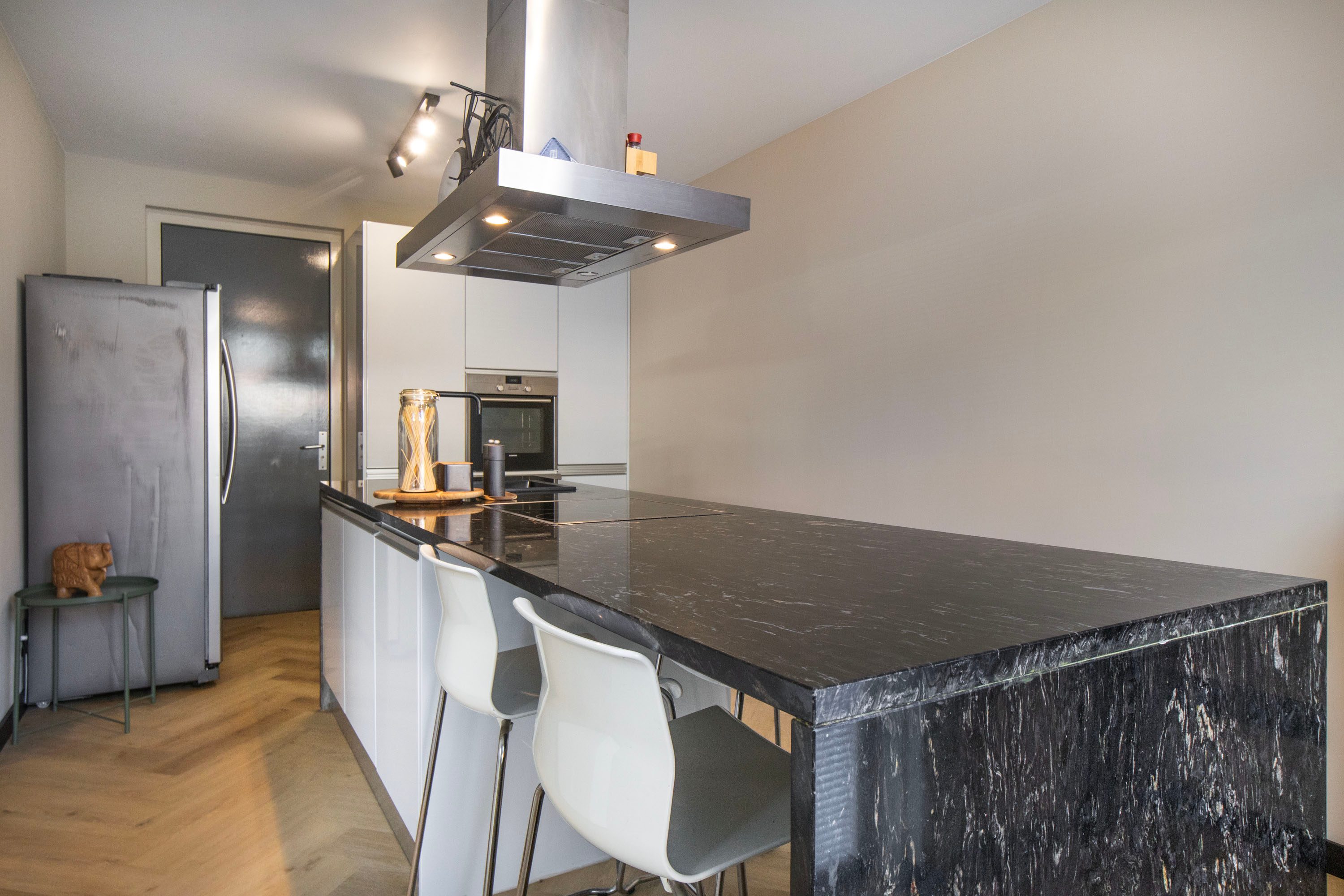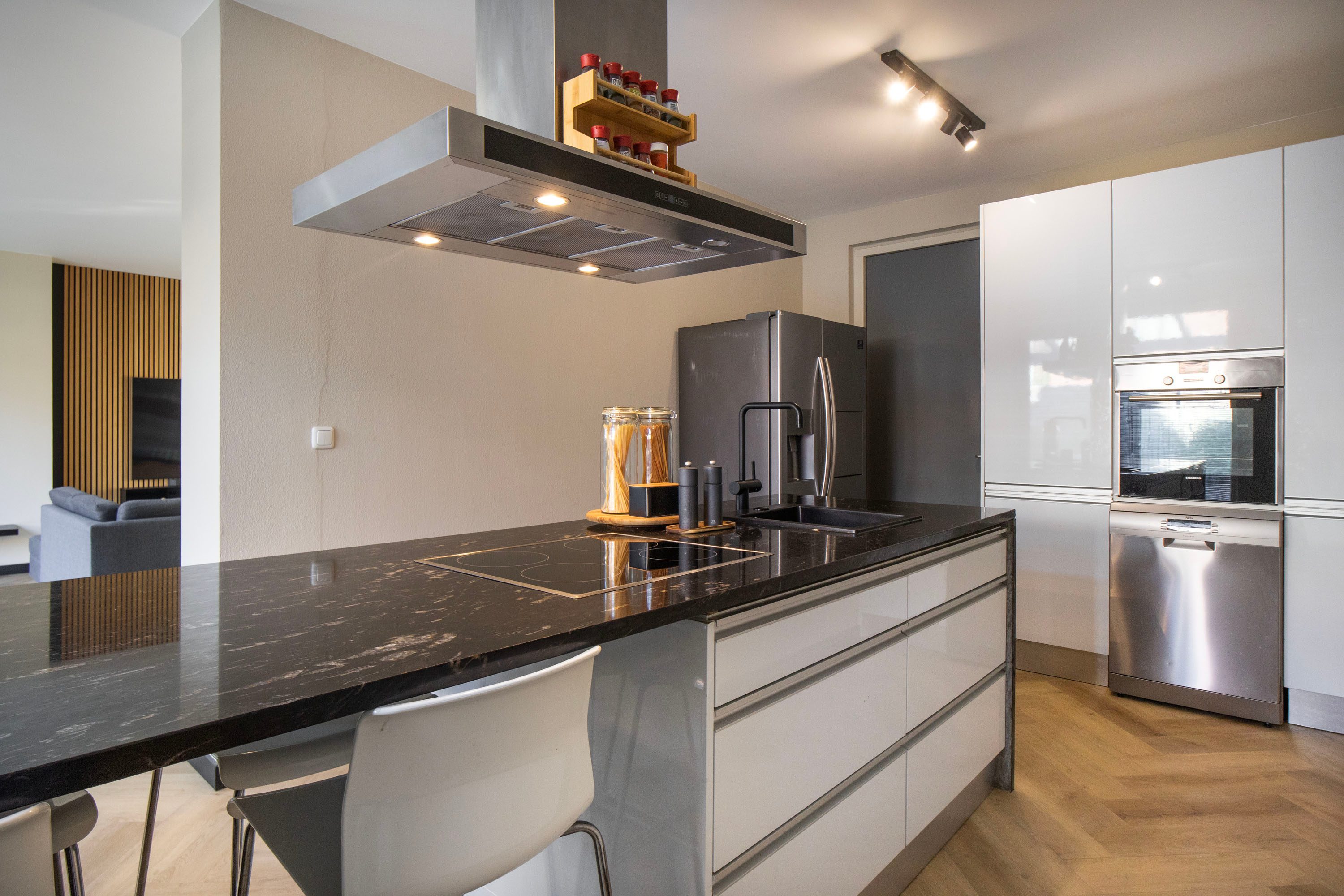 De halfopen keuken ligt aan de zijkant van de woning en vormt een fijne, overzichtelijke kookruimte. Het kookeiland, de Siemens apparatuur en het gezellige barretje maken dit een heerlijke plek om te koken én te genieten. De keuken beschikt over praktische opbergruimte, en biedt bovendien directe toegang tot de tuin.