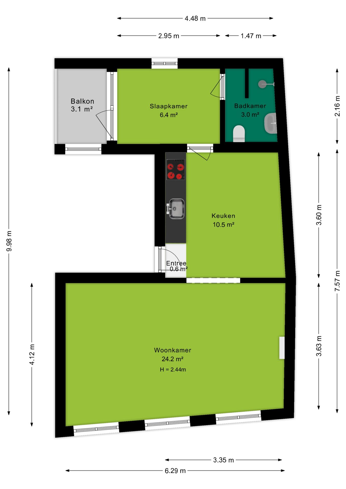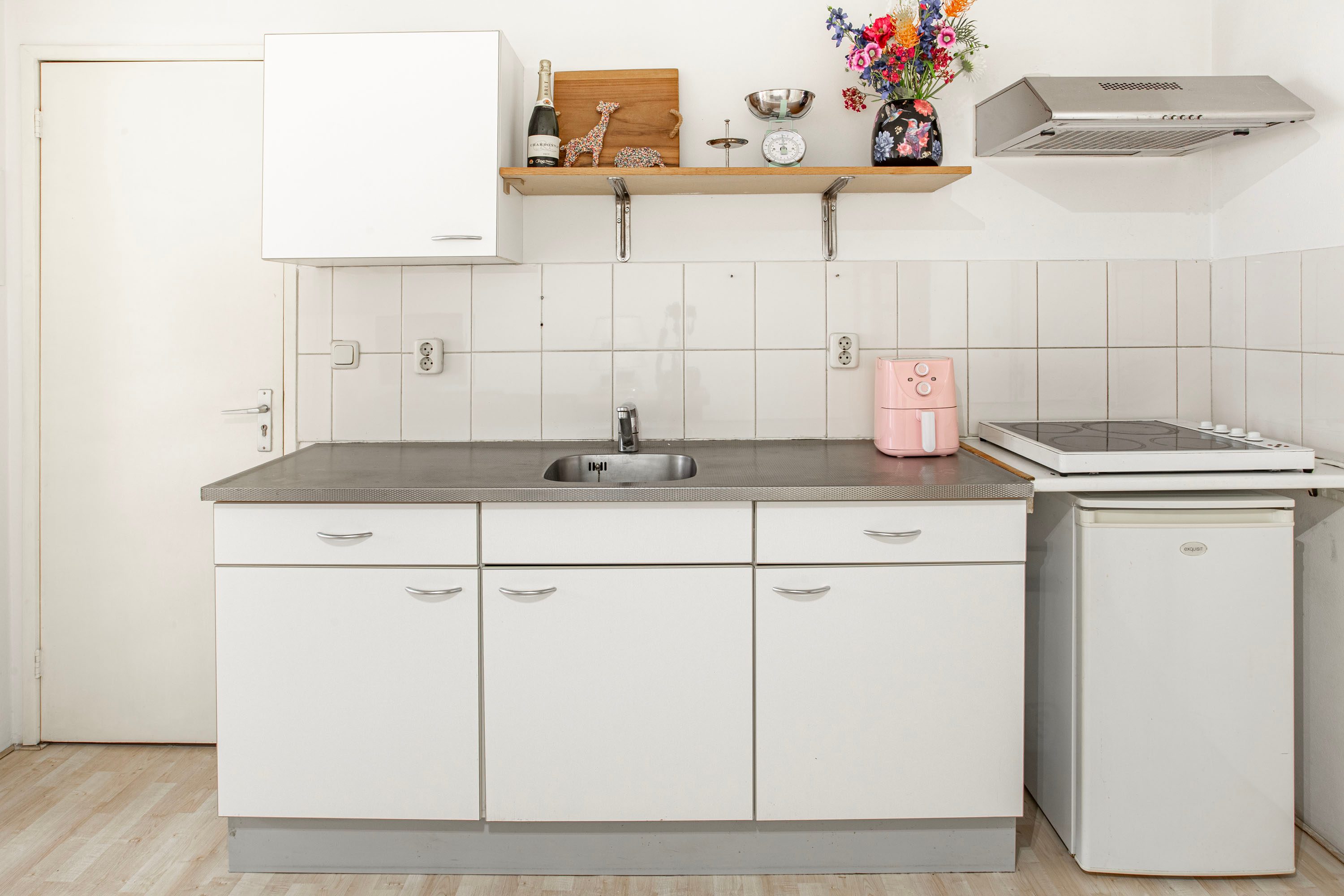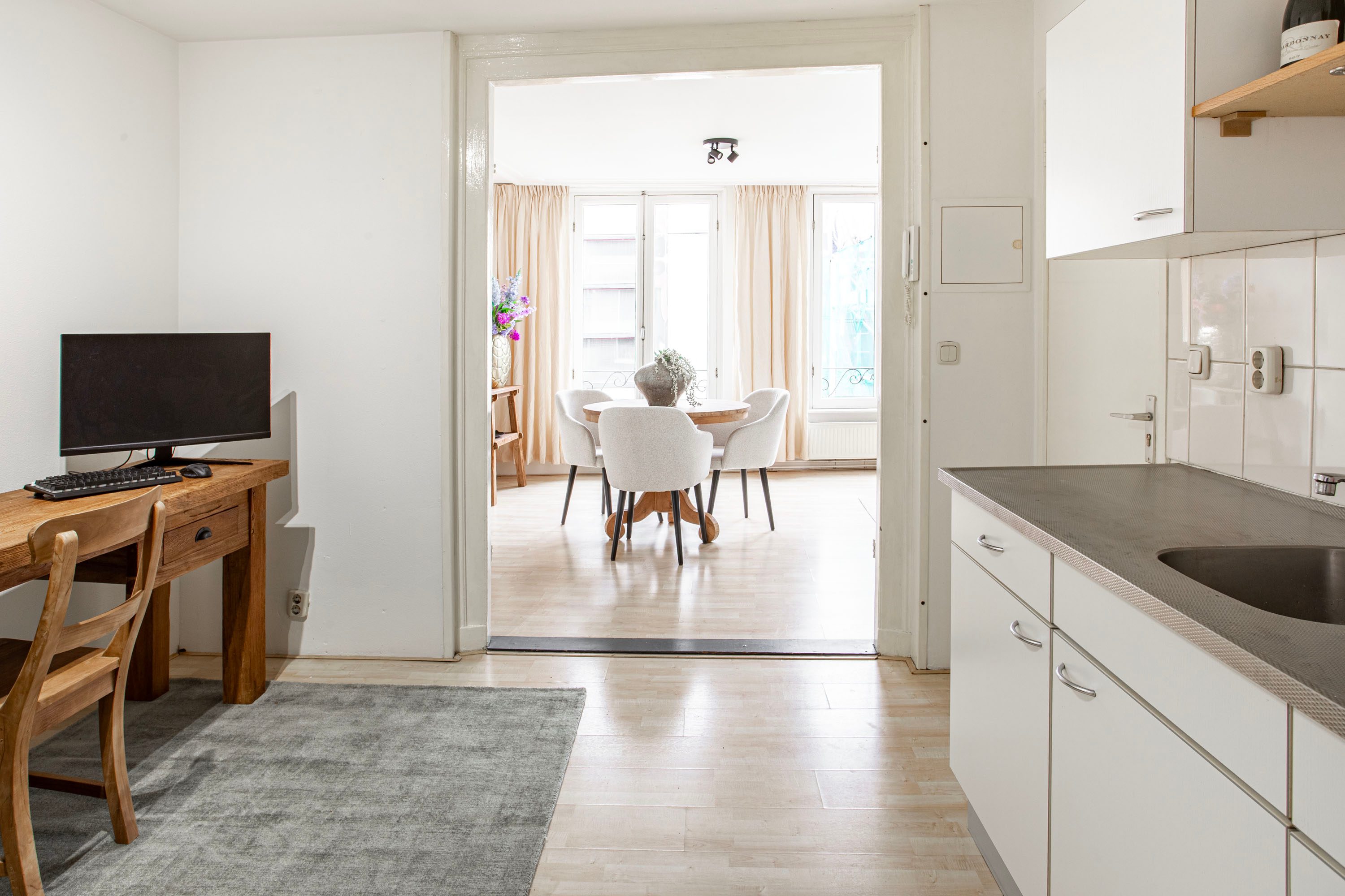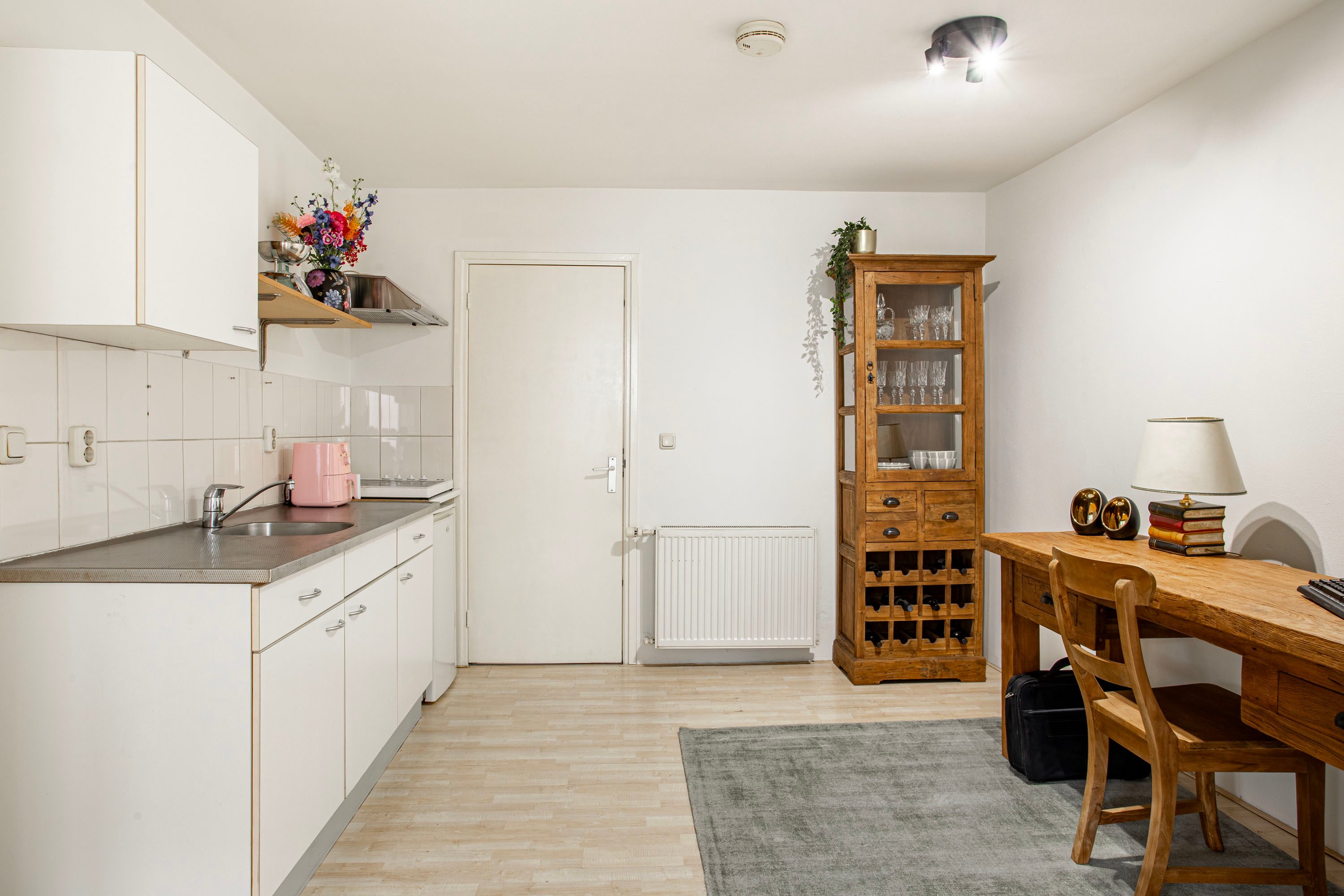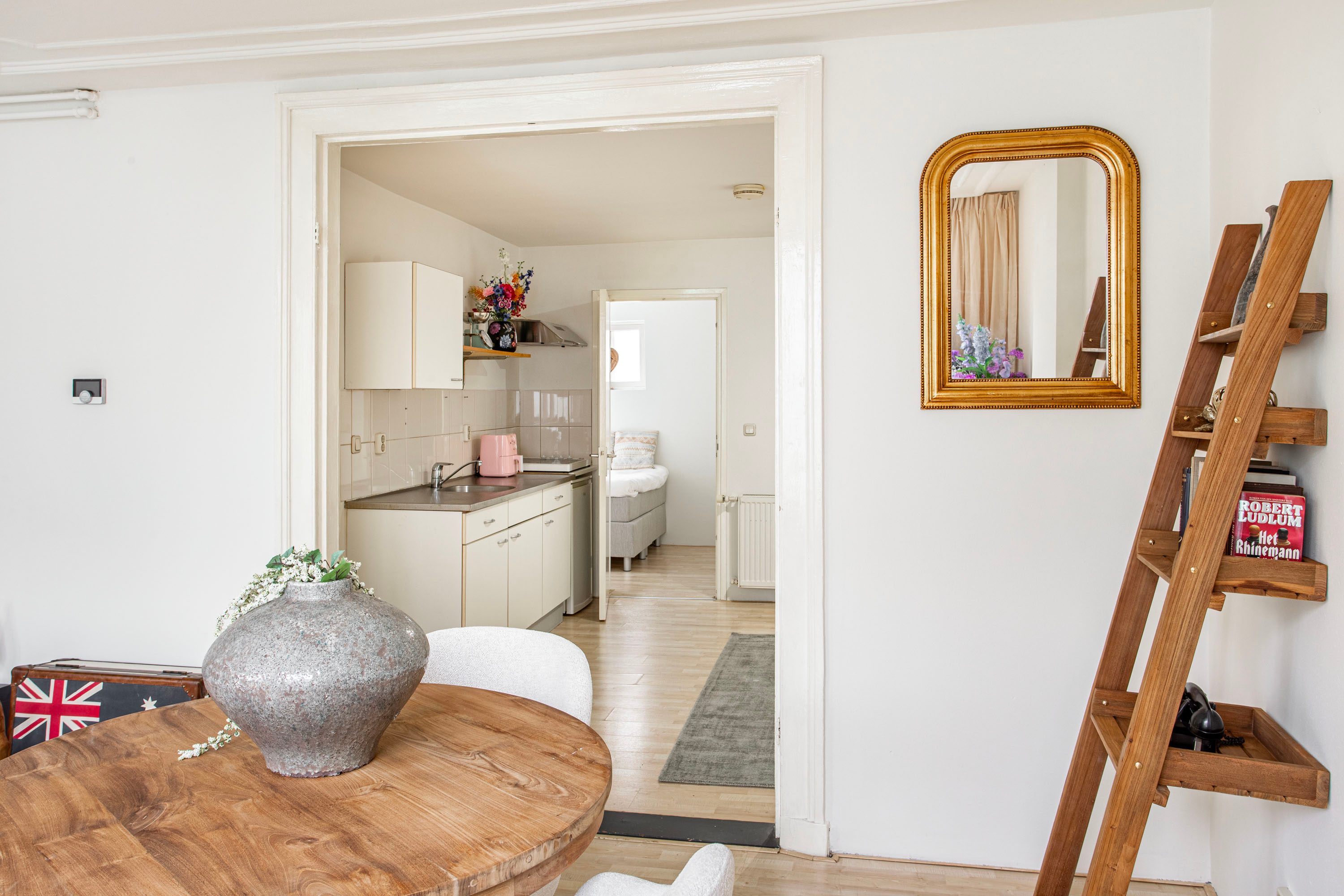 Via de entree kom je binnen in de woning, waar je direct toegang hebt tot de keuken. De lichte, praktisch ingerichte keuken is voorzien van een kookplaat, afzuigkap en spoelbak. Vanuit deze ruimte bereik je zowel de woonkamer als de slaapkamer. Aan de voorzijde van de woning ligt de ruime woonkamer (ca. 24 m²) met een hoog plafond. De grote ramen zorgen voor een overvloed aan daglicht, wat de ruimte een open en aangename sfeer geeft. Er is volop plek voor een comfortabele zithoek én een eettafel.