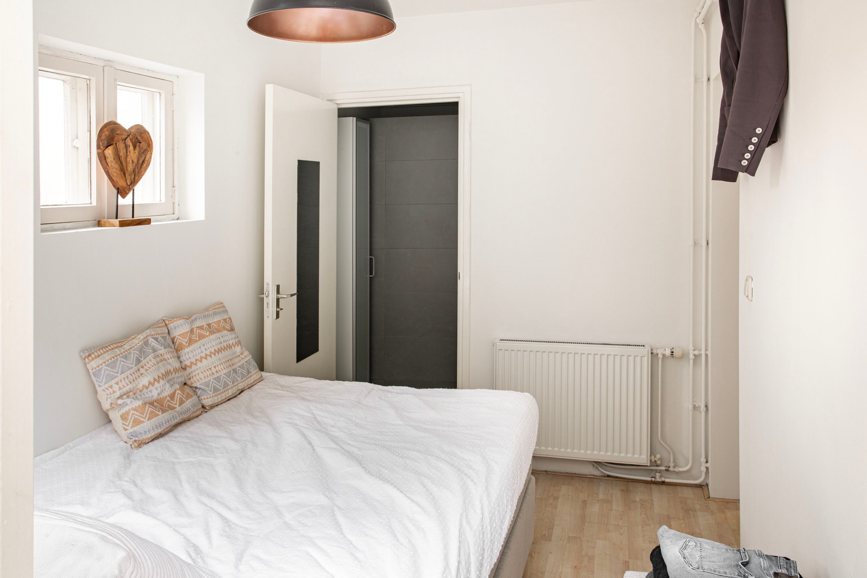 De slaapkamer bevindt zich aan de rustige achterzijde van het appartement. Deze kamer biedt voldoende ruimte voor een tweepersoonsbed en geeft direct toegang tot het balkon op het oosten. Hier kun je fijn genieten van een kopje koffie of thee in de ochtendzon. De badkamer is in 2020 gerenoveerd, efficiënt ingedeeld en uitgerust met een douche, toilet en wastafel. Het geheel beschikt over een fijn karakter en een unieke uitstraling.