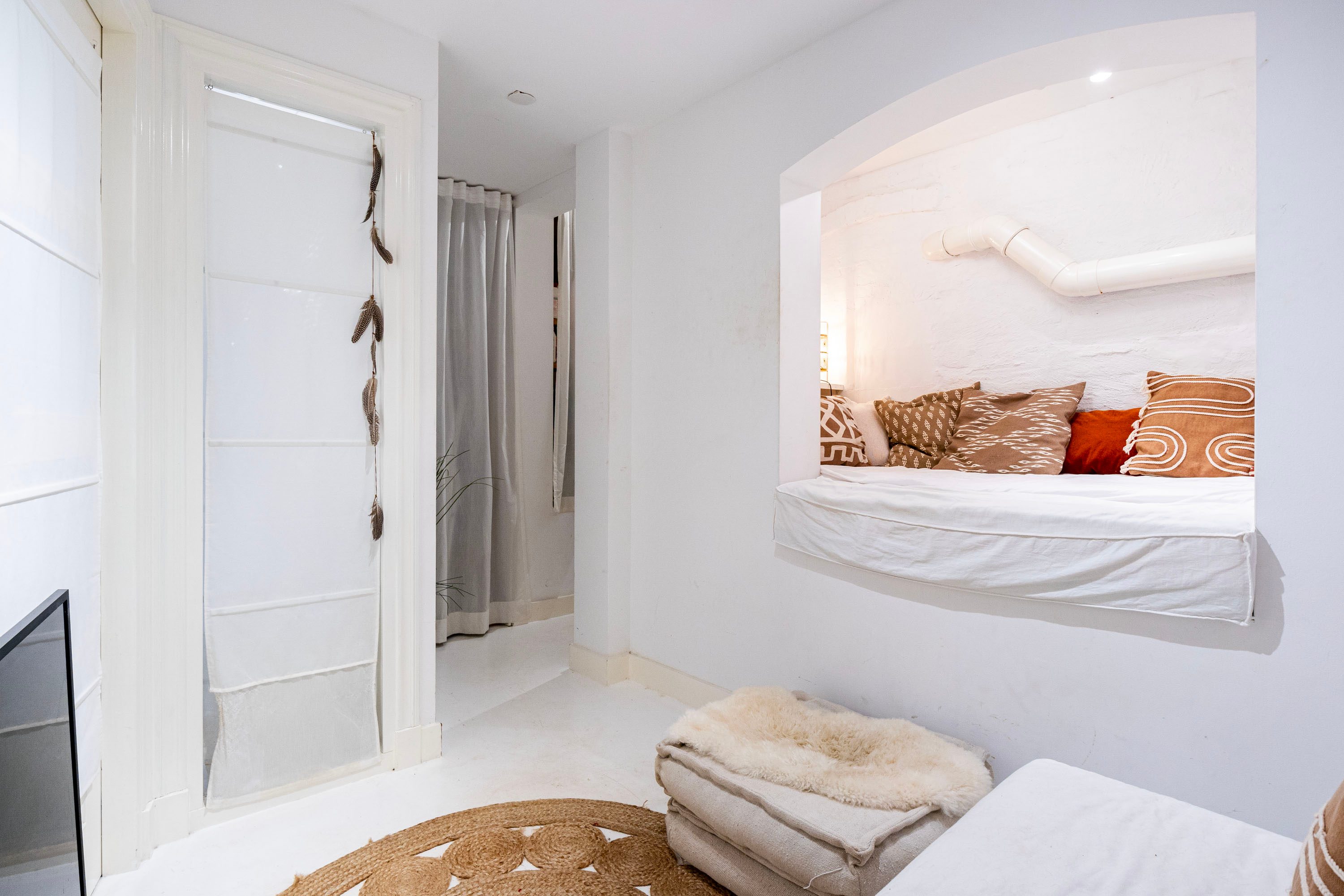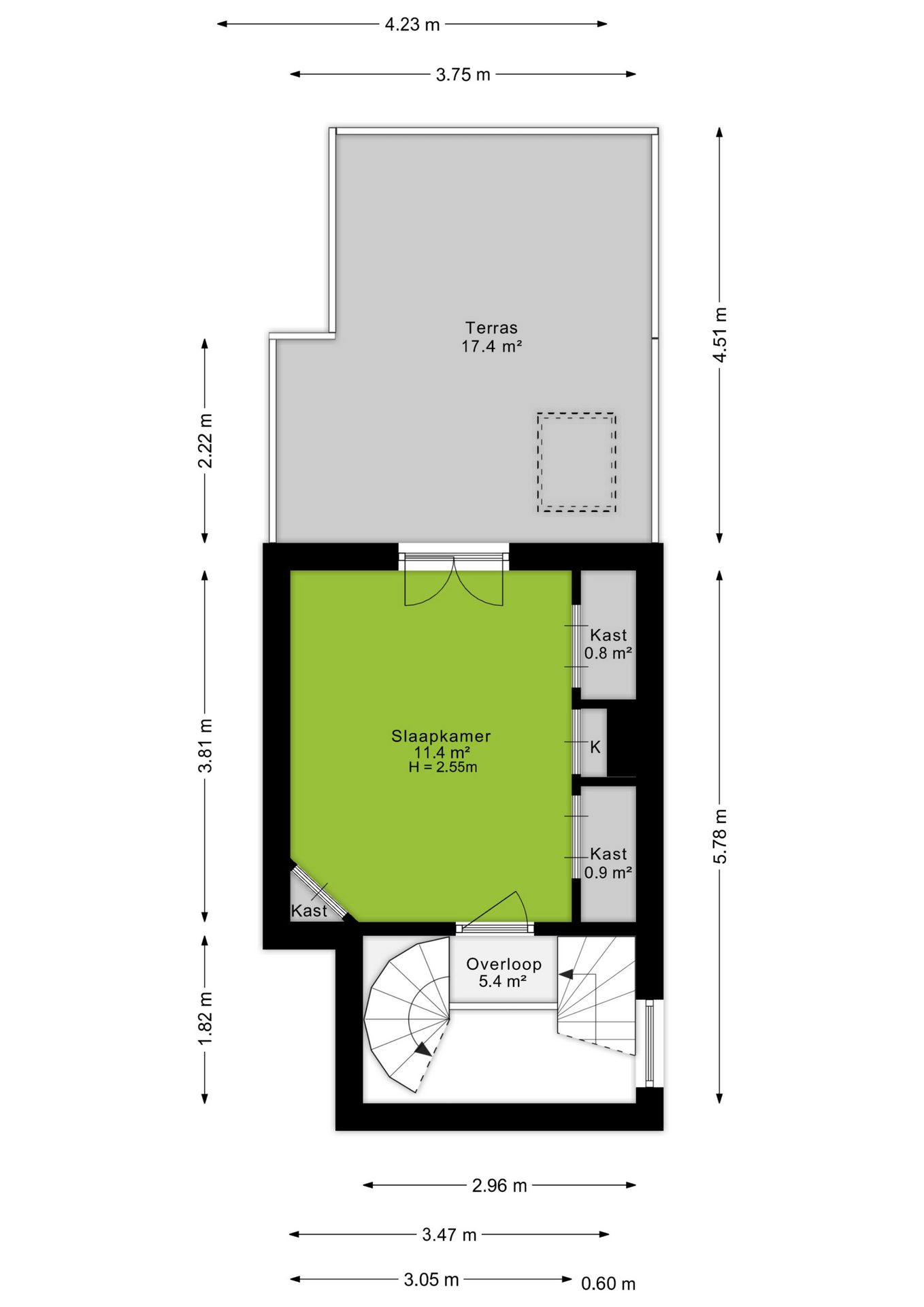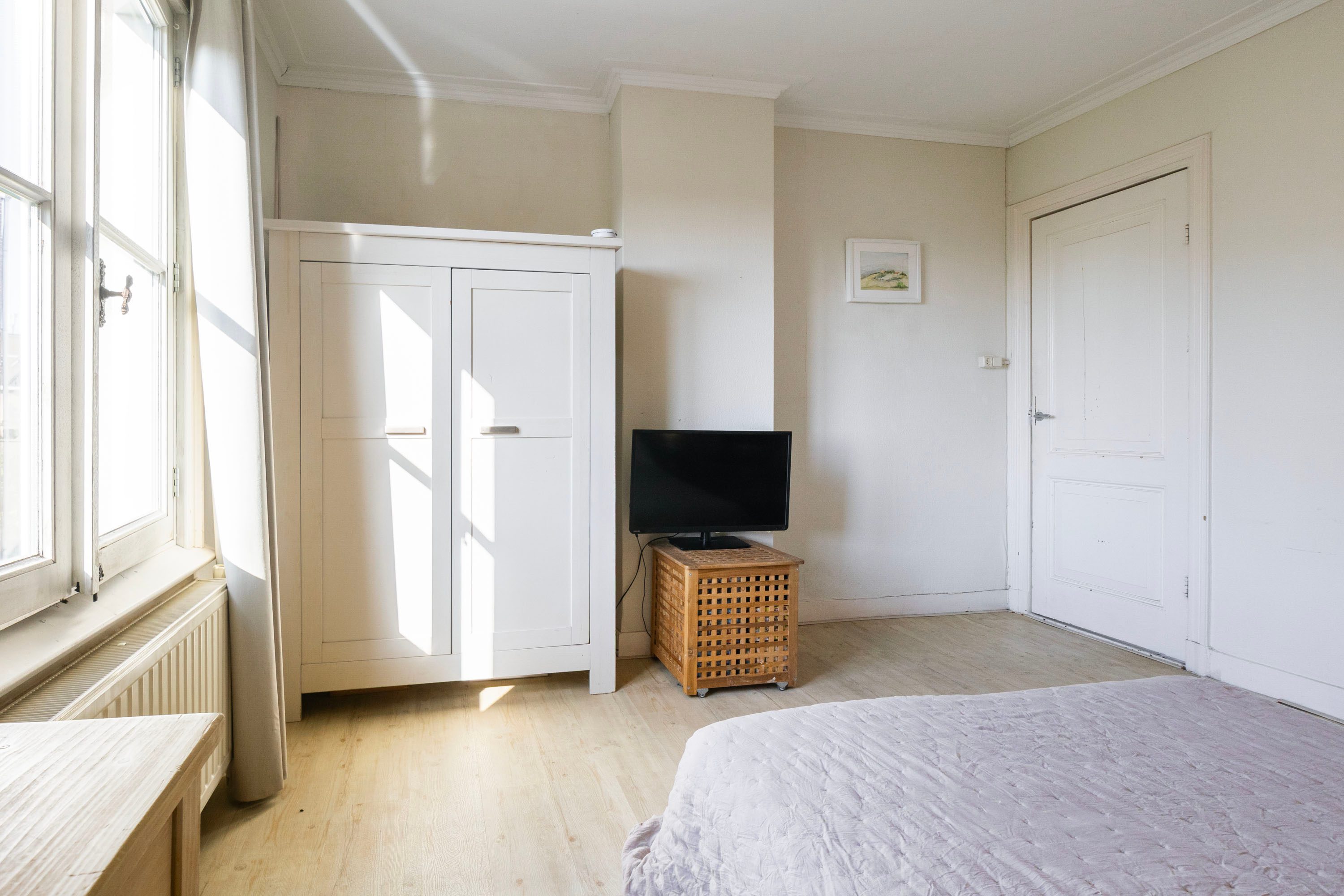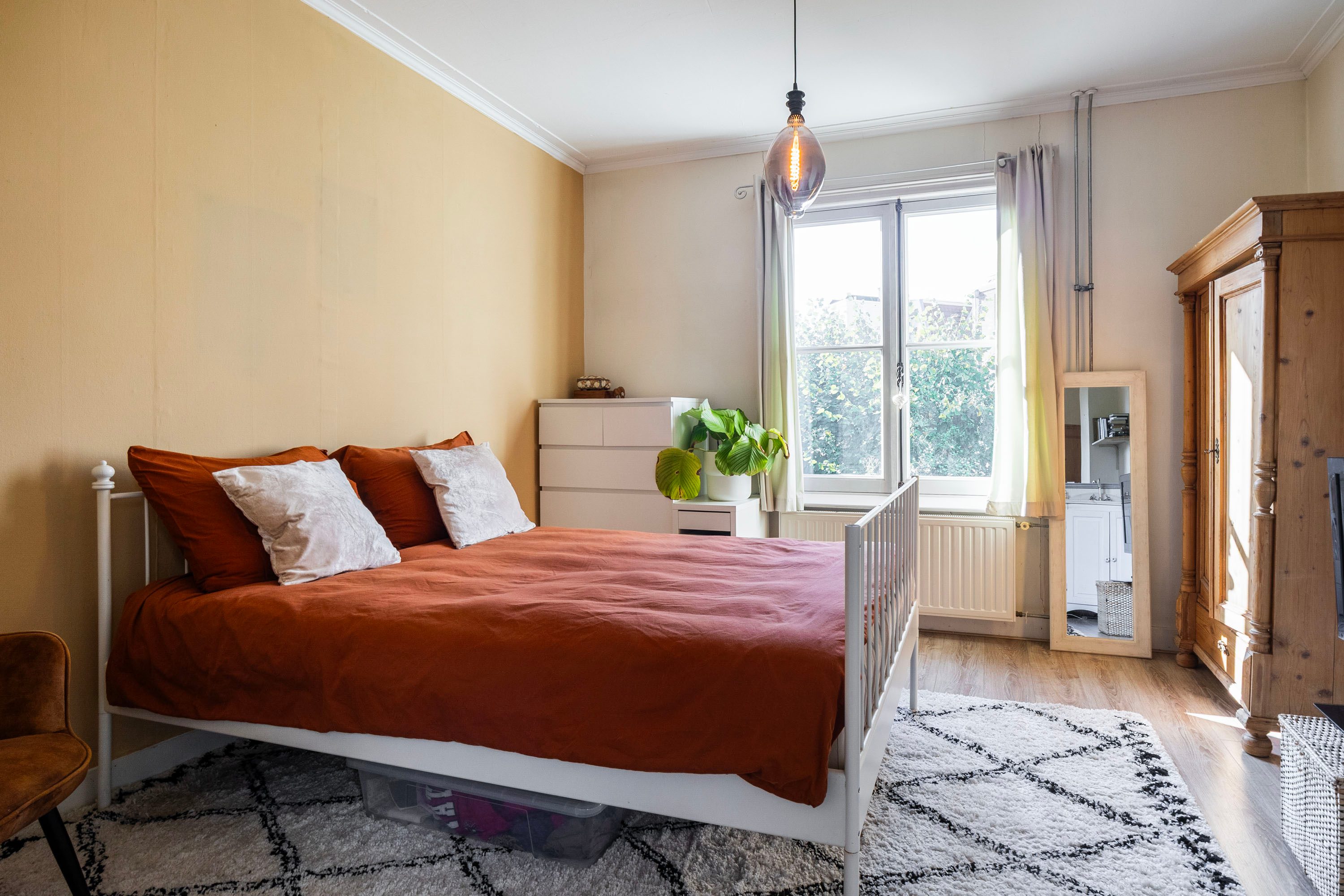 Op de eerste verdieping vind je een slaapkamer van circa 11 m², die is voorzien van een sfeervolle houten vloer en een praktische ingebouwde kastenwand. De ruimte wordt extra bijzonder door de dubbele deuren die toegang bieden tot het terras, waardoor binnen en buiten prachtig in elkaar overlopen. Het hoge plafond versterkt het gevoel van ruimte en draagt bij aan de charmante uitstraling van de kamer.