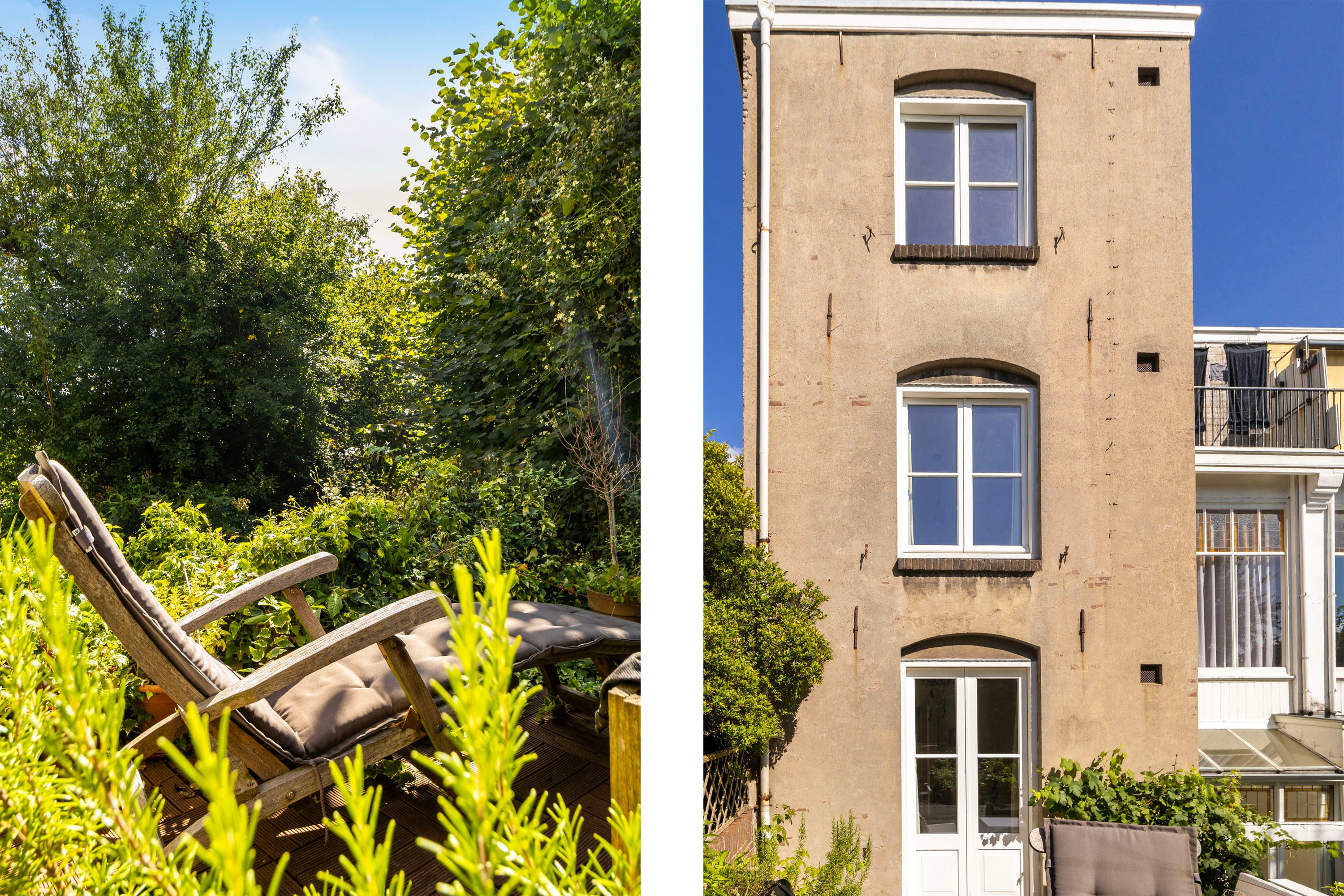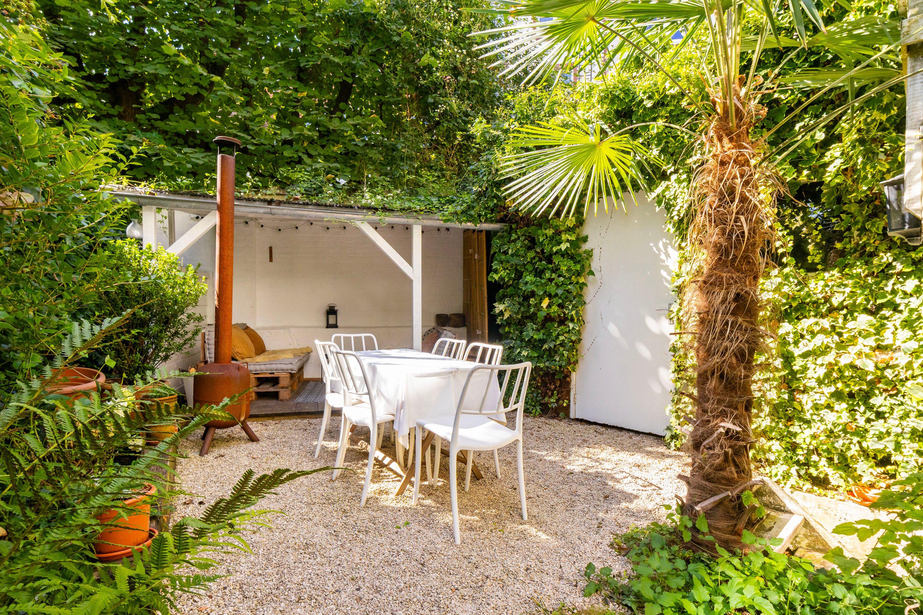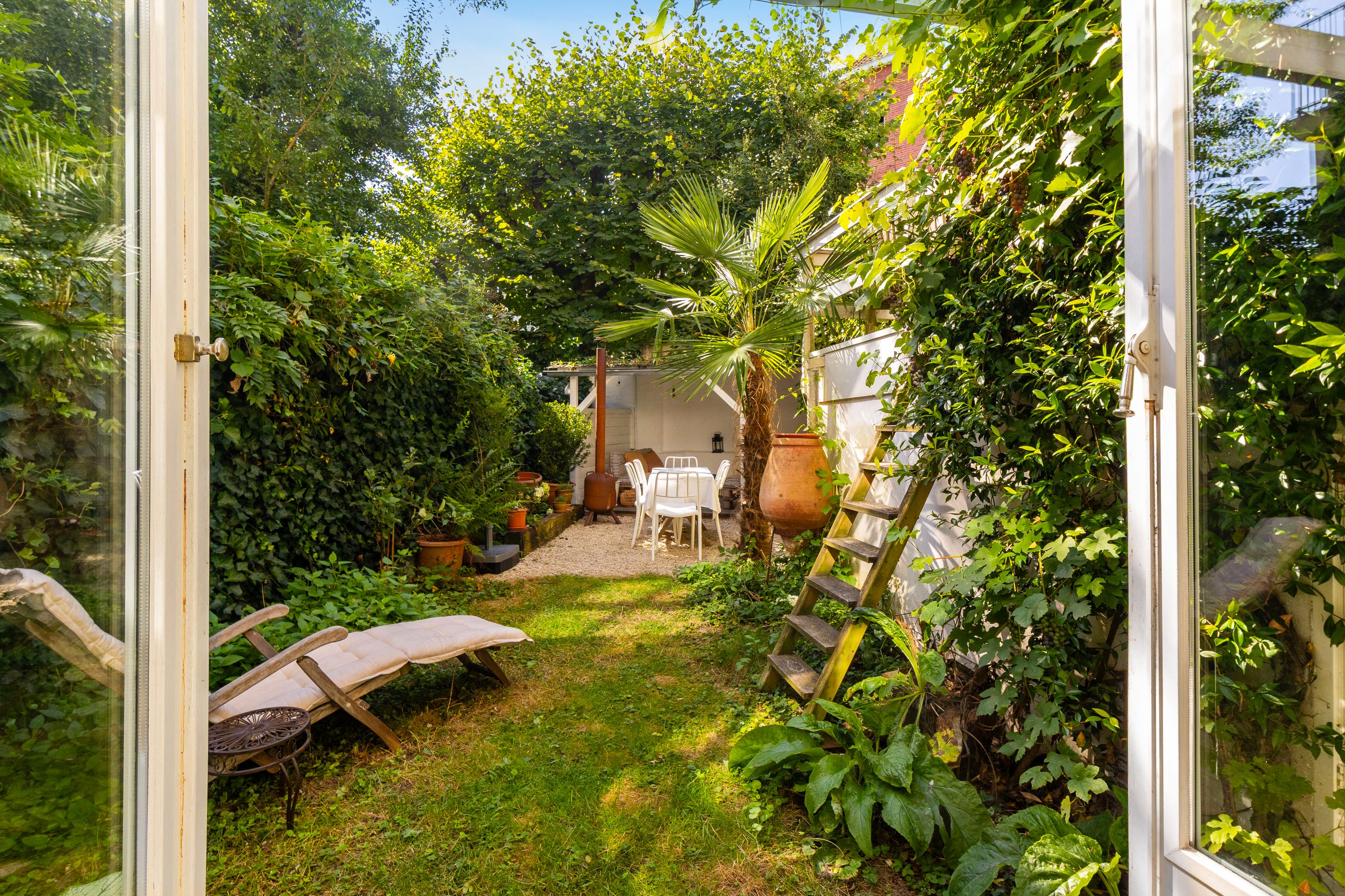 De achtertuin is een groene oase die volop privacy biedt. Dankzij de gunstige ligging op het zonnige zuiden kun je kiezen voor een plek in de zon of juist in de schaduw. Onder de sfeervolle veranda geniet je van lange, zwoele zomeravonden in alle rust. De praktische berging biedt voldoende ruimte voor het opbergen van tuingereedschap, kussens en andere spullen, en is ook ideaal voor het stallen van fietsen. Daarnaast is de tuin voorzien van een handige achterom, wat extra gemak toevoegt.