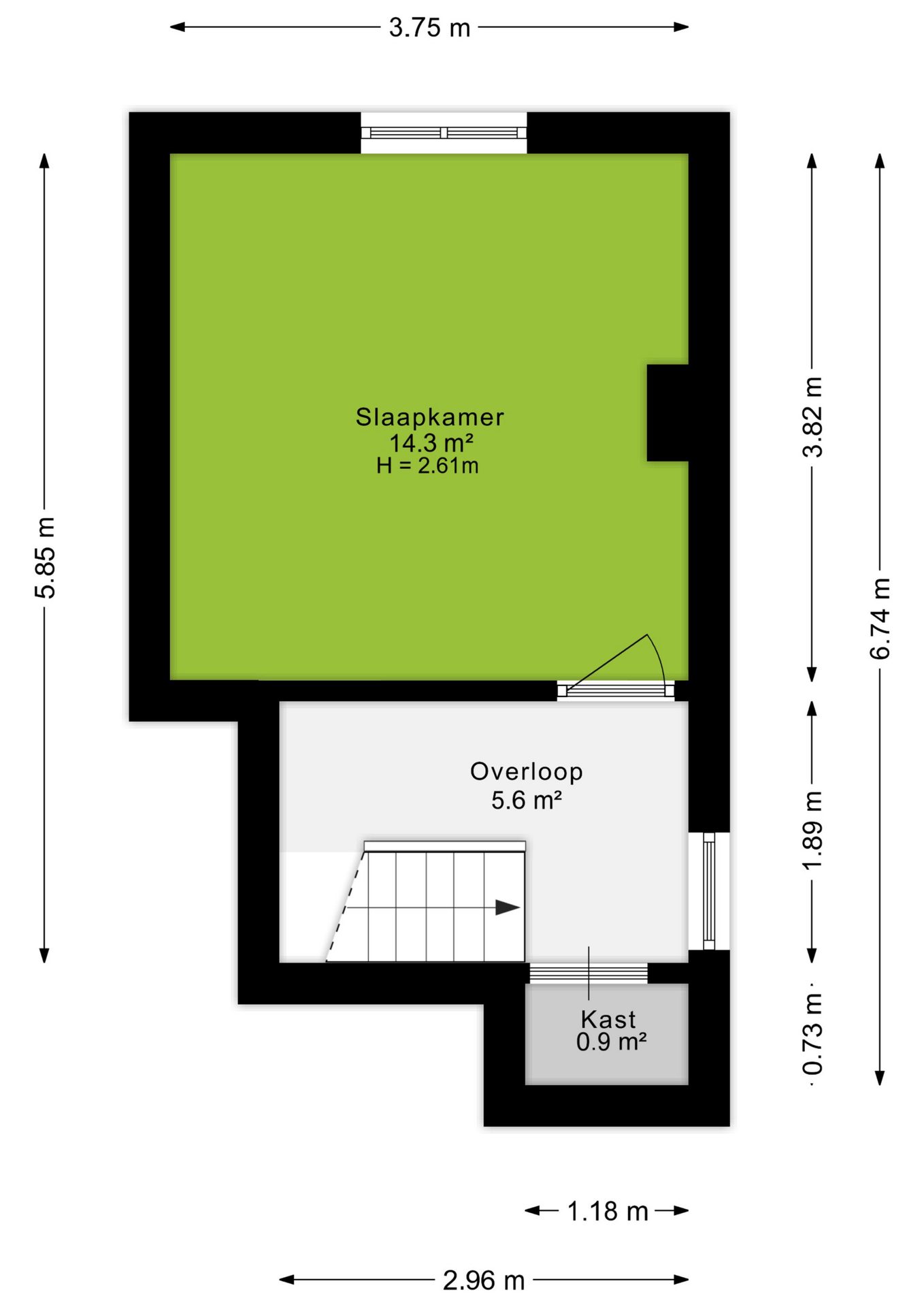 De derde verdieping geeft via de overloop toegang naar de derde slaapkamer, welke eveneens circa 14m² groot is en voorzien is van een laminaatvloer. Vanuit de overloop is er tevens toegang tot een vaste bergkast.